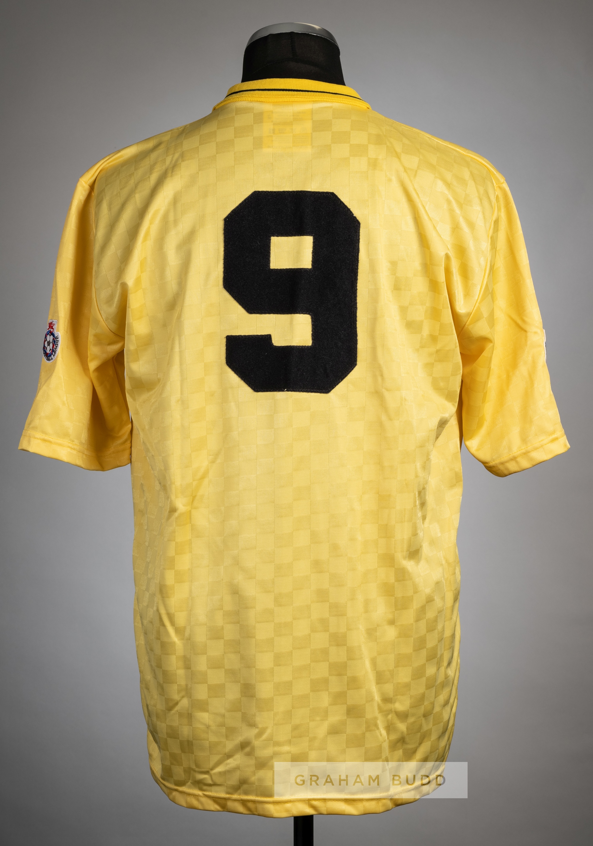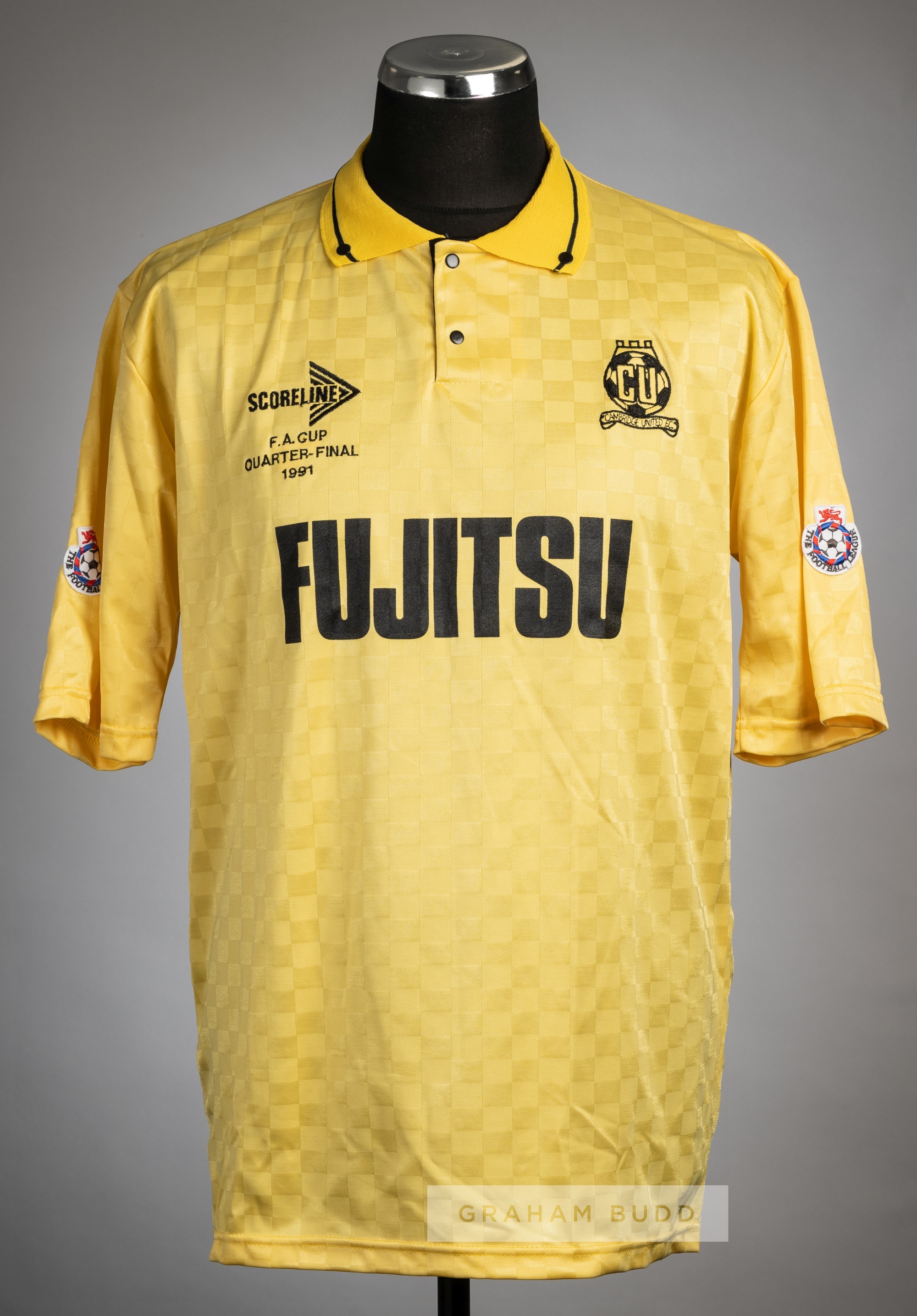 Dion Dublin yellow and black Cambridge United No.9 F.A Cup quarter-final jersey v Arsenal at Highbury, 9th March 1991, Scoreline, short-sleeved with THE FOOTBALL LEAGUE sleeve badges, embroidered FA QUARTER-FINAL 1991, club crest and sponsor logo, reverse numbered 9 Arsenal defeated Cambridge United 2-1, with Dion Dublin scoring Cambridge United's only goal. Arsenal were defeated in the Semi-finals by Tottenham Hotspur.