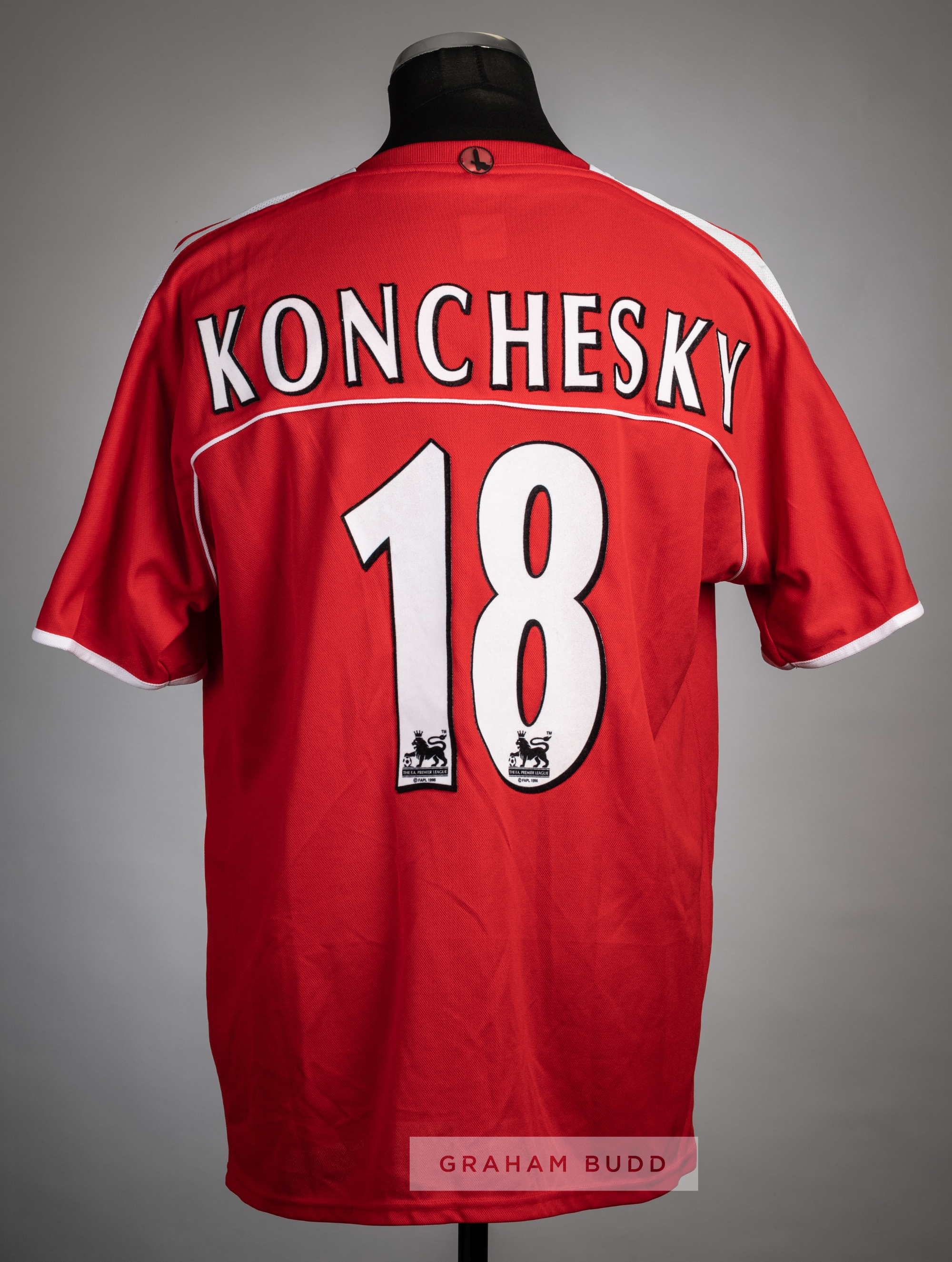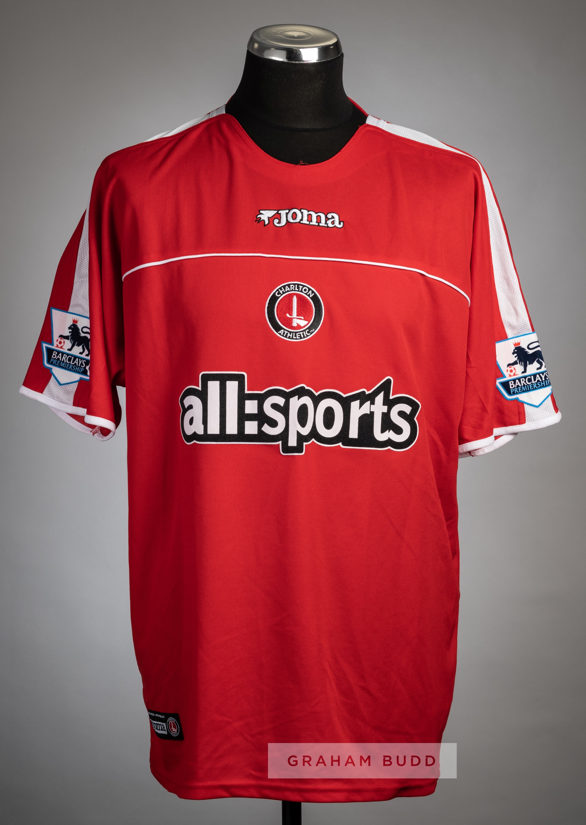 Paul Konchesky red Charlton Athletic no.18 home jersey v Arsenal at The Valley, 1st January 2005, Joma, short-sleeved with BARCLAYS PREMIERSHIP sleeve badges, embroidered club crest and Joma logo, sponsor logo, reverse lettered KONCHESKY This fixture resulted in a 3-1 win for Arsenal. Paul Konchesky played as a 64th minute substitute. Paul Konchesky played with Charlton Athletic during 1997-2005, making 149 appearances scoring five goals.