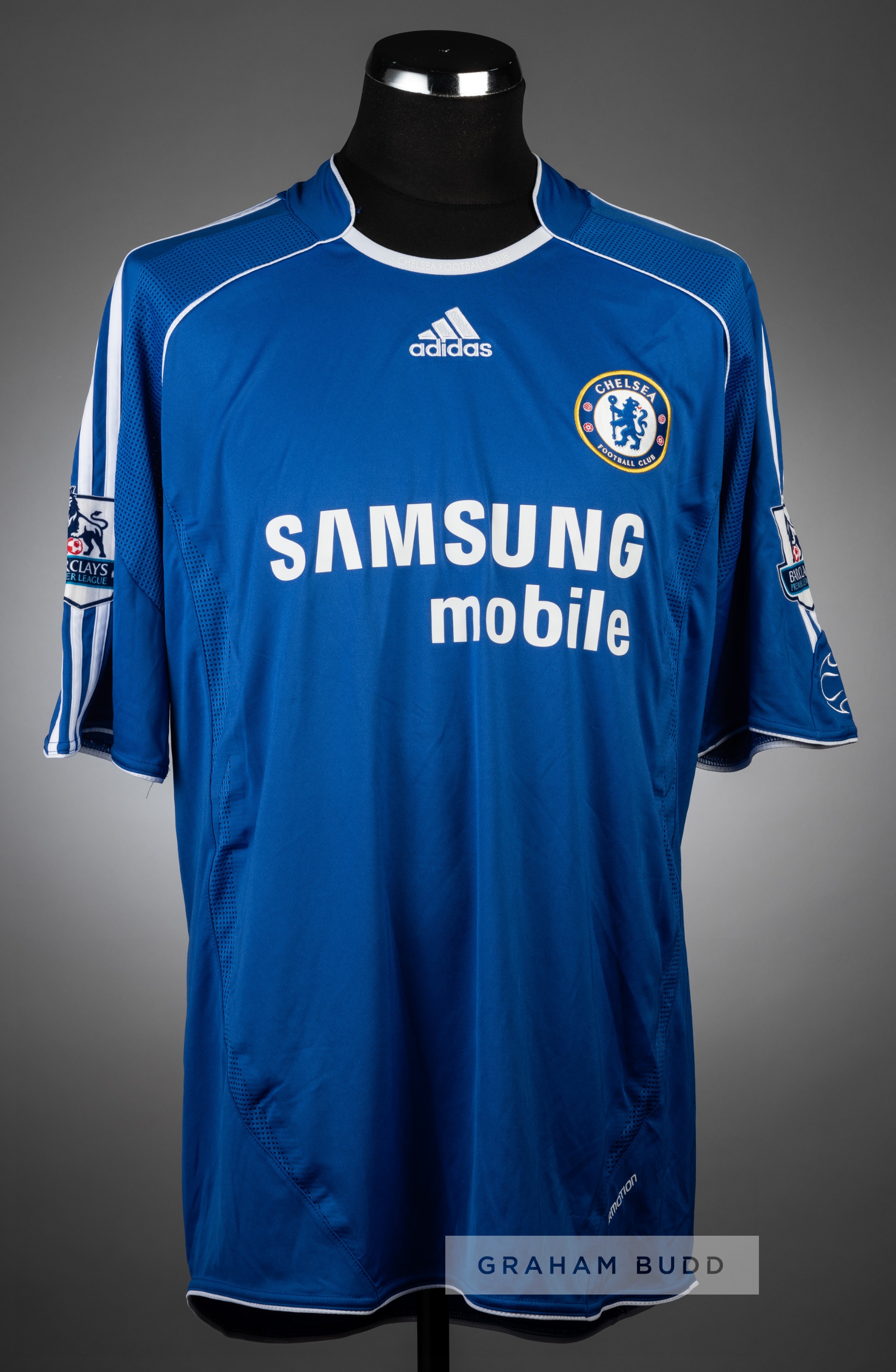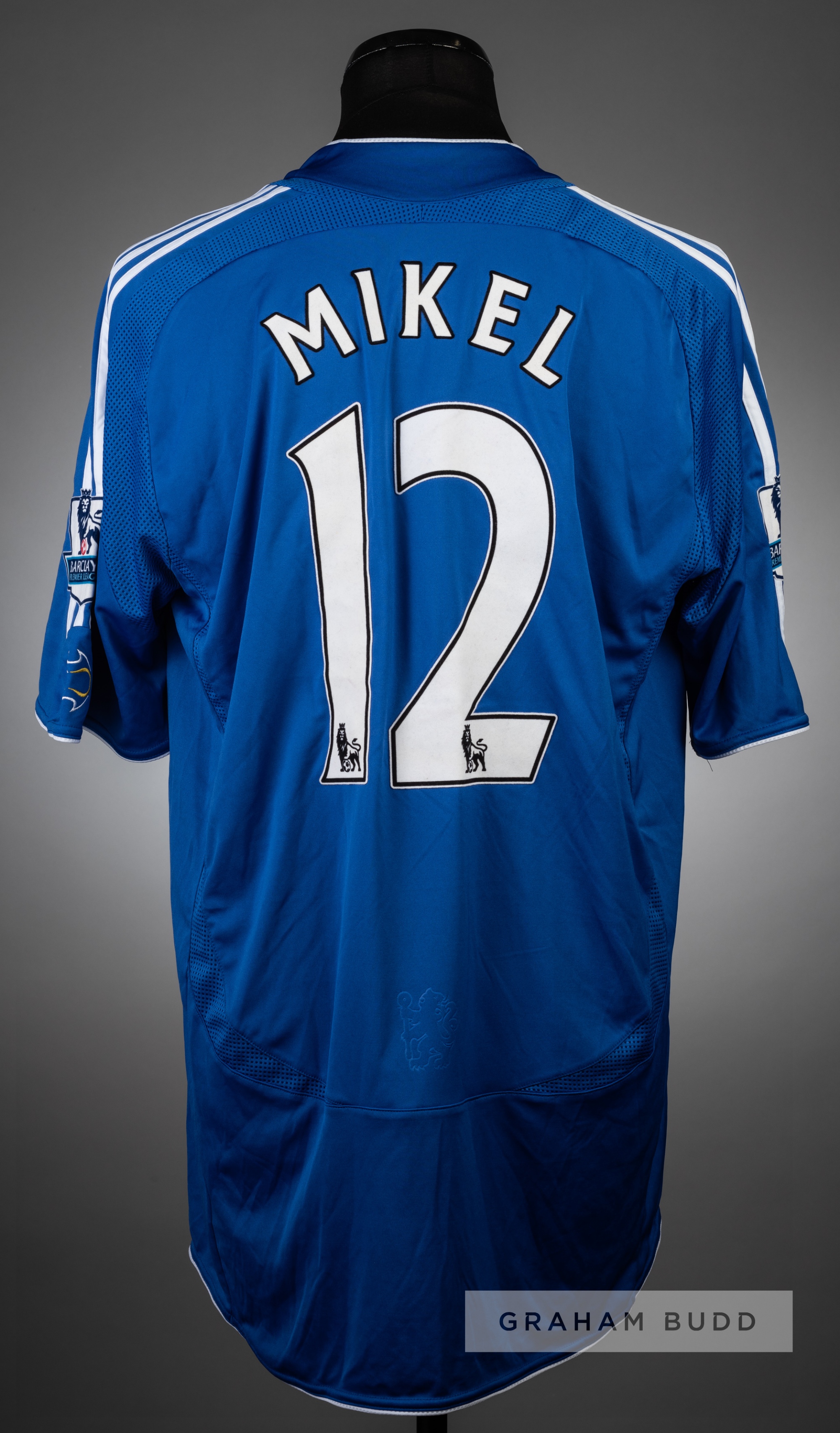 Two Chelsea FC jersey's, season's 2006-07 and 2017-18, comprising Josh Grant pale white and navy Chelsea no.53 away jersey, season 2017-18, Nike, short-sleeved with club crest and sponsor logo, reverse lettered GRANT, slight colour run throughout and Mikel John Obi blue and white Chelsea no.12 jersey, season 2006-07, Adidas, short-sleeved with BARCLAYS PREMIER LEAGUE sleeve badges, club crest and sponsor logo, reverse lettered MIKEL, (2)