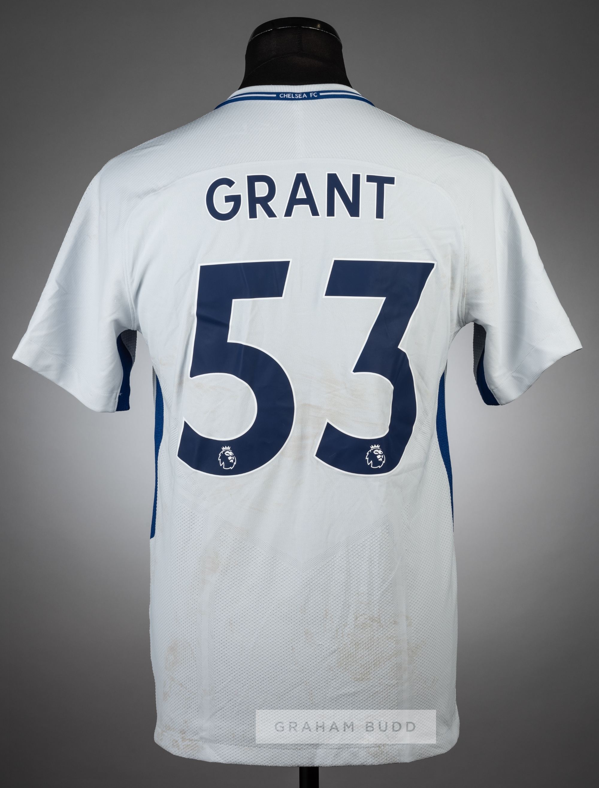 Two Chelsea FC jersey's, season's 2006-07 and 2017-18, comprising Josh Grant pale white and navy Chelsea no.53 away jersey, season 2017-18, Nike, sh