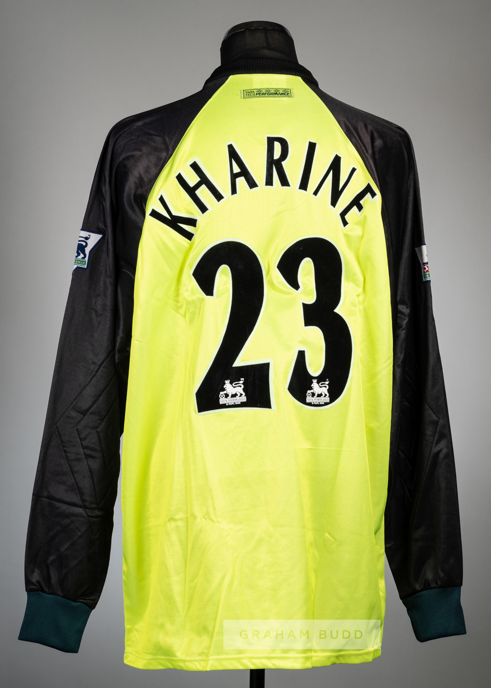 Dmitri Kharine luminous yellow & black Chelsea No.23 goalkeeper's jersey, season 1997-98, Umbro, long-sleeved, Premier League badges, reverse lettered KHARINE