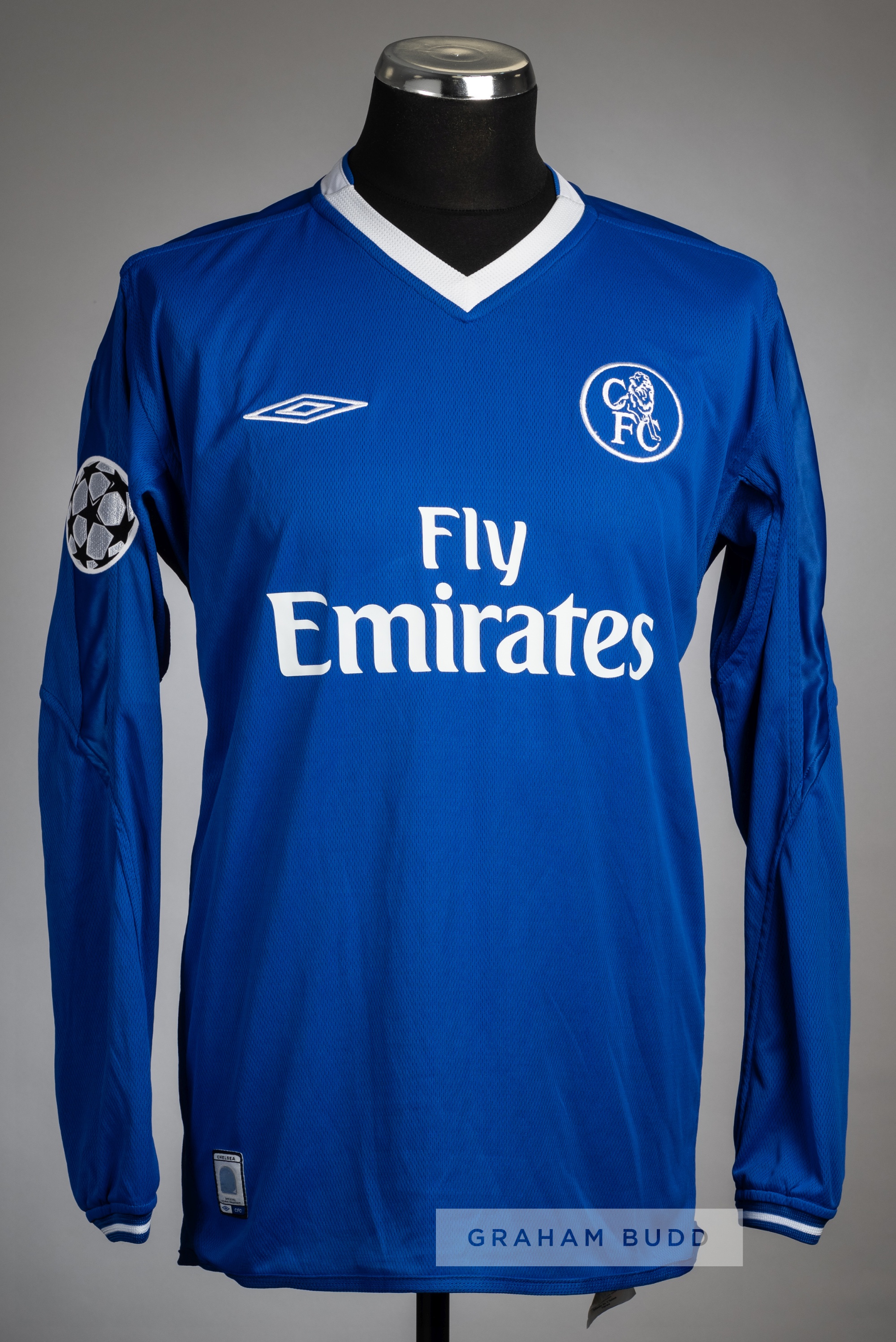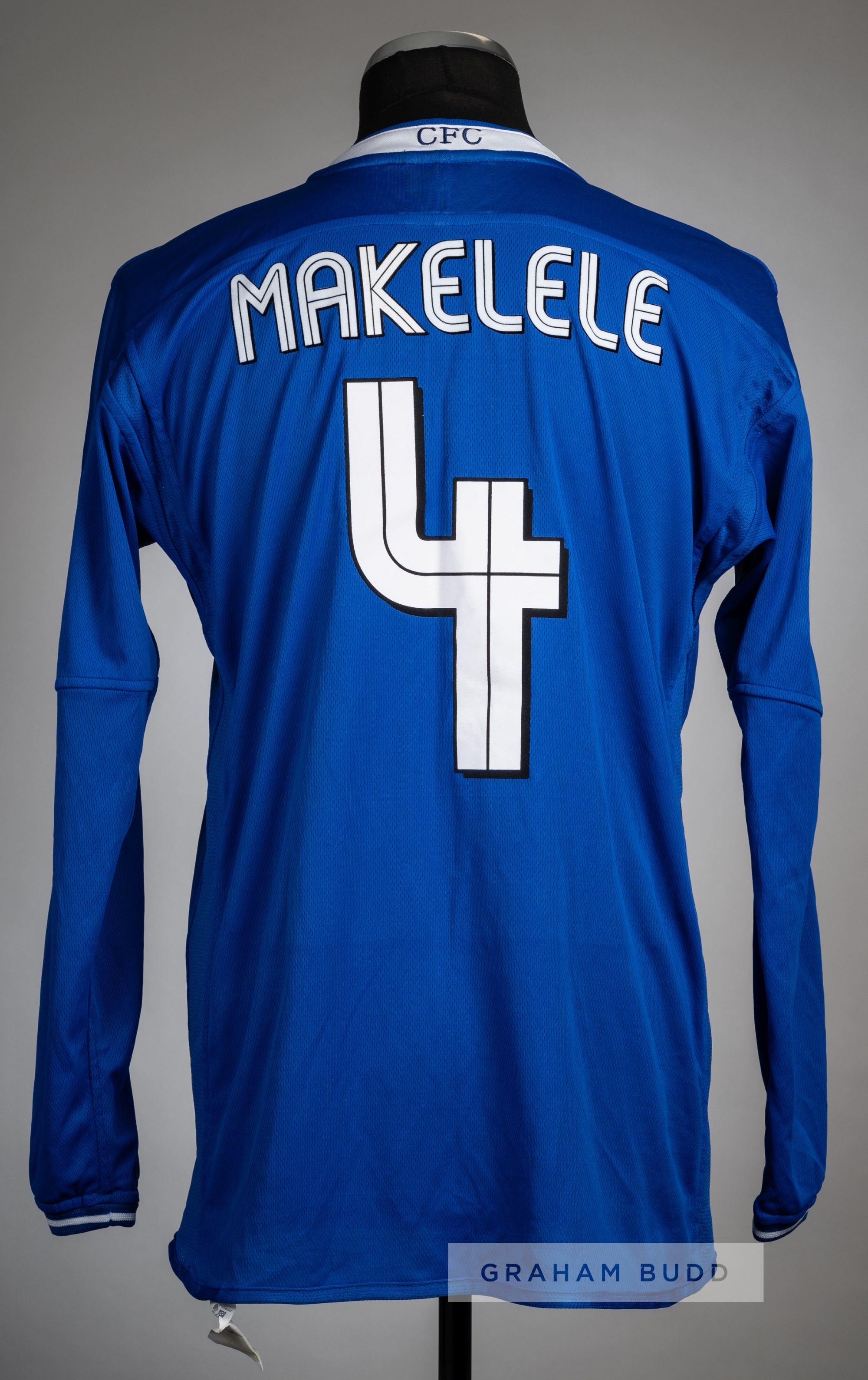 Claude Makelele blue Chelsea No.4 home jersey, season 2003-04, Umbro, long-sleeved with UEFA STARBALL sleeve badge, club crest and sponsor logo, reverse lettered MAKELELE Claude Makelele played with Chelsea during 2003-08 making 144 appearances scoring two goals.