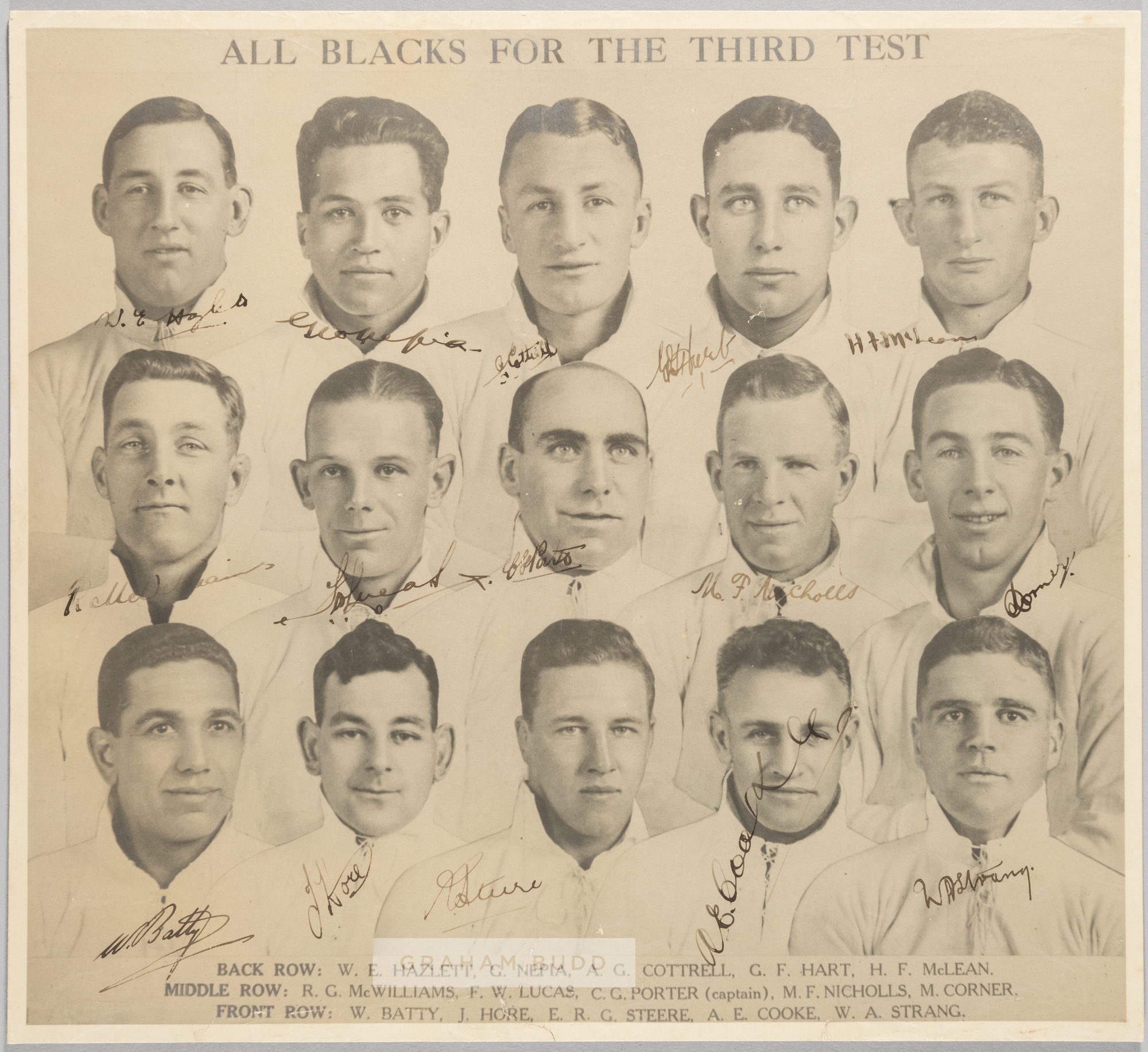 RUGBY UNION - NEW ZEALAND ALL BLACKS 1930 3rd TEST v LIONS RUGBY UNION AUTOGRAPHED PHOTOGRAPH The 1930 British Lions tour to New Zealand and Australia was the twelfth tour by a British Isles team and the fifth to New Zealand and Australia. This tour is recognised as the first to represent a bona fide British team and the first to be widely dubbed the 'Lions', after the nickname was used by journalists during the 1924 tour of South Africa. Led by England's Doug Prentice and managed by James Baxter the tour took in 28 matches, seven in Australia and 21 in New Zealand. Of the 28 games, 24 were against club or invitational teams, four were test matches against New Zealand and one was a test match against Australia. The test match results saw the Lions lose to Australia, and win only one of the four New Zealand tests. SUPERB ORIGINAL BLACK AND WHITE/SEPIA COMPOSITE PHOTOGRAPH SIZE 11 ¼” x 10 ¼” UNKNOWN PUBLISHER, LAID DOWN BORDER TO BORDER TO THE PHOTOGRAPHERS ORIGINAL STIFFENED BACKBOARD MOUNT, DEPICTING THE 1930 NEW ZEALAND ‘ALL BLACKS’ TEAM THAT DEFEATED THE BRITISH LIONS BY 15 POINTS TO 10 IN THE 3RD TEST MATCH OF THE NEW ZEALAND LEG OF THE 1930 BRITISH LIONS TOUR. EACH PLAYER DEPICTED IN HEAD AND SHOULDERS POSE WITHIN THIS COMPOSITE IMAGE, WITH PRINTED HEADER AND PLAYER NAMES. BEAUTIFULLY AUTOGRAPHED IN BLACK INK BY THE COMPLETE NEW ZEALAND ‘ALL BLACKS’ 1930 TEAM, 15 ORIGINAL INK SIGNATURES INCLUDING: CLIFF PORTER (Captain), GEORGE NEPIA, BILL HAZLETT, BEAU COTTRELL, GEORGE HART, HUGH MCLEAN, REUBEN MCWILLIAMS, FRED LUCAS, MARK NICHOLLS, MERV CORNER, WALTER BATTY, JACK HORE, DICK STEERE, BERT COOKE AND ARCHIE STRANG. SOME VERY SLIGHT SURFACE SCUFF MARKS TO THE LOWER BORDER, OTHERWISE IN VERY GOOD CLEAN CONDITION.