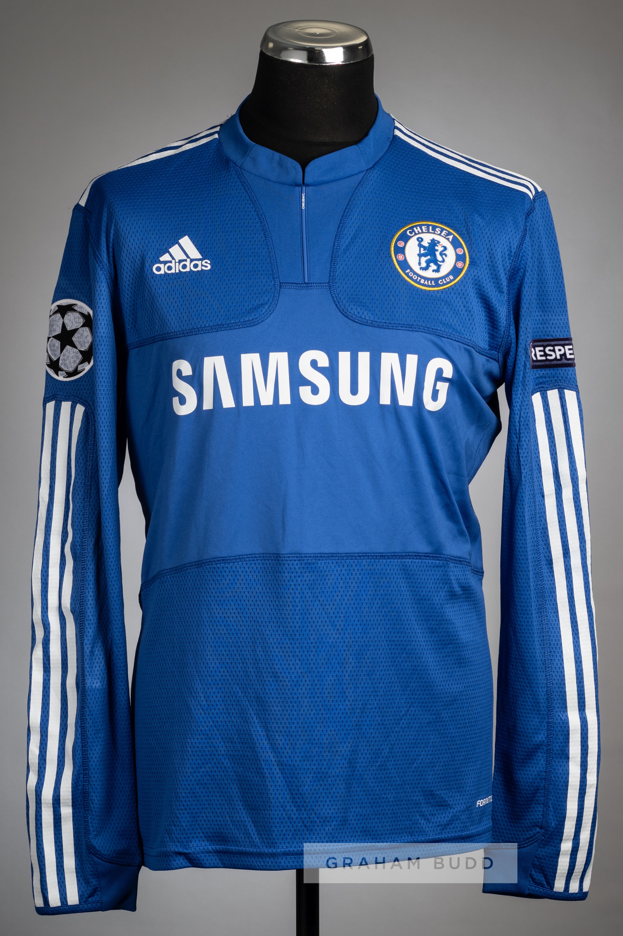 Michael Essien signed blue Chelsea no.5 home jersey, season 2009-10, Adidas, long-sleeved with UEFA STARBALL and RESPECT sleeve badges, club crest an