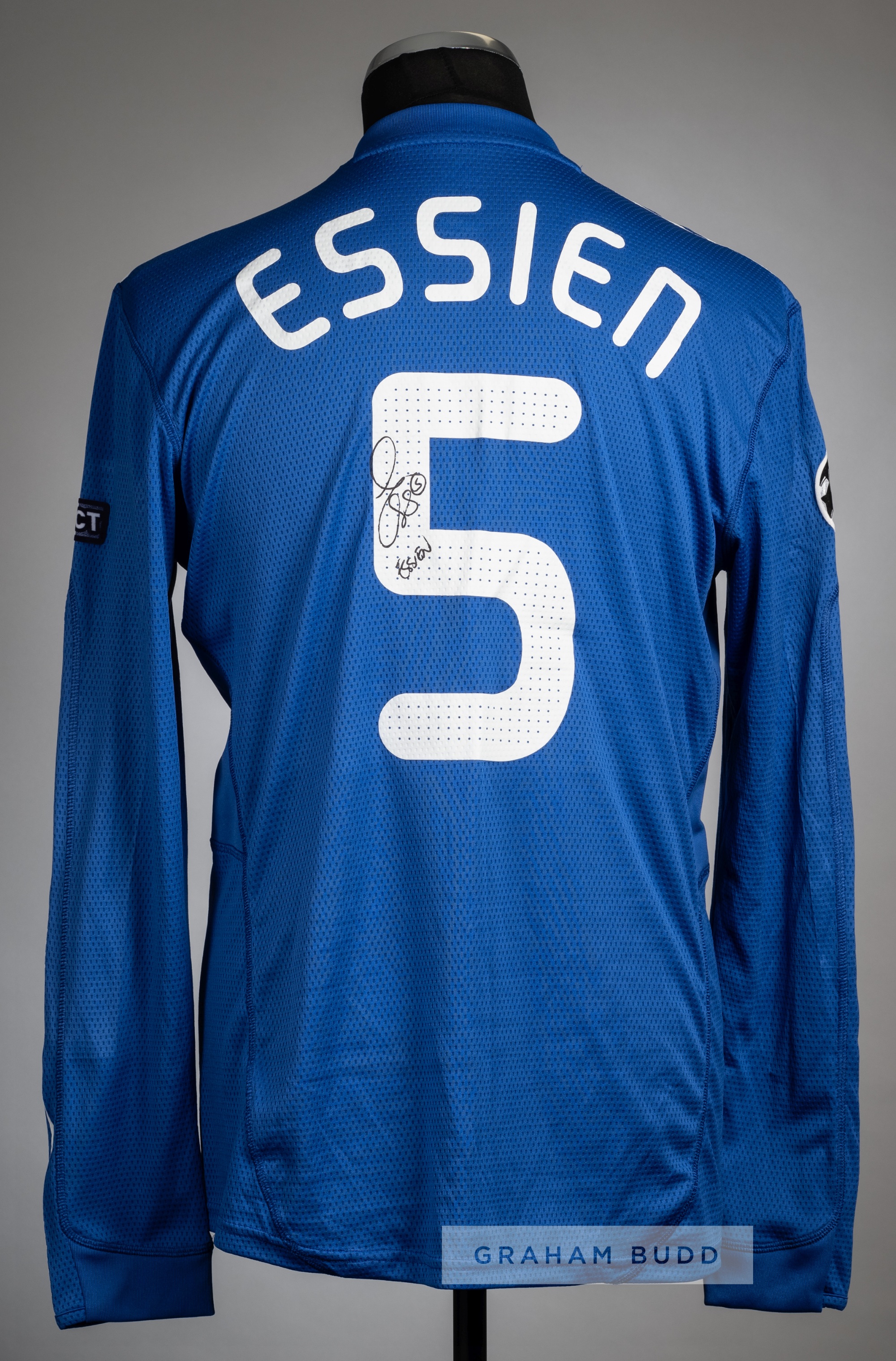 Michael Essien signed blue Chelsea no.5 home jersey, season 2009-10, Adidas, long-sleeved with UEFA STARBALL and RESPECT sleeve badges, club crest and sponsor logo, reverse lettered ESSIEN, signed in black marker pen on number five on reverse Michael Essien played for Chelsea during 2005-14, making 168 appearances scoring 17 goals.