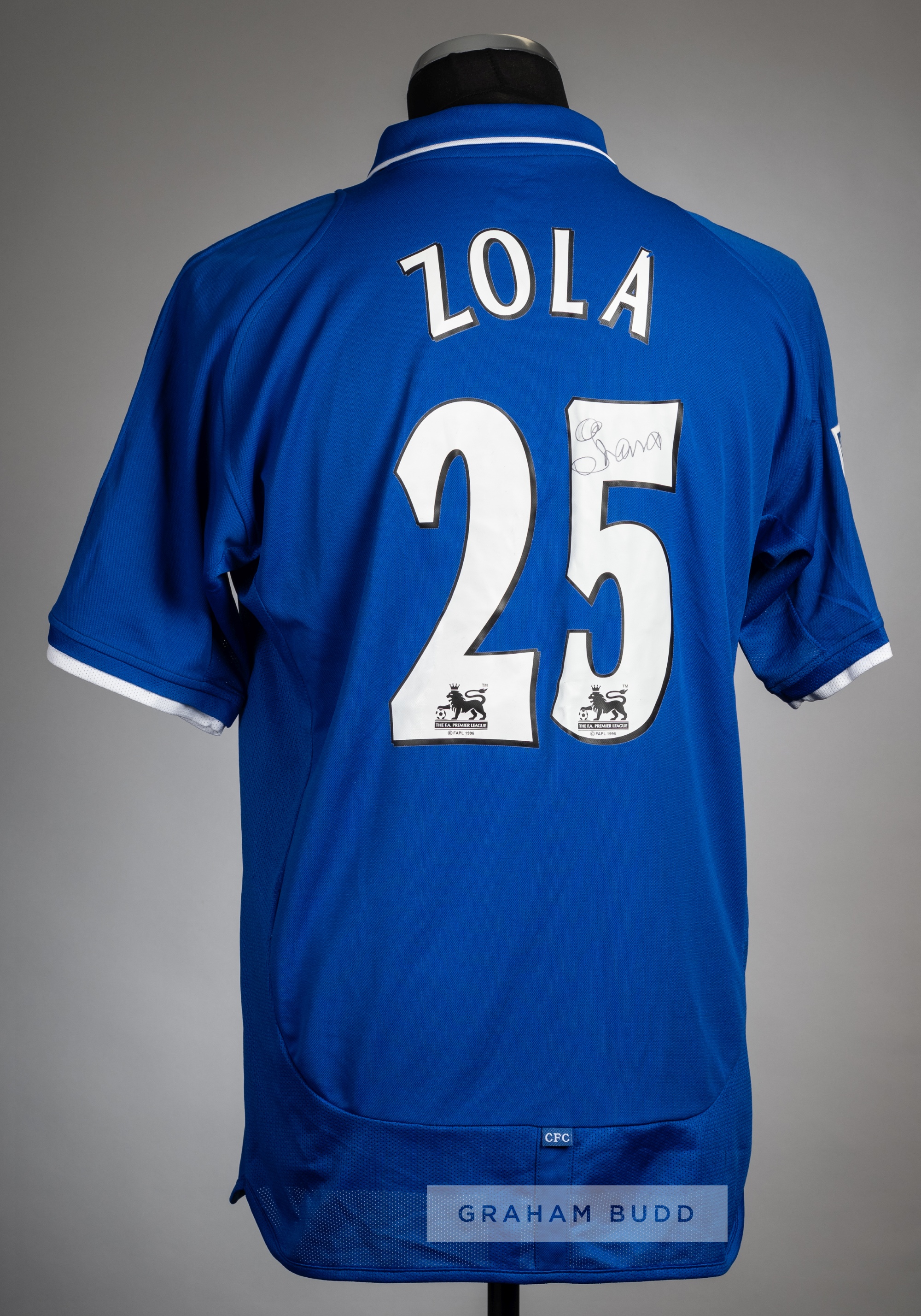 Gianfranco Zola signed blue Chelsea no.25 FA Cup Final jersey v Arsenal at Millennium Stadium, Cardiff, 4th May 2002, Umbro, short-sleeved with AXA T