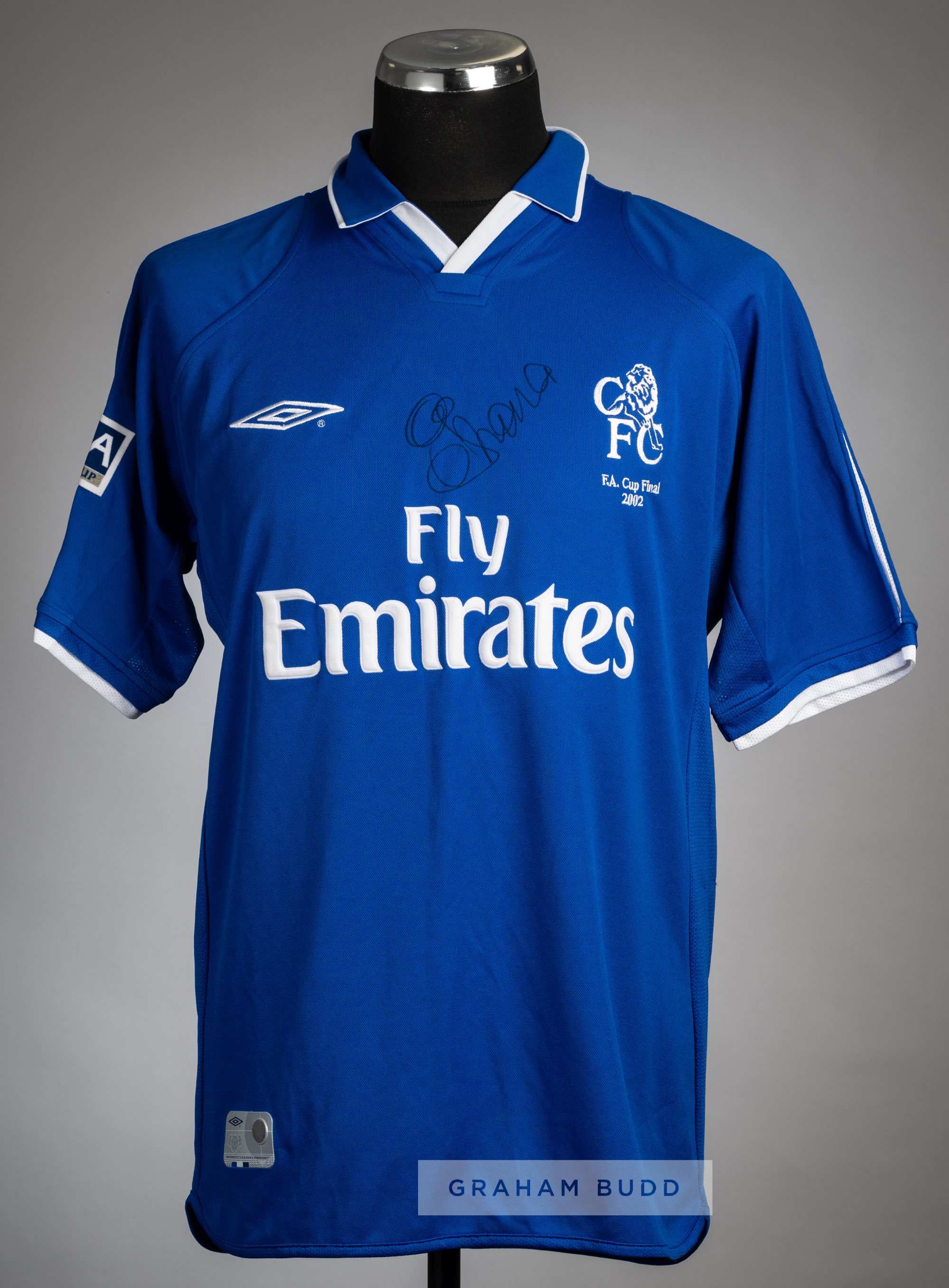 Gianfranco Zola signed blue Chelsea no.25 FA Cup Final jersey v Arsenal at Millennium Stadium, Cardiff, 4th May 2002, Umbro, short-sleeved with AXA THE FA CUP sleeve badge, club crest and sponsor logo, reverse lettered ZOLA, signed in black marker pen on the front and in number five on reverse Arsenal defeated Chelsea 2-0, with Zola substituted on in the 68th minute. Gianfranco Zola played with Chelsea during 1996-2003 making 229 appearances scoring 59 goals.