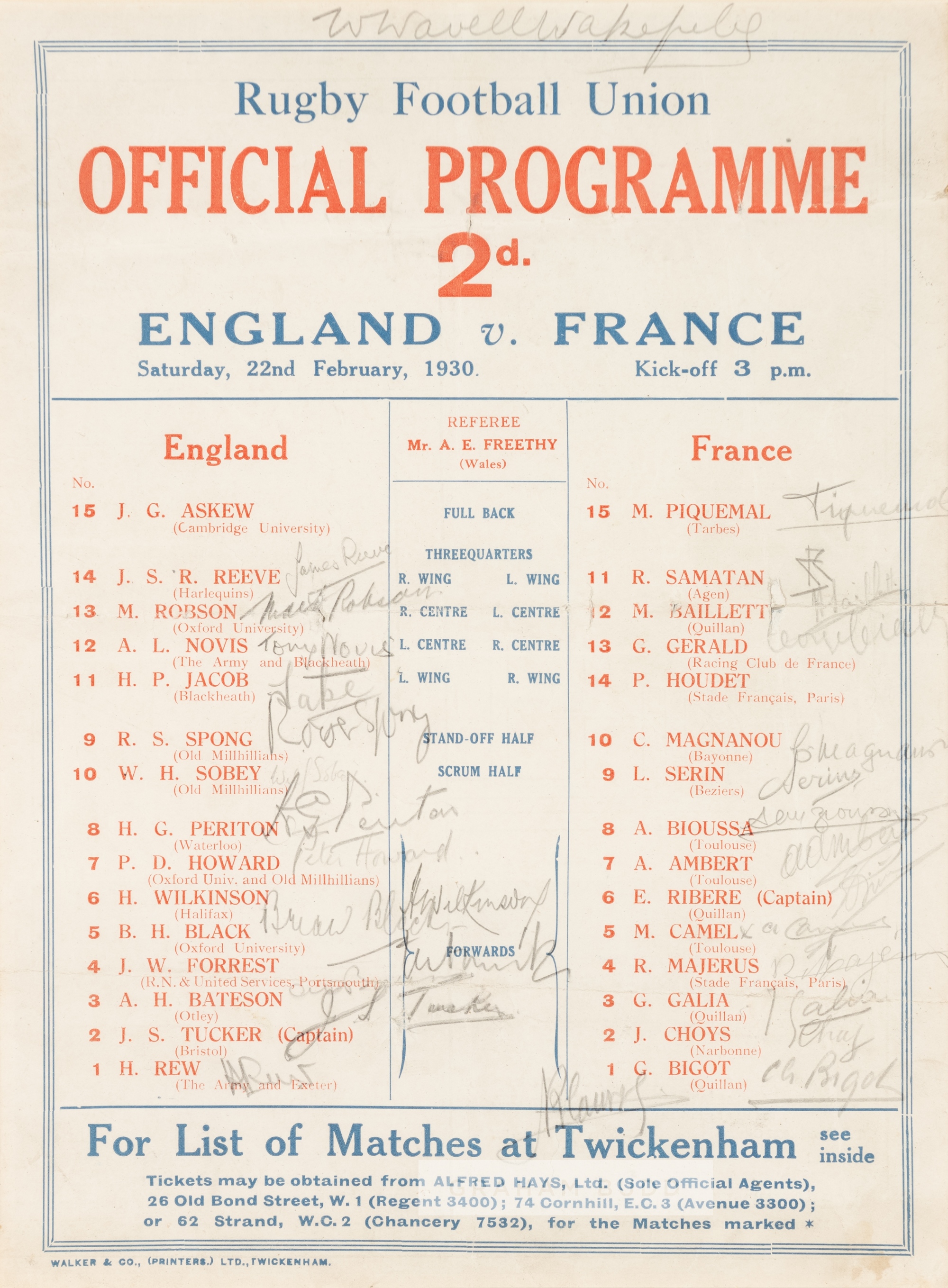 Signed England v France rugby programme, played Twickenham, 22nd February 1930, printed with fixture details, both sets of players with position and