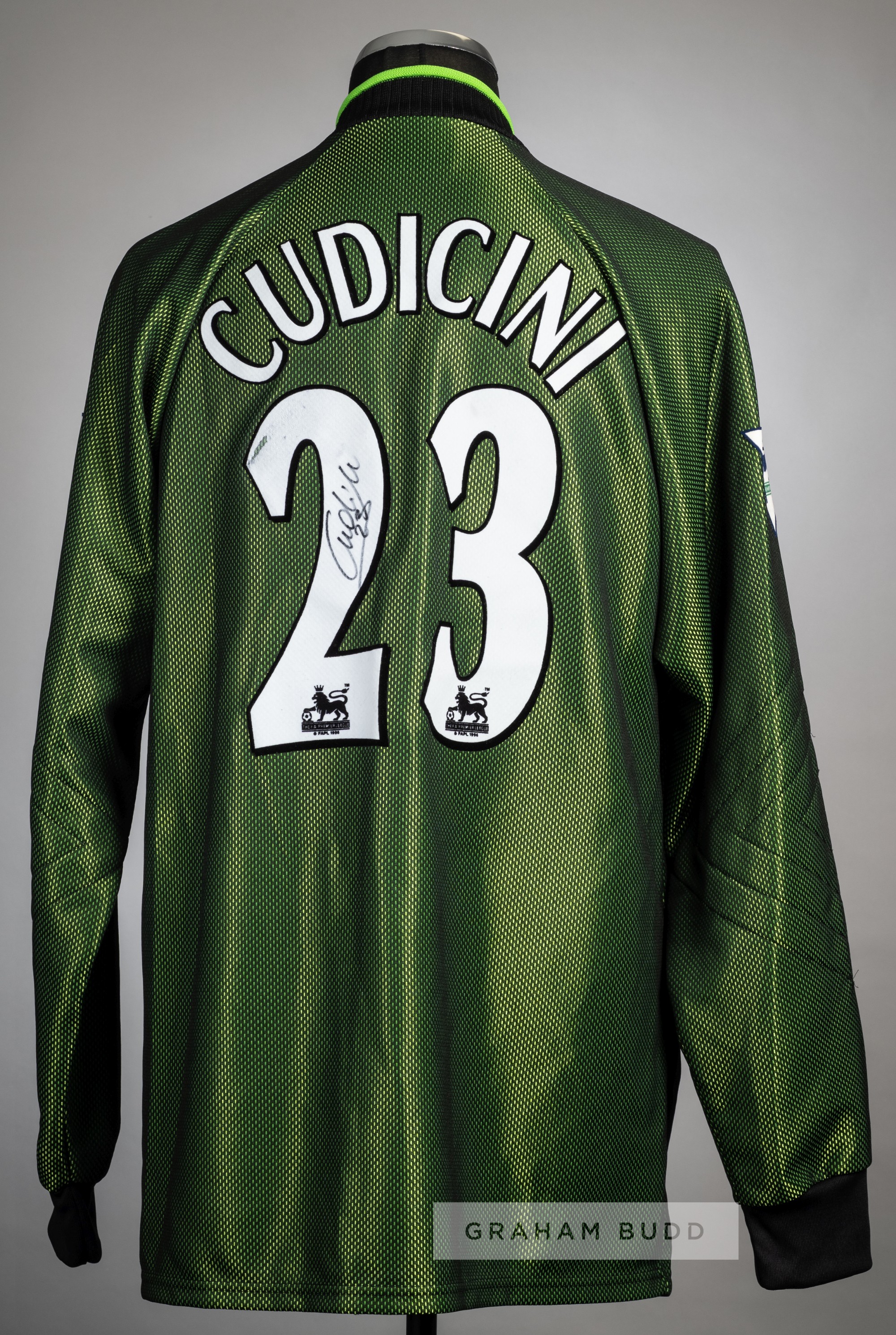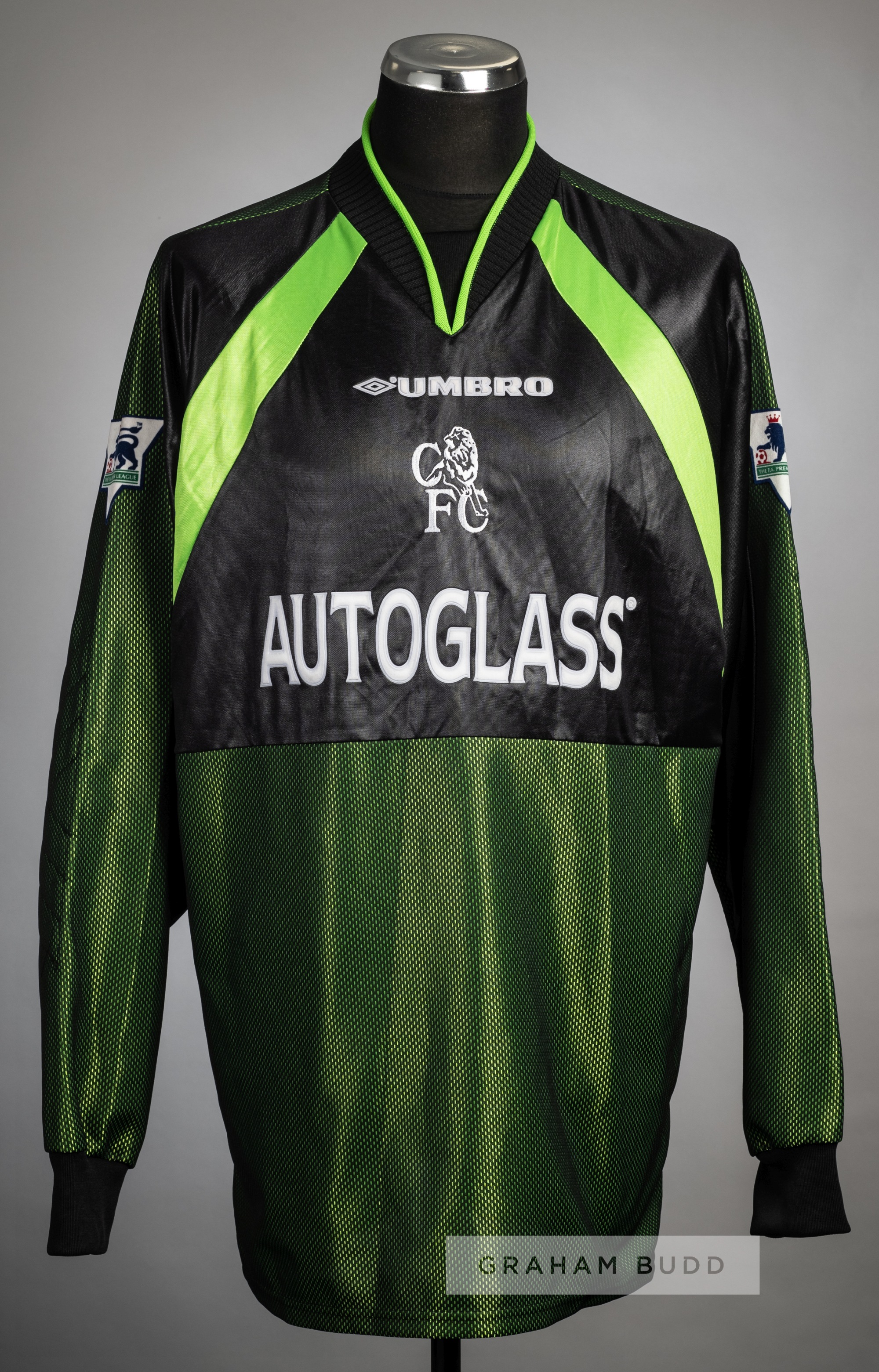 Carlo Cudicini signed dark green and black Chelsea no.23 goalkeeper's third choice jersey, season 2000-01, Umbro, long-sleeved with THE FA PREMIER LE