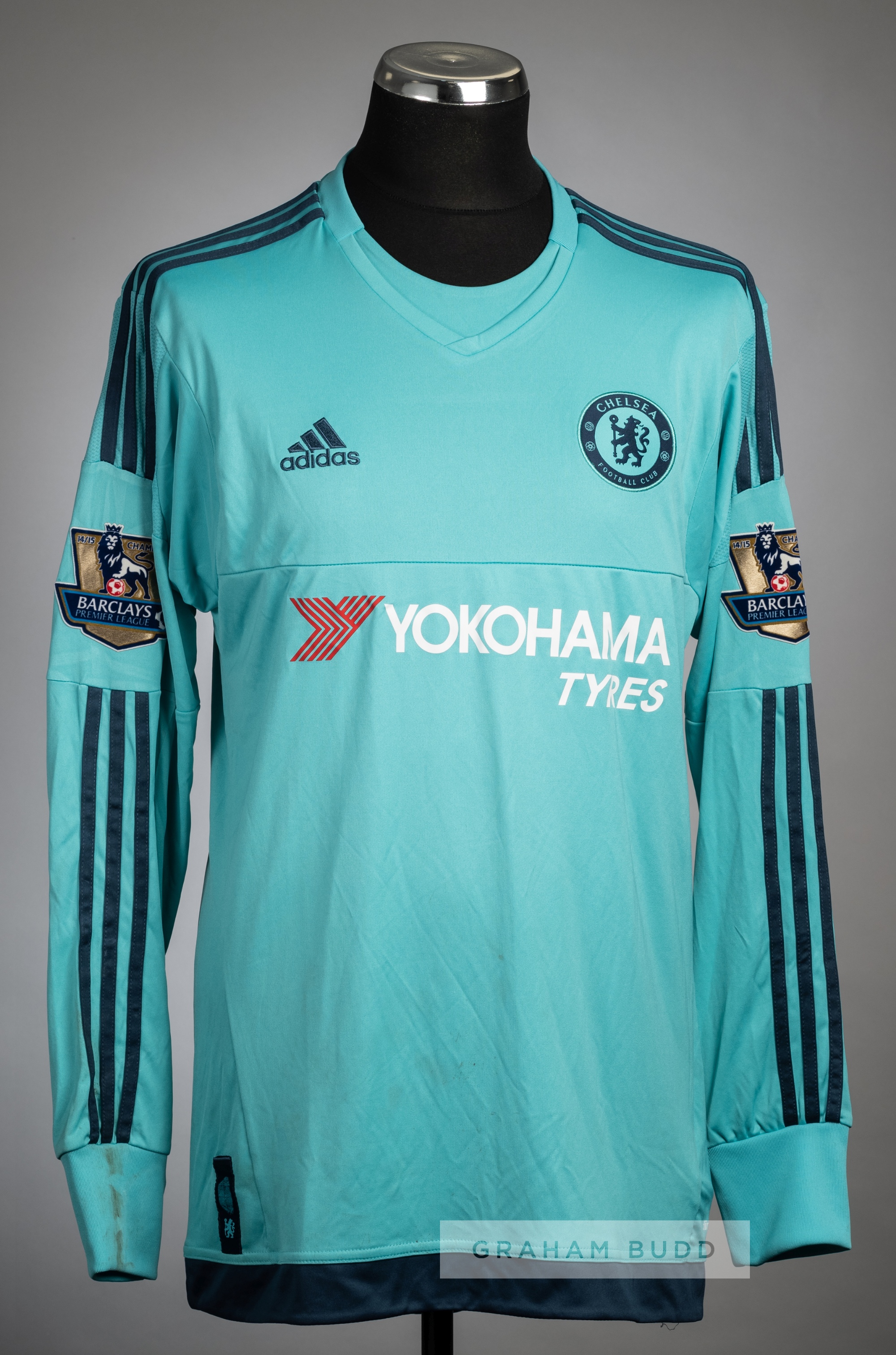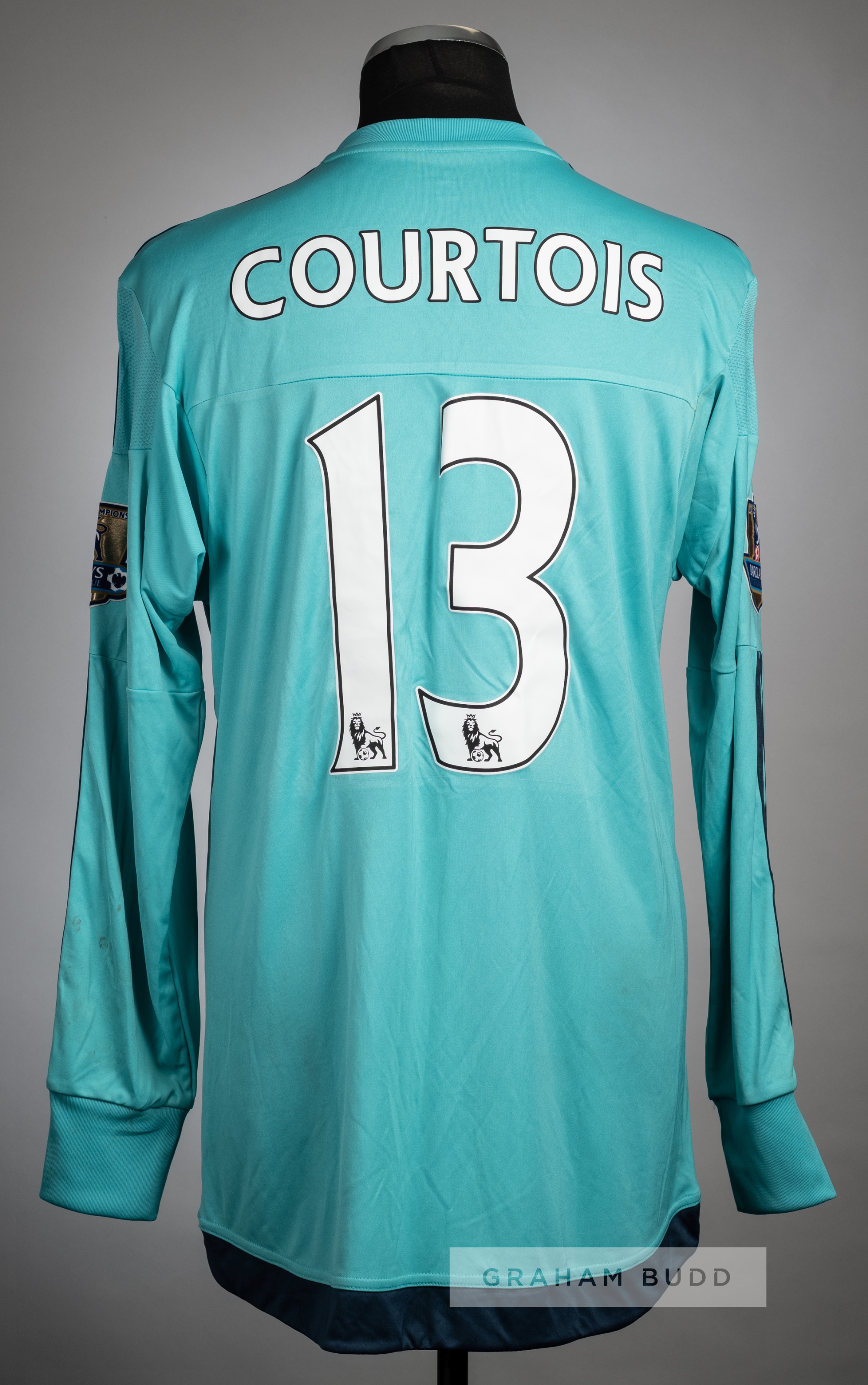Thibaut Courtois vivid mint Chelsea no.13 goalkeeper's home jersey, season 2015-16, Adidas, long-sleeved with BARCLAYS PREMIER LEAGUE 14-15 CHAMPIONS sleeve badges, club crest and sponsor logo, reverse lettered COURTOIS, bears signs of pitch marks on sleeves Thibaut Courtois played with Chelsea during 2011-18 making 126 appearances.