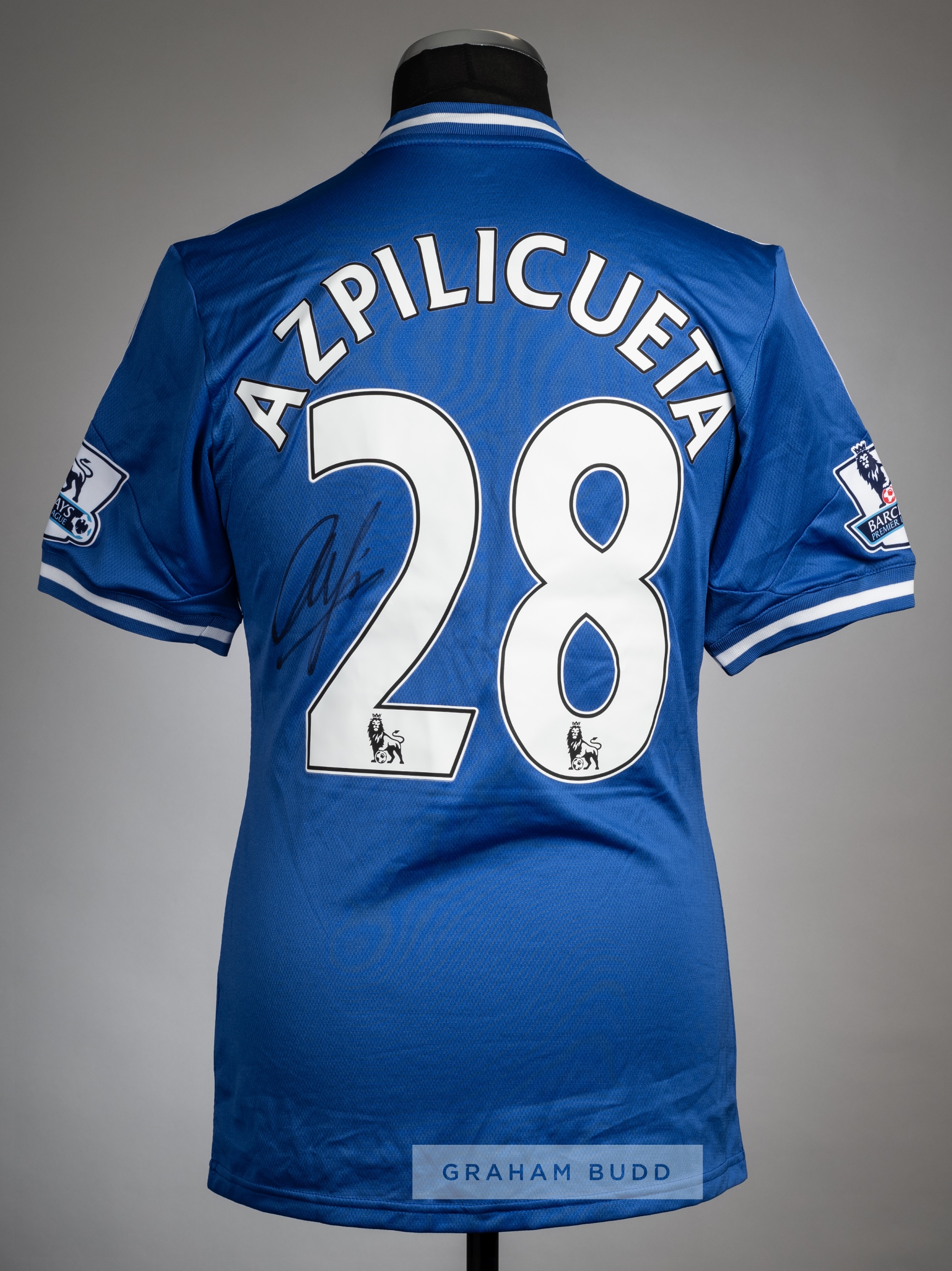 Cesar Azpilicueta signed blue Chelsea no.28 home jersey, season 2013-14, Adidas, short-sleeved with BARCLAYS PREMIER LEAGUE sleeve badges, club crest and sponsor logo, reverse lettered AZPILICUETA, signed in black marker pen on reverse Cesar Azpilicueta plays with Chelsea since 2012, making 314 appearances scoring nine goals to date.