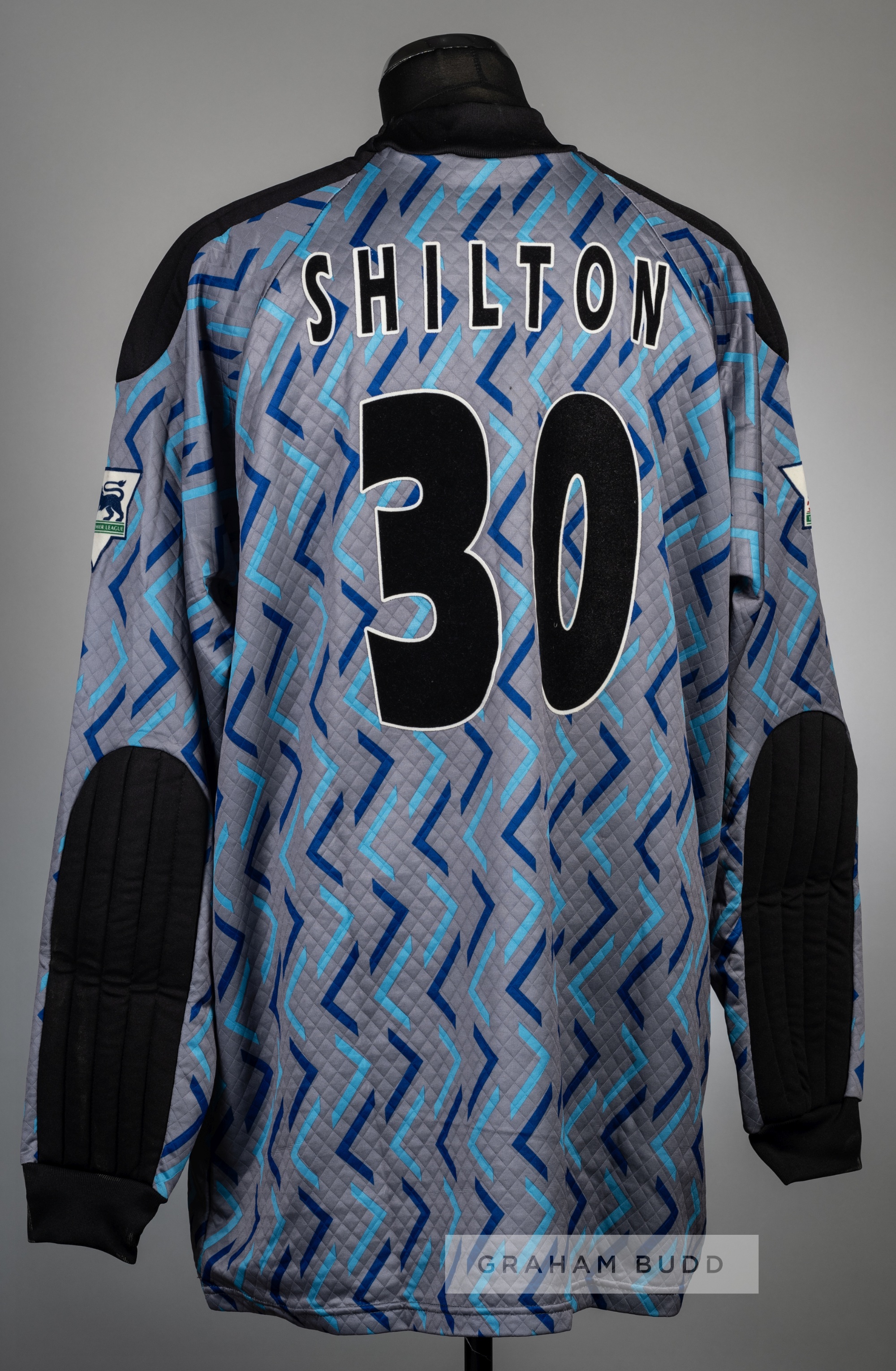 Rare Peter Shilton signed multi-pattern Coventry City no.30 goalkeeper's jersey, season 1995-96, Pony, long-sleeved embroidered club crest badge and