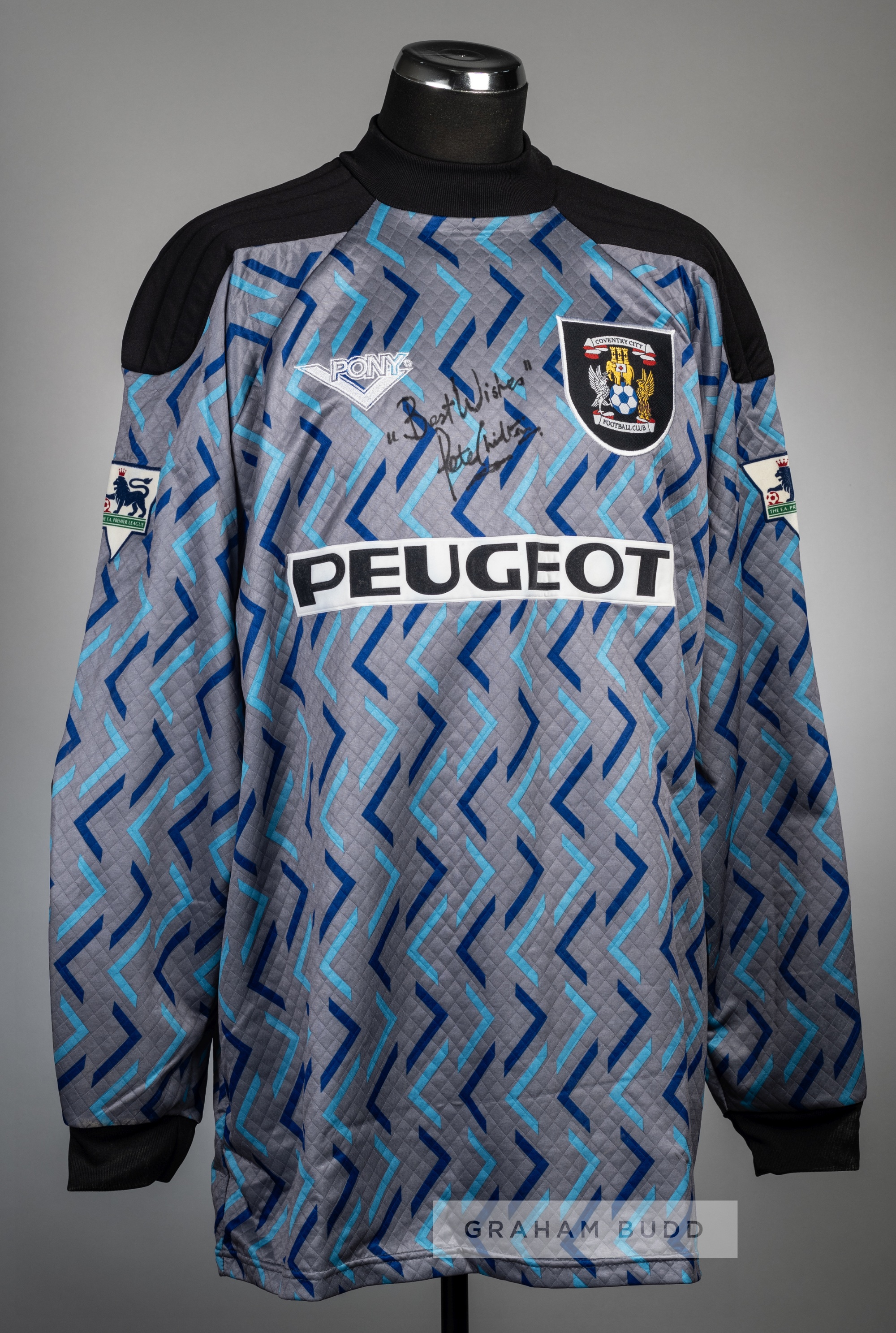 Rare Peter Shilton signed multi-pattern Coventry City no.30 goalkeeper's jersey, season 1995-96, Pony, long-sleeved embroidered club crest badge and sponsor logo, reverse numbered 30, signed to the front in black marker pen by Shilton and inscribed BEST WISHES Peter Shilton signed for Coventry City from Bolton Wanderers but never made first team appearance before being transferred to West Ham United, making this a rare jersey from Shilton's long and illustrious career.