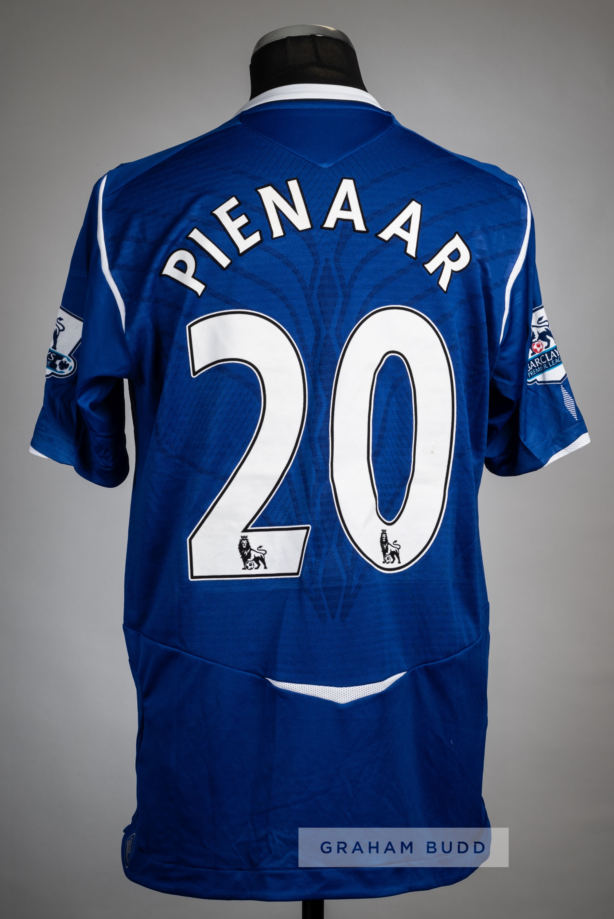 Steven Pienaar blue Everton no.20 home jersey v Arsenal at Emirates Stadium, 118th October 2008, Umbro, short-sleeved with BARCLAYS PREMIER LEAGUE sleeve badges, embroidered club crest and Umbro logo, sponsor logo, reverse lettered PIENAAR Arsenal defeated Everton 3-1. Steven Pienaar played with Everton during 2008-11, making 76 appearances scoring seven goals, having been on loan previously from Borussia Dortmund 2007-08, making 28 appearances scoring two goals.