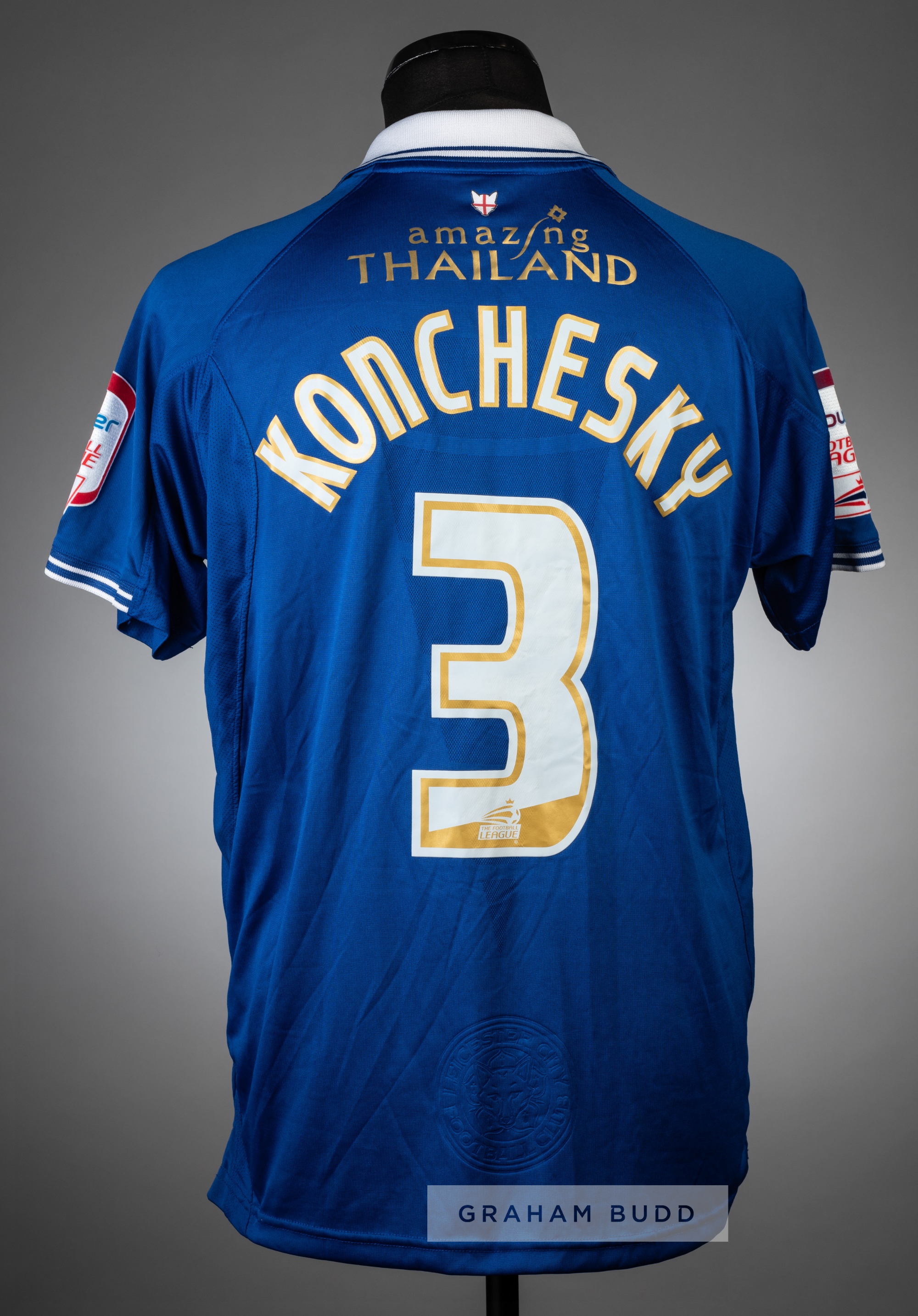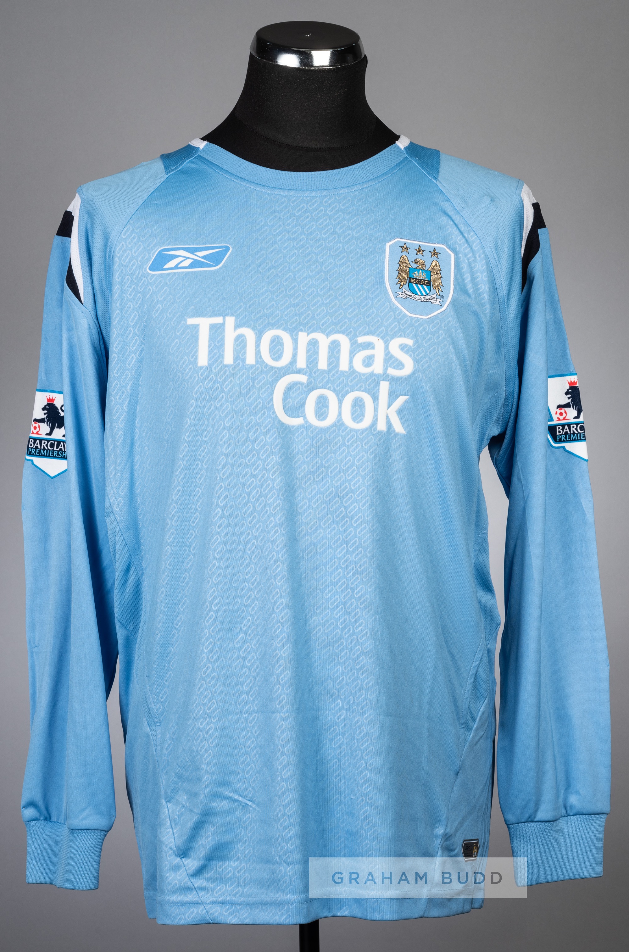 Three football jerseys, comprising: i) Tim Howard black and grey Everton no.24 goalkeeper's jersey v Larissa in the UEFA Cup Group A at Goodison Park, 25th October 2007, Umbro, spare long-sleeved with UEFA CUP sleeve badge, embroidered with UEFA CUP EVERTON v LARISSA 25.10.07, club crest and sponsor logo, reverse lettered HOWARD; ii) Paul Konchesky blue Leicester City no.3 home jersey, season 2011-12, short-sleeved with NPOWER FOOTBALL LEAGUE sleeve badges, club crest and sponsor logo, reverse lettered KONCHESKY; and iii) Shaun Wright-Phillips signed pale blue Manchester City no.29 home jersey, season 2004-05, Reebok, long-sleeved with BARCLAYS PREMIERSHIP sleeve badges, club crest and sponsor logo, reverse lettered WRIGHT-PHILLIPS, signed in black marker pen to reverse