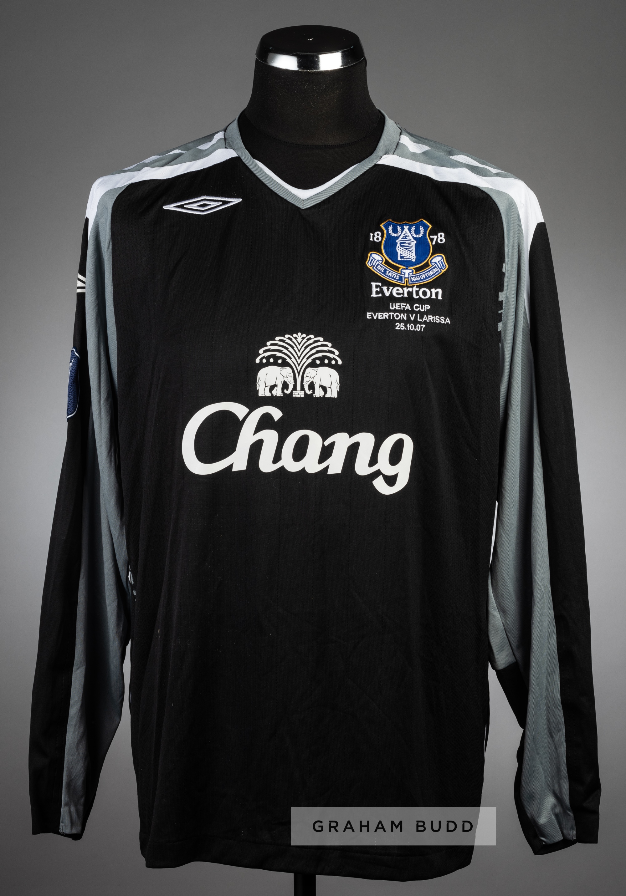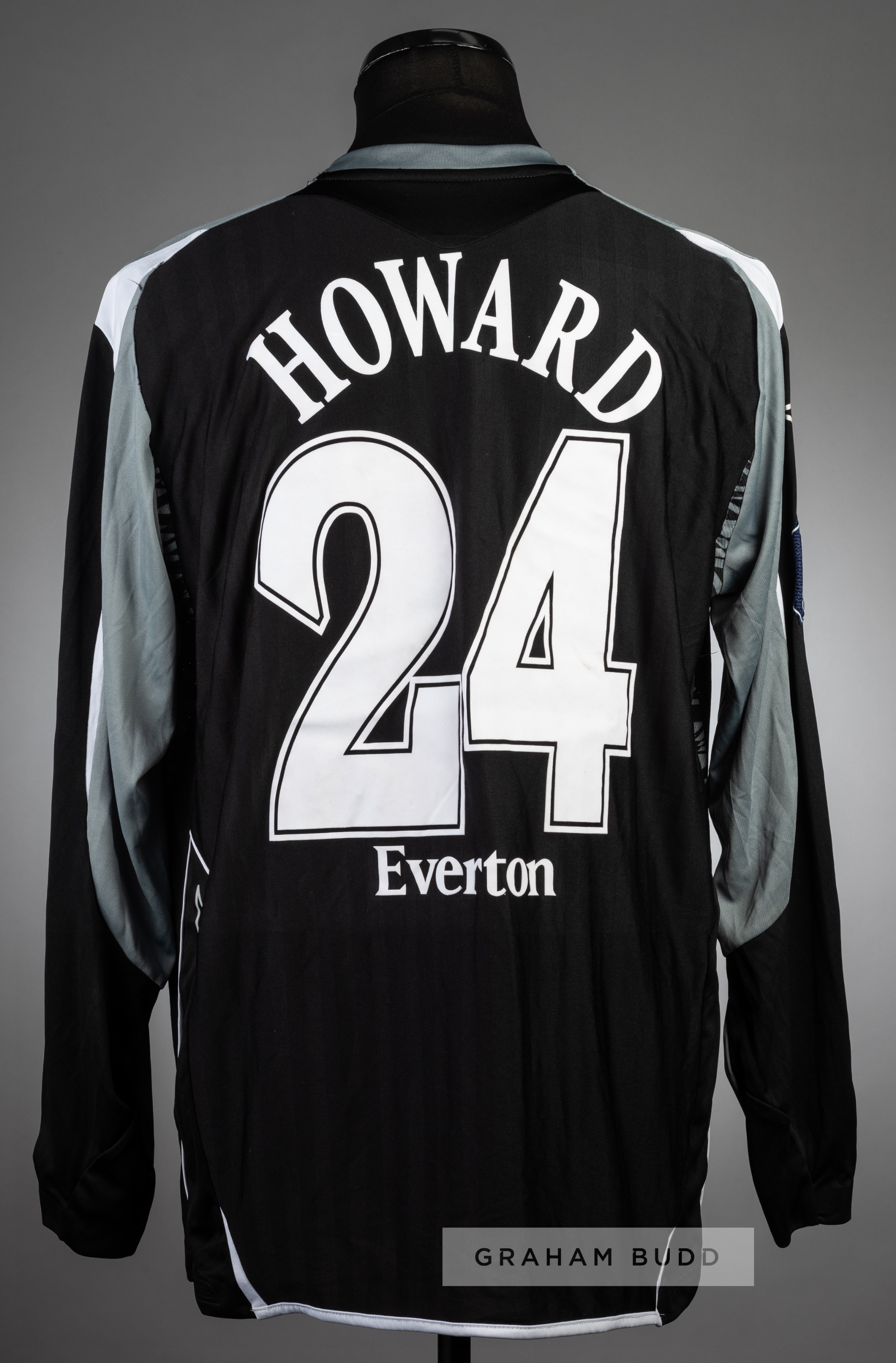 Three football jerseys, comprising: i) Tim Howard black and grey Everton no.24 goalkeeper's jersey v Larissa in the UEFA Cup Group A at Goodison Park