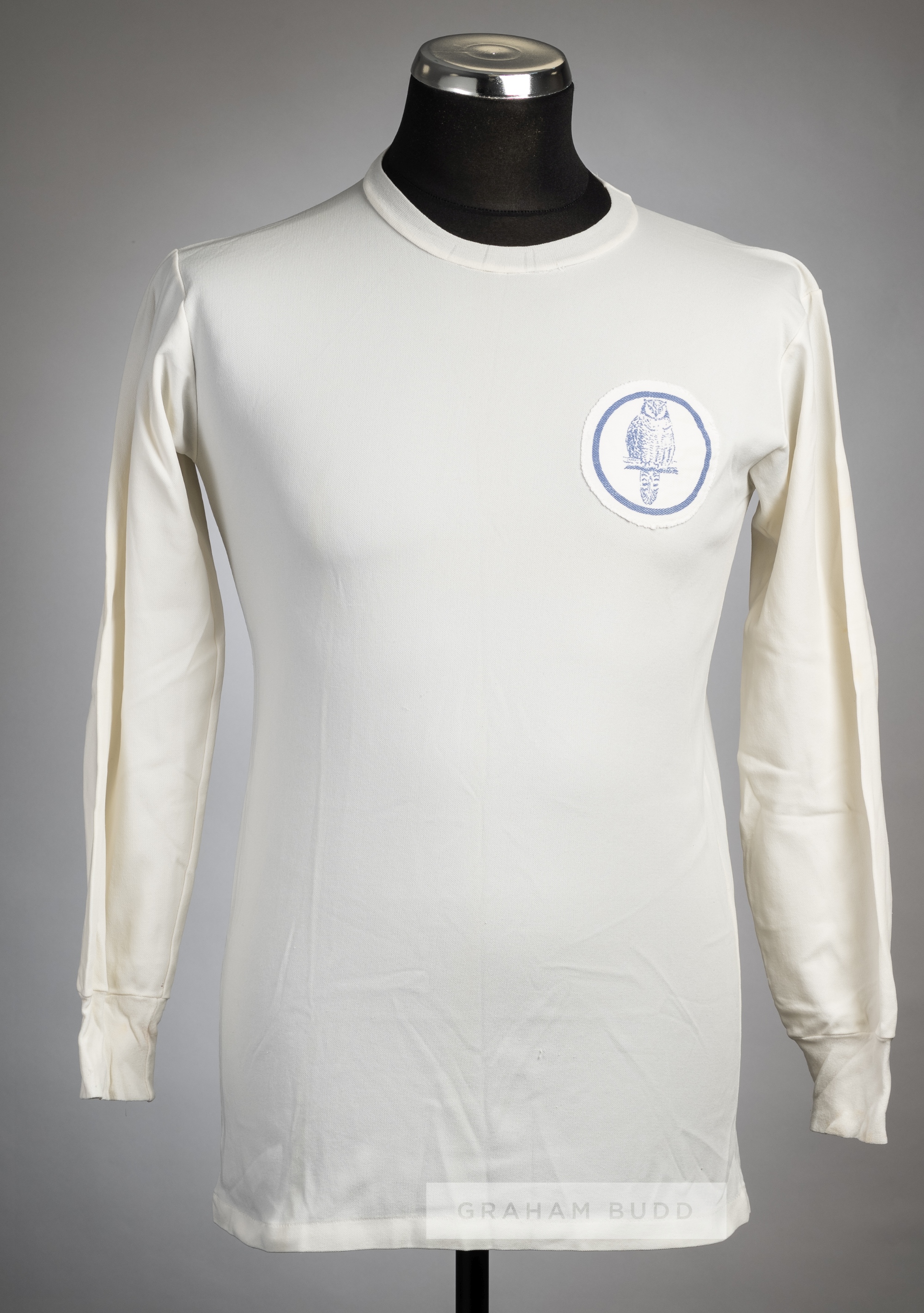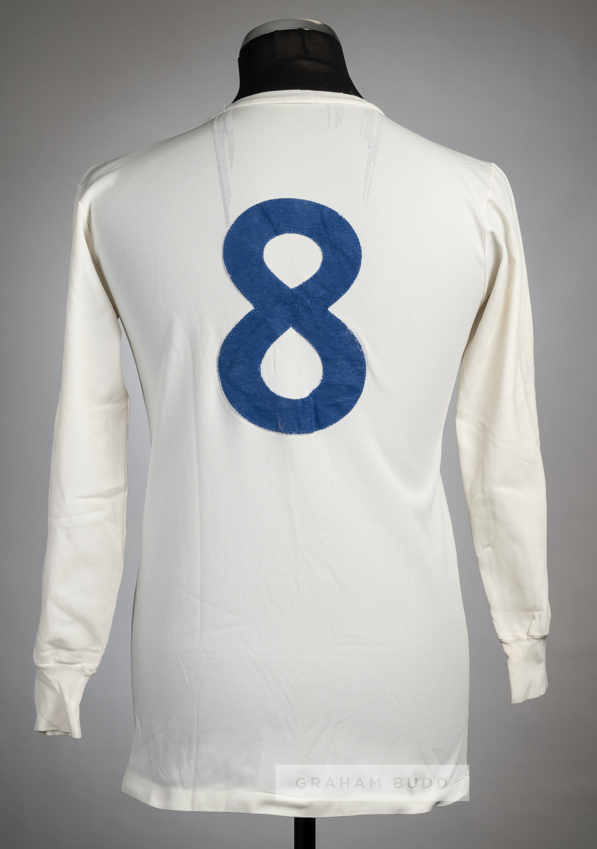 White Leeds United no.8 home jersey, mid 1960s, long-sleeved with printed club crest badge, reverse numbered 8 in blue felt, no makers label