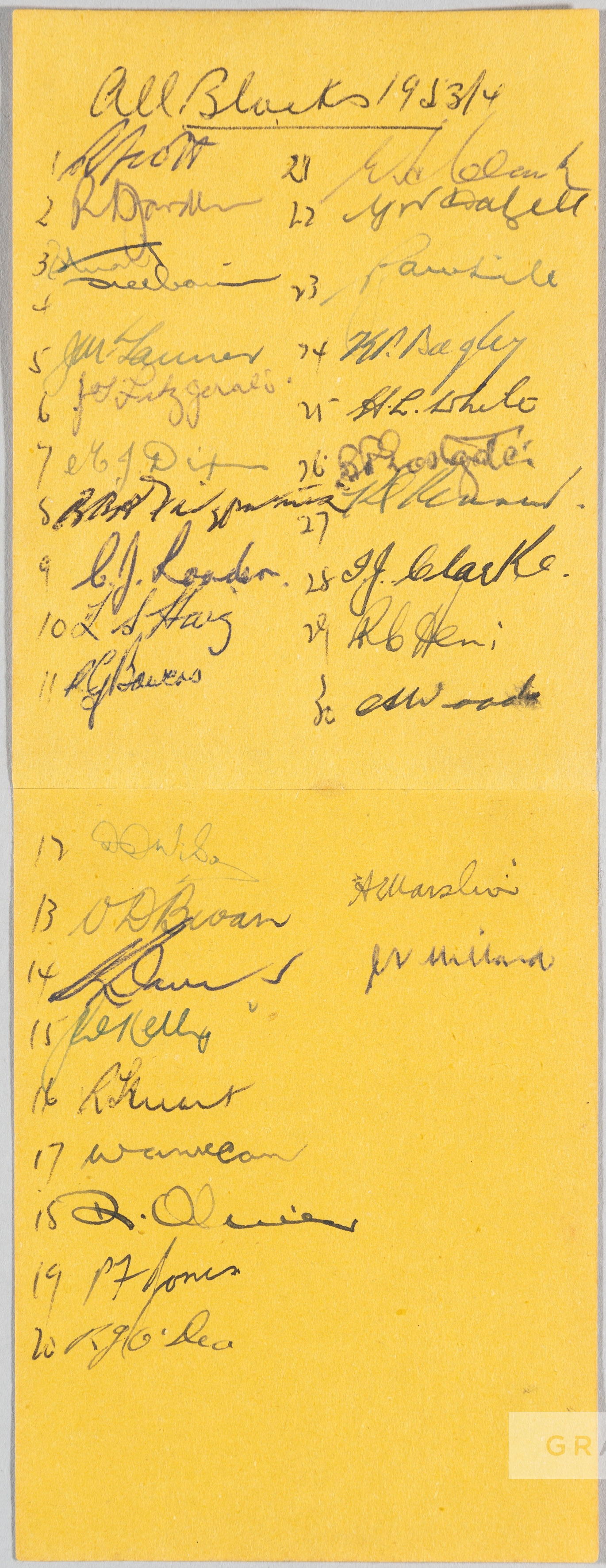 RUGBY UNION - NEW ZEALAND ALL BLACKS TO THE U.K 1953-54 RUGBY UNION AUTOGRAPH TEAM SHEET The 1953–54 New Zealand rugby union tour of Britain, Ireland, France and North America was a rugby union tour undertaken by the New Zealand national team which toured Europe and North America. The team was captained by Bob Stuart, and between October 1953 and March 1954, the team played 36 games including four test matches, one each against Ireland, England, Wales, and France. They won all but four games, losing only to Cardiff, Wales, France and South West France. DOUBLE AUTOGRAPH ALBUM PAGE NEATLY TAPE JOINED TO VERSO, OVERALL SIZE 9 ¼” x 3 ½” SIGNED IN INK BY THE COMPLETE NEW ZEALAND ‘ALL BLACKS’ SQUAD AND MANAGEMENT FOR THE RUGBY UNION TOUR TO THE UK AND FRANCE 1953-54. THIRTY-TWO (32) ORIGINAL AUTOGRAPHS INCLUDING: MASLIN & MILLARD (Managers), BOB SCOTT (Captain), JACK KELLY, MAURICE DIXON, BRIAN FITZPATRICK, COLIN LOADER, VINCENT BEVAN, KEITH DAVIS, BILL MCCAW, BILL CLARK, BOB O’DEA, DESMOND OLIVER, IAN CLARKE, BARRY EASTGATE, KEVIN SKINNER, RONALD HEMI, ARTHUR WOODS et al. THE TWO PAGES NEATLY TAPE JOINED TO VERSO, VERY GOOD CONDITION.