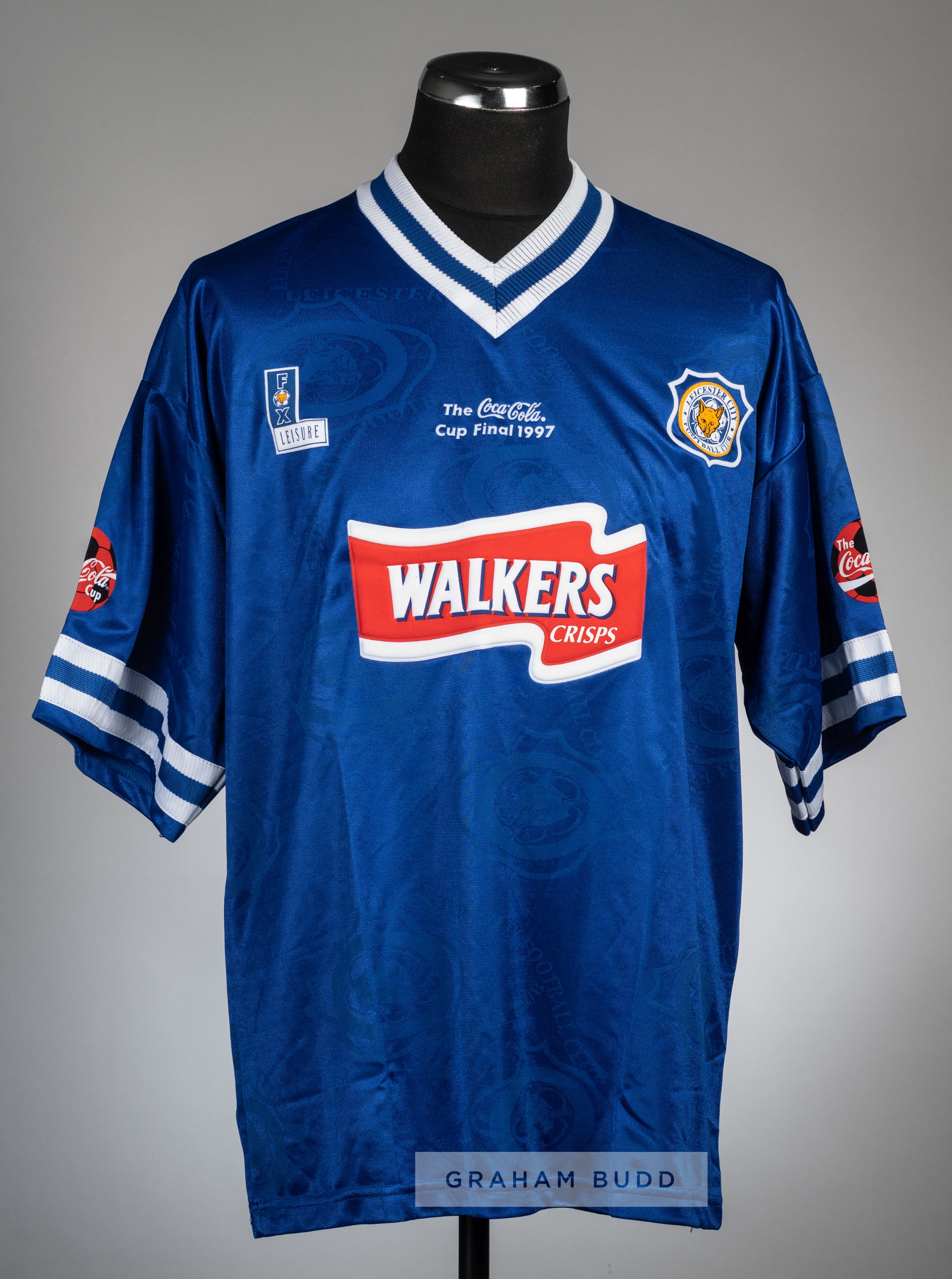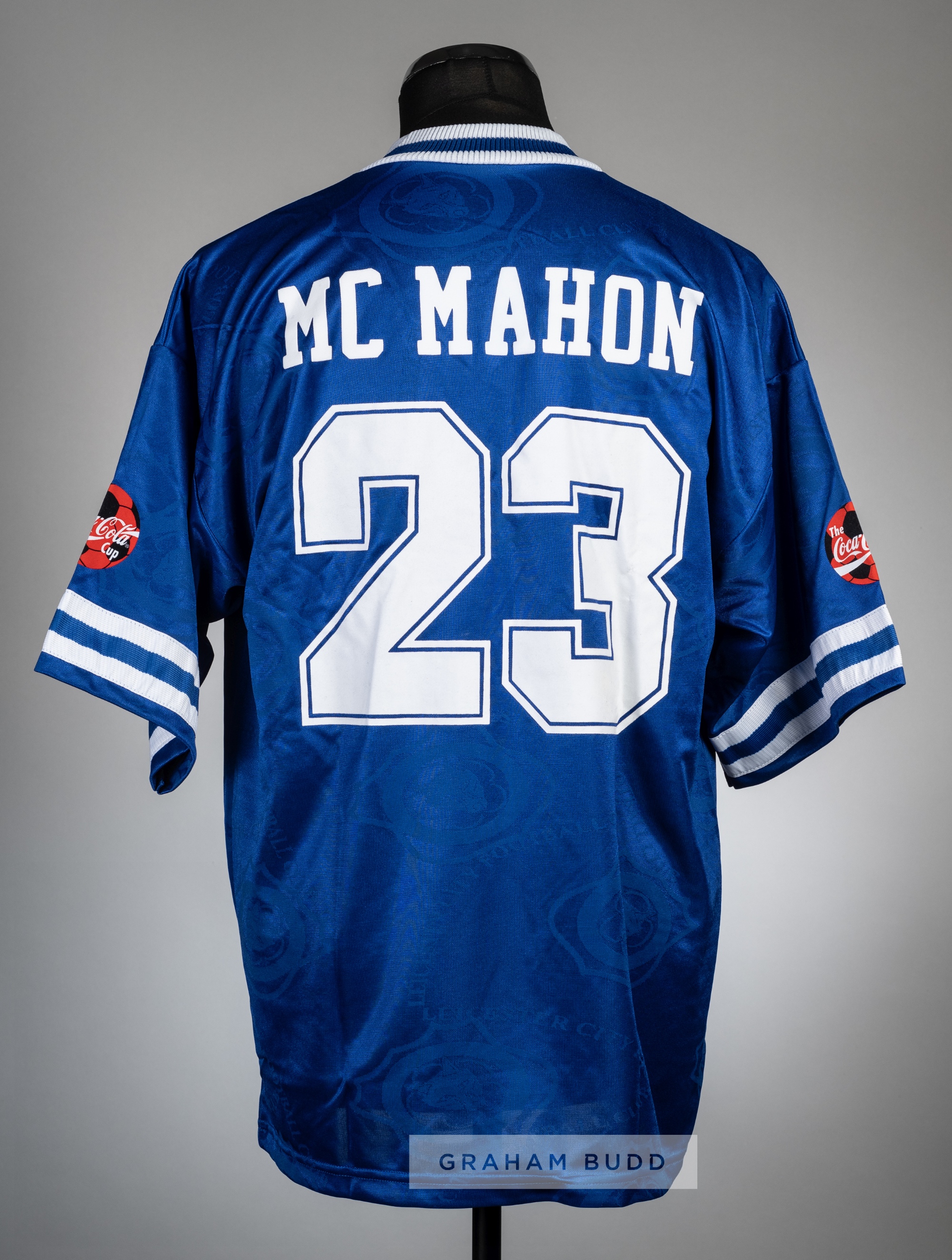 Sam McMahon blue Leicester City no.23 1997 Coca Cola Cup final jersey, Fox Leisure, short-sleeved with COCA COLA sponsor sleeve badges, club crest and sponsor logo, inscribed THE COCA COLA CUP FINAL 1997, reverse lettered MCMAHON This jersey was prepared for the midfielder Sam McMahon. However he was not selected by manager Martin O'Neil for the final or the replay or to be on the bench. |Leicester won the cup 1-0 against Middlesbrough after extra time in the replay played at Hillsborough.