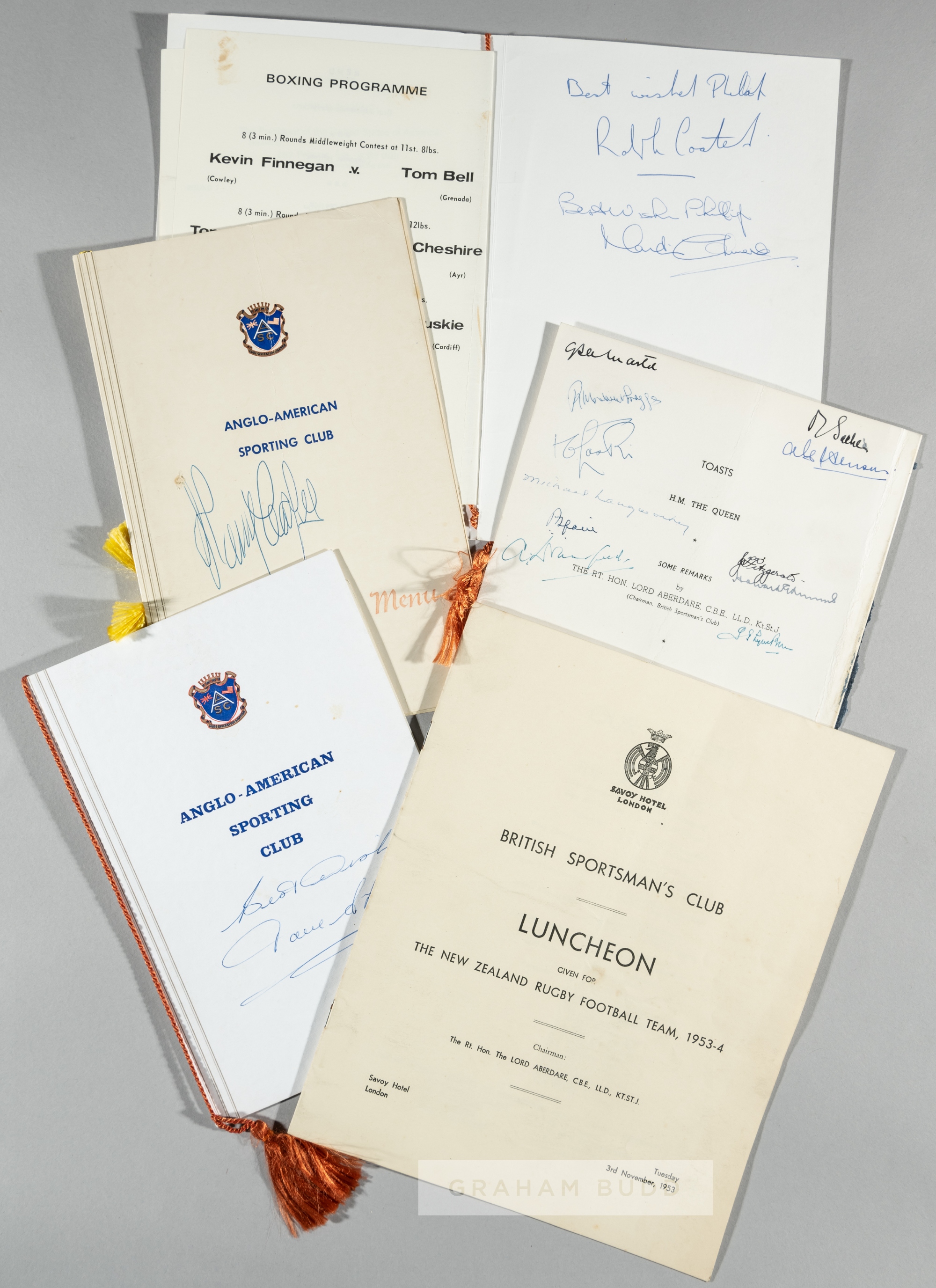 Four dinner menus signed by New Zealand rugby and boxing legends, comprising British Sportsman's Club luncheon given for the New Zealand rugby football team 1953-54 at Savoy Hotel, 3rd November table list booklet with a printed caricature menu by T Websier, signed by Websier, JT Fitzgerald (New Zealand), LG Lyon-Brown, A Dransfield, Michael Langworthy, Howard Edmunds and others; three Anglo-American Sporting Club Boxing dinner evening menus, 8th December 1970 signed on front cover, 13th March 1972 signed on inner back cover by Ralph Coates and Martin Chivers, 3rd December 1979 signed by Henry Cooper on cover in blue ink, (5)