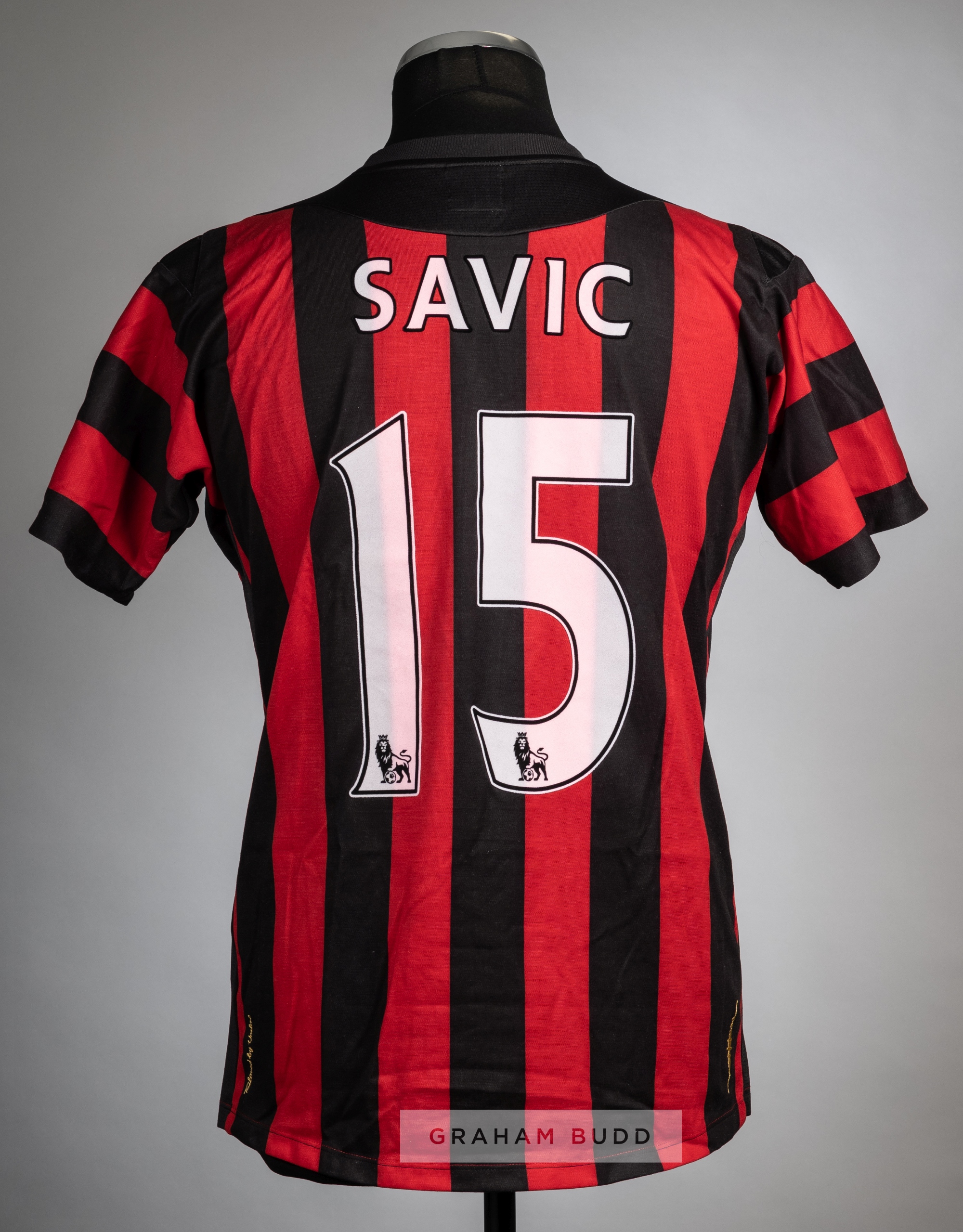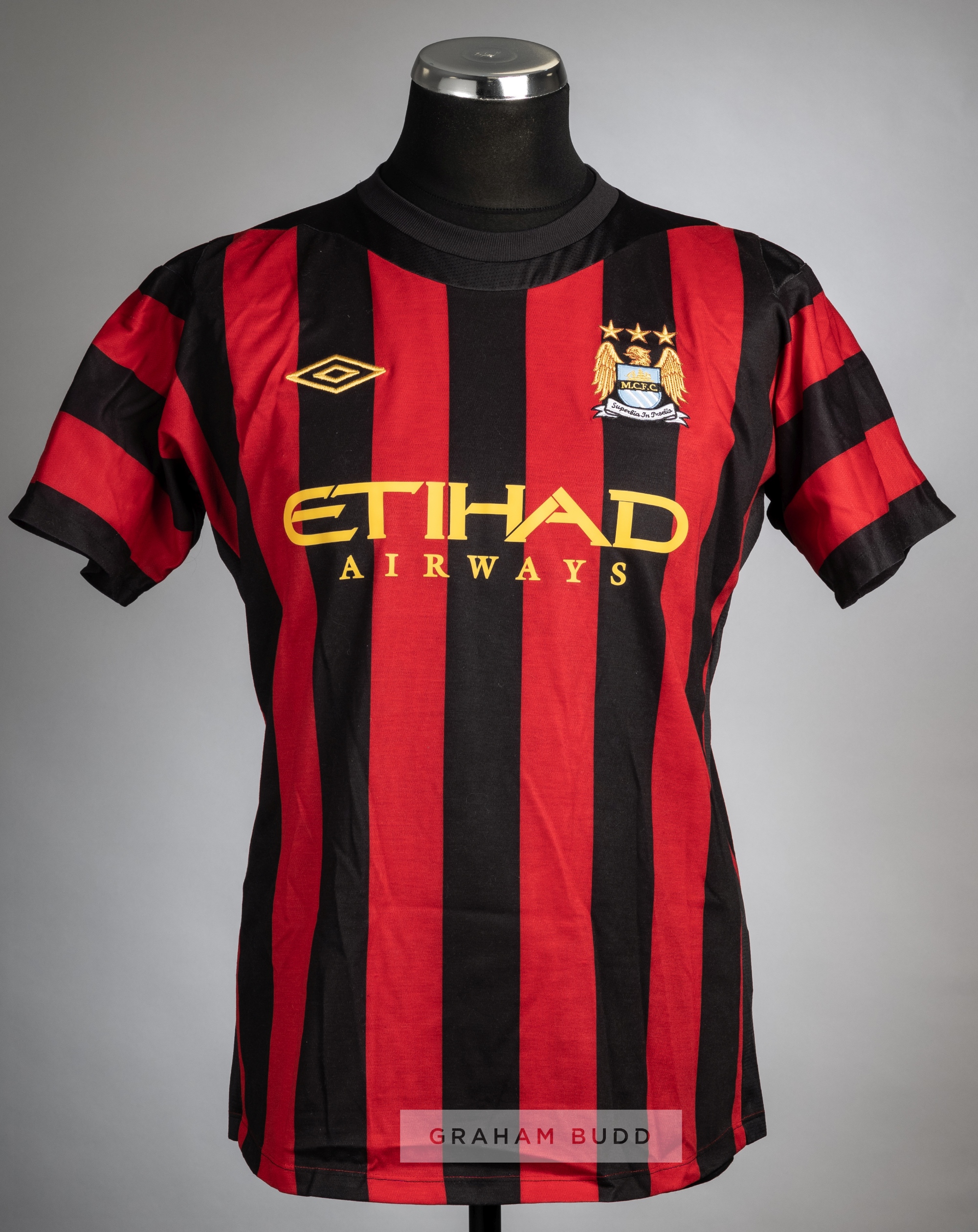 Stefan Savic red and black striped Manchester City No.15 away jersey from the World Football Challenge v Club America played at AT&T Park, San Francisco, 16th July 2011, Umbro, short-sleeved with embroidered club crest and Umbro logo, applied sponsor logo, reverse lettered SAVIC Manchester City defeated Club America 2-0. Stefan Savic played with Manchester City during 2011-12, making 12 appearances, scoring one goal.