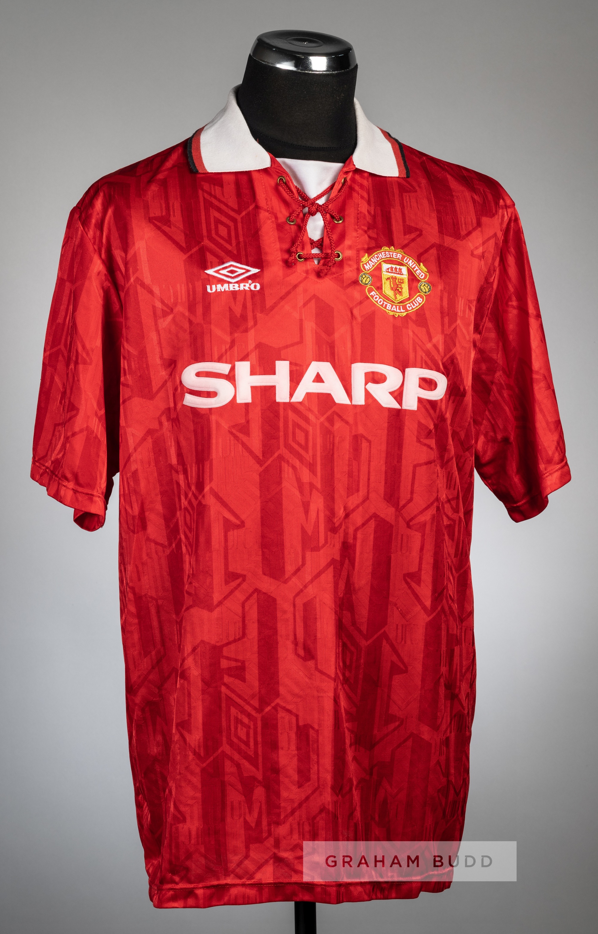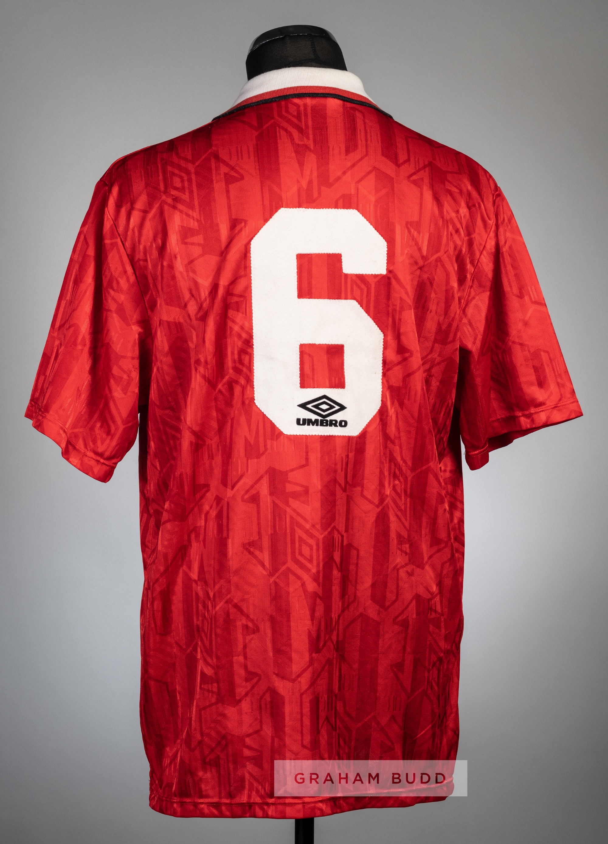 Manchester United red No.6 home jersey season 1993-94, Umbro, short-sleeved, club crest, lace-up collar, reverse numbered 6 This jersey has no Prem