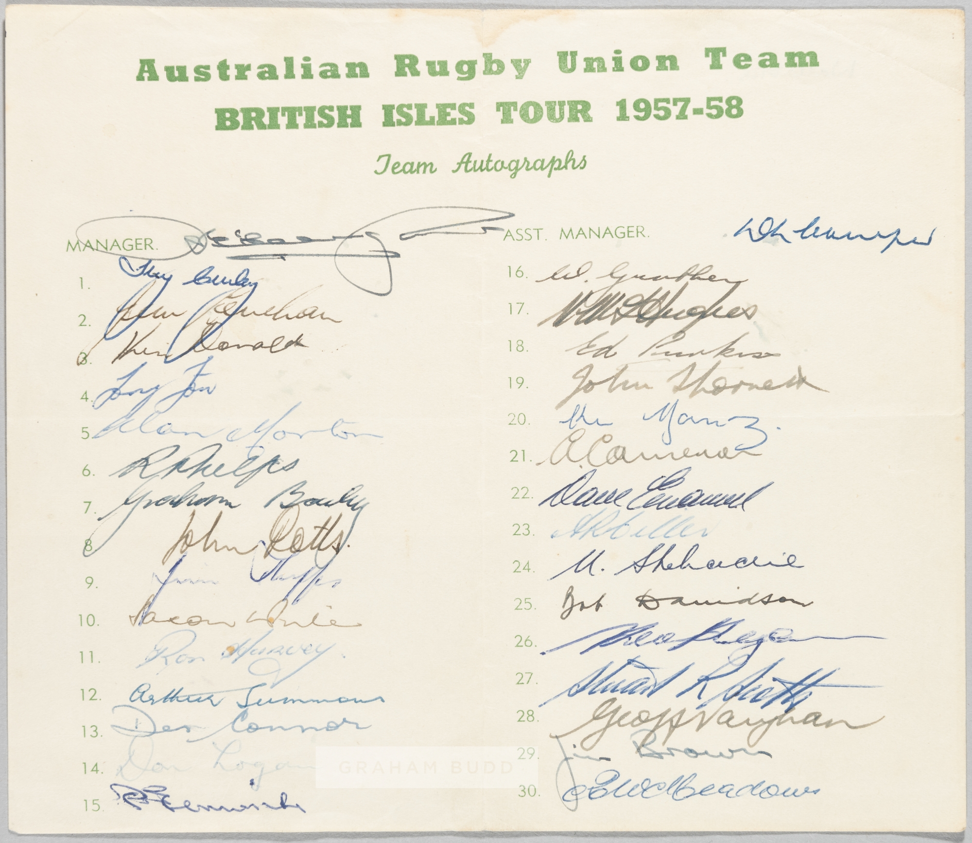 RUGBY UNION - AUSTRALIA TO BRITISH ISLES 1957-58 RUGBY UNION OFFICIAL AUTOGRAPH TEAM SHEET Between late 1957 and March 1958 the Australia national rugby union team – the Wallabies – conducted a world tour encompassing Britain, Ireland, France and Canada on which they played five Tests and thirty-one minor tour matches. The Wallabies won 17, lost 16 and drew three of their games in total. They lost all five Tests of the tour. OFFICIAL RUGBY UNION AUTOGRAPH SHEET WITH PRINTED AUSTRALIA TOUR HEADING AND PLAYER NUMBERS, SIGNED IN DIFFERENT COLOURED INKS ADJACENT TO THE PLAYING NUMBER BY THE COMPLETE AUSTRALIAN SQUAD AND MANAGEMENT FOR THE 1957-58 TOUR TO THE BRITISH ISLES, 32 ORIGINAL INK AUTOGRAPHS INCLUDING: BOB DAVIDSON (Capt), TERRY CURLEY, ROD PHELPS, SAXON WHITE, JACK POTTS, OTTO ‘TONY’ FOX, DES CONNOR, DON LOGAN, DAVID EMANUEL, NORMAN HUGHES, JIM BROWN, TONY MILLER et al. USUAL FORMER FOLD MARKS (FROM SENDING IN AN ENVELOPE TO THE ORIGINAL RECIPIENT). COUPLE OF MINOR DEFECTS NOT AFFECTING ANY OF THE SIGNATURES, OTHERWISE IN GOOD CONDITION.