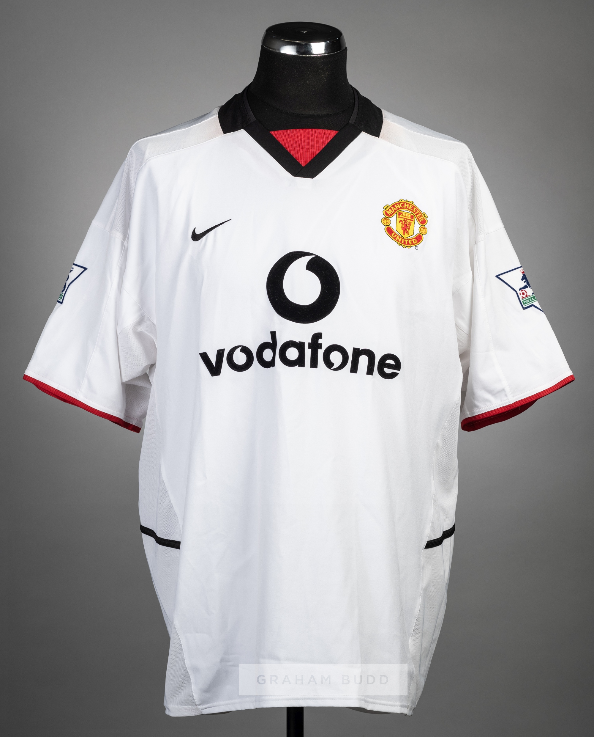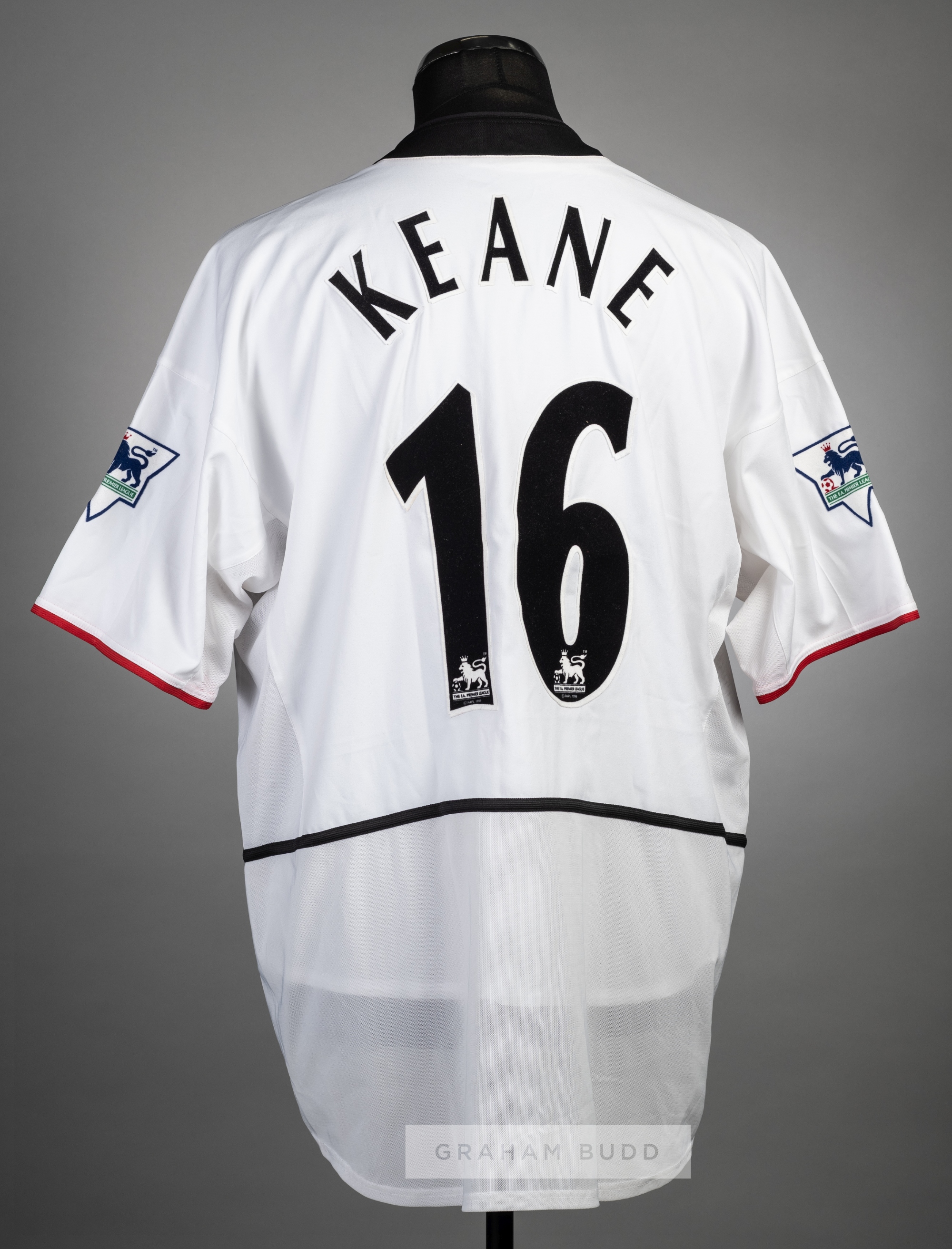 Roy Keane white Manchester United no.16 away jersey, season 2002-03, Nike, short-sleeved with THE FA PREMIER LEAGUE sleeve badges, club crest and sponsor logo, reverse lettered KEANE, bears Christies Auction tag Provenance: Lot 67 Christies Auction 19th May 2005