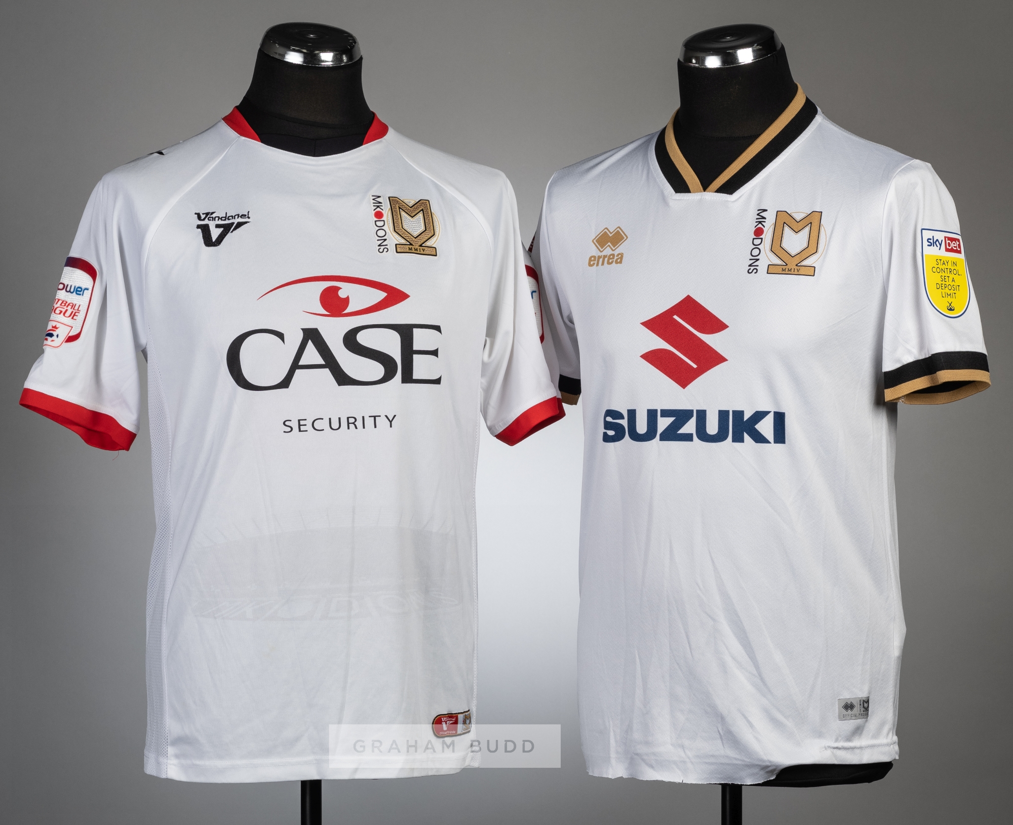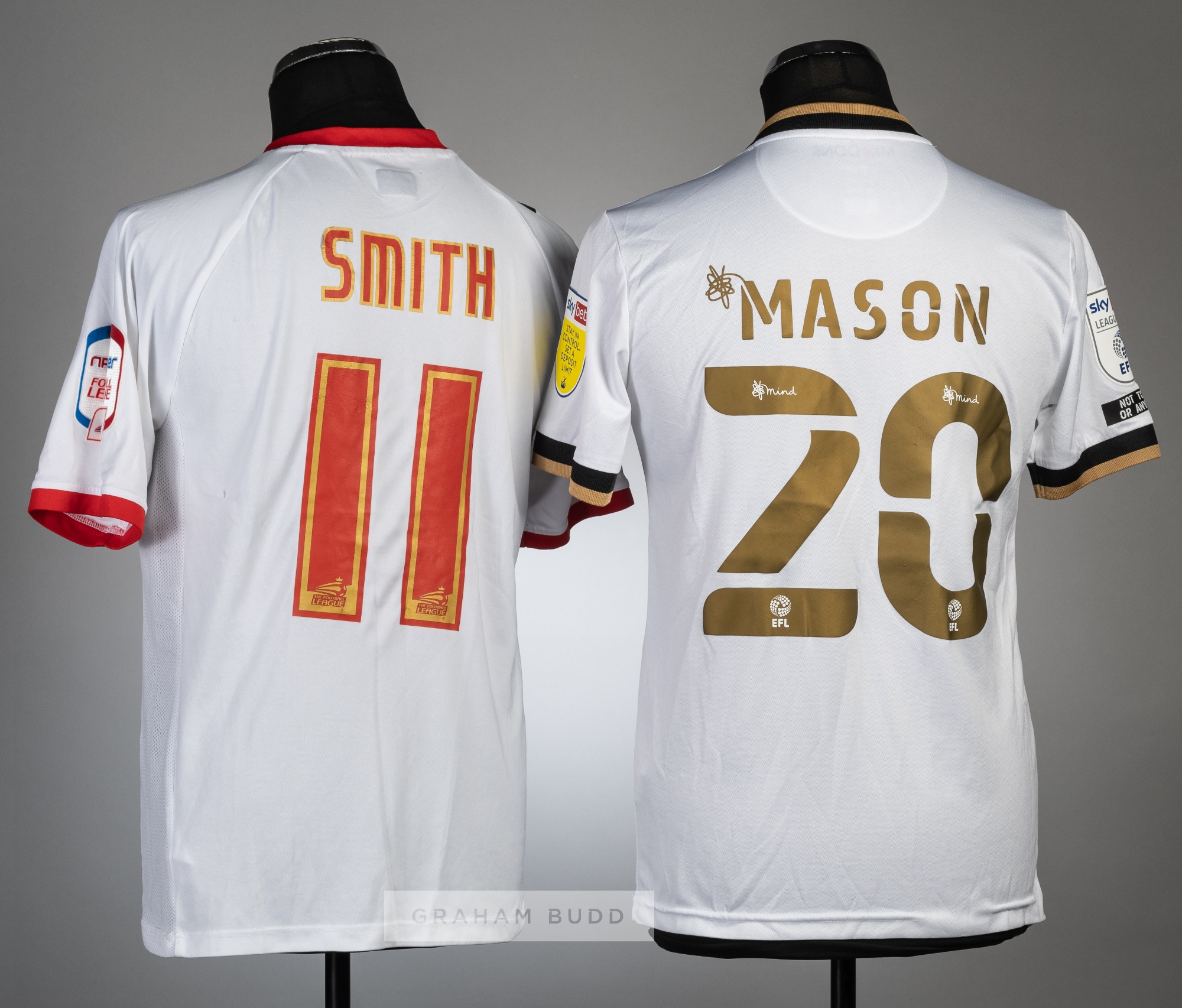 Two MK Dons jerseys, season's 2012-13 and 2020-21, comprising Alan Smith white and red no.11 home short-sleeved jersey, with NPOWER FOOTBALL LEAGUE sleeve badges, club crest and sponsor logo, reverse lettered SMITH and Joe Mason white, black and gold no.20 home short-sleeve jersey, with SKYBET STAY IN CONTROL. SET A DEPOSIT LIMIT sleeve badges, club crest and sponsor logo, reverse lettered MASON, (2)