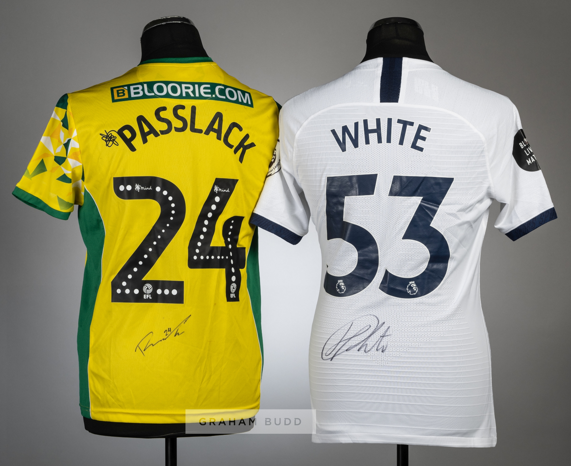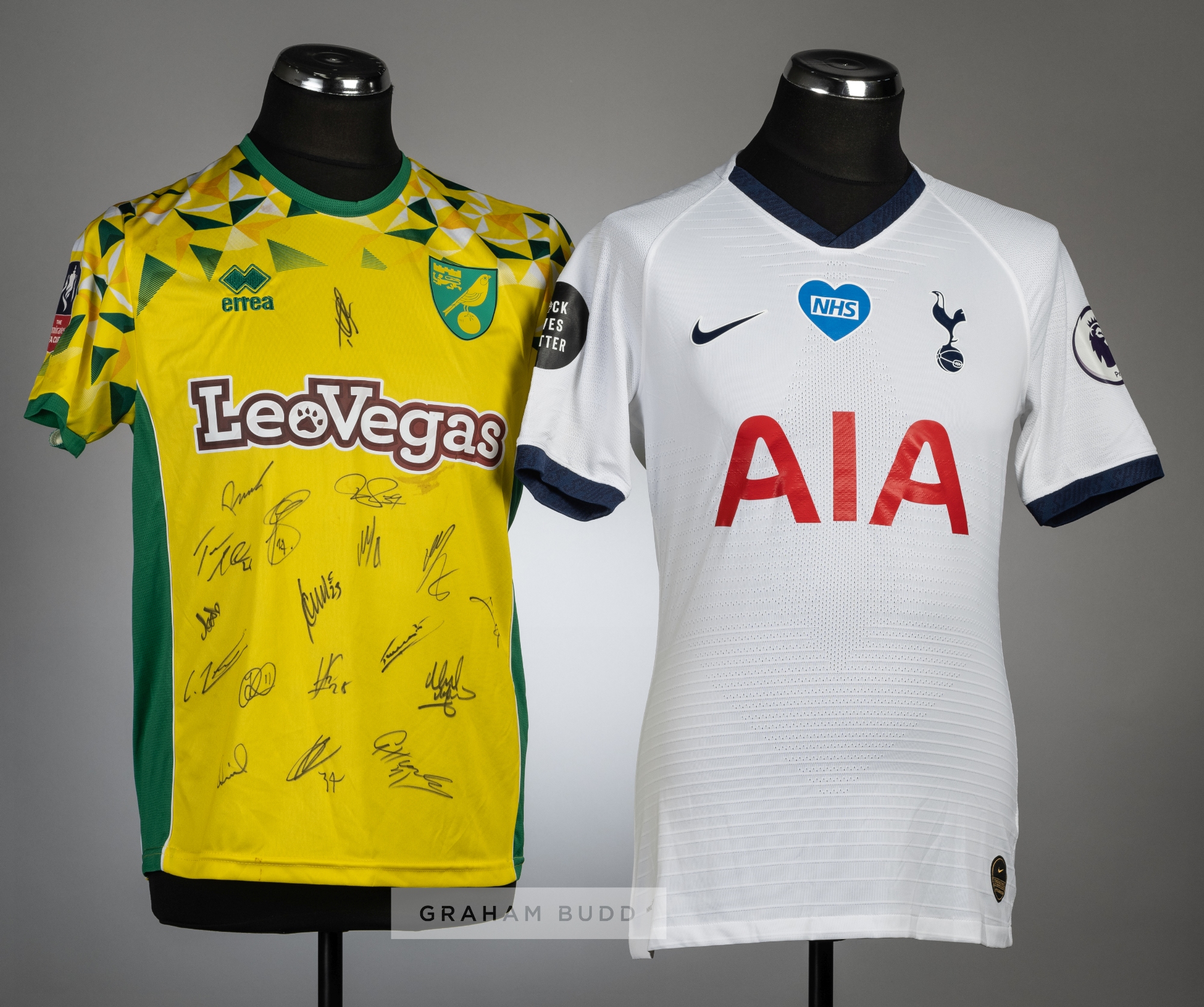 Felix Passlack squad-signed yellow and green Norwich City no.24 home jersey, season 2018-19, Errea, short-sleeved with THE EMIRATES FA CUP sleeve badge, club crest and sponsor logo, reverse lettered PASSLACK, signed by approximately 19 squad members in black marker pen on front and reverse, including Passlack Note: Lot only contains yellow & green Norwich City no.24 jersey in the photographs.