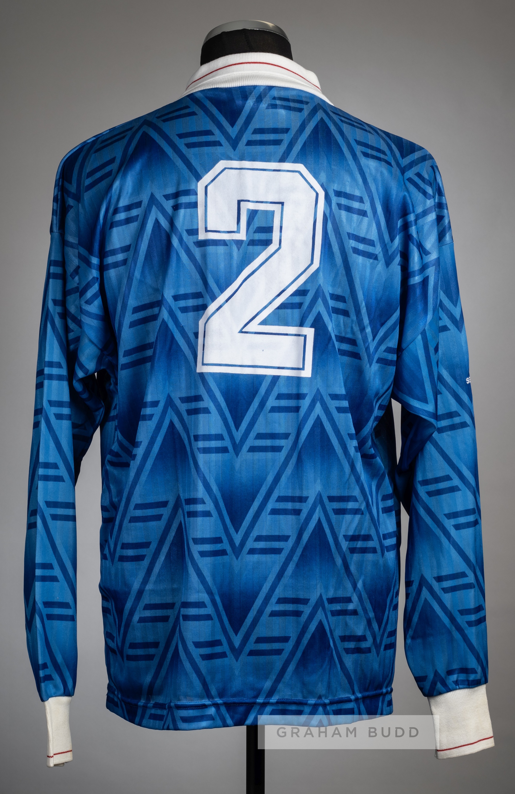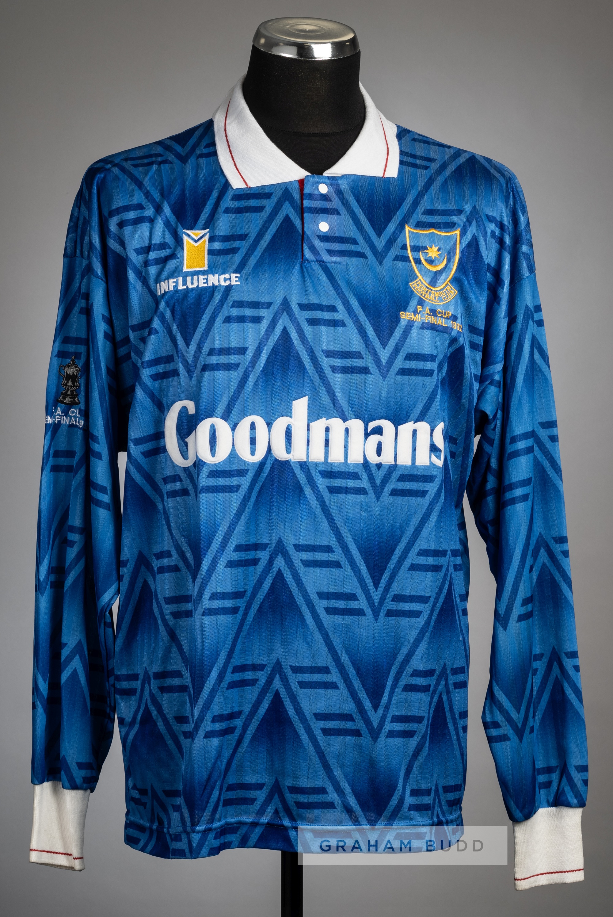 Andy Awford blue Portsmouth F.A. Cup Semi-final no.2 jersey v Liverpool at Highbury, 5th April 1992, Influence, unused long-sleeved spare, right sleeve embroidered with trophy cup and FA CUP SEMI-FINAL 1992, embroidered FA CUP SEMI-FINAL 1992, club crest and sponsor logo, reverse numbered 2 This fixture resulted in a 1-1 draw with Liverpool defeating Portsmouth 3-1 on penalties in the replay at Villa Park, 13th April 1992. Andy Awford wore a short-sleeved jersey in both the first semi-final on 5th April 1992 and replay on 13th April 1992.