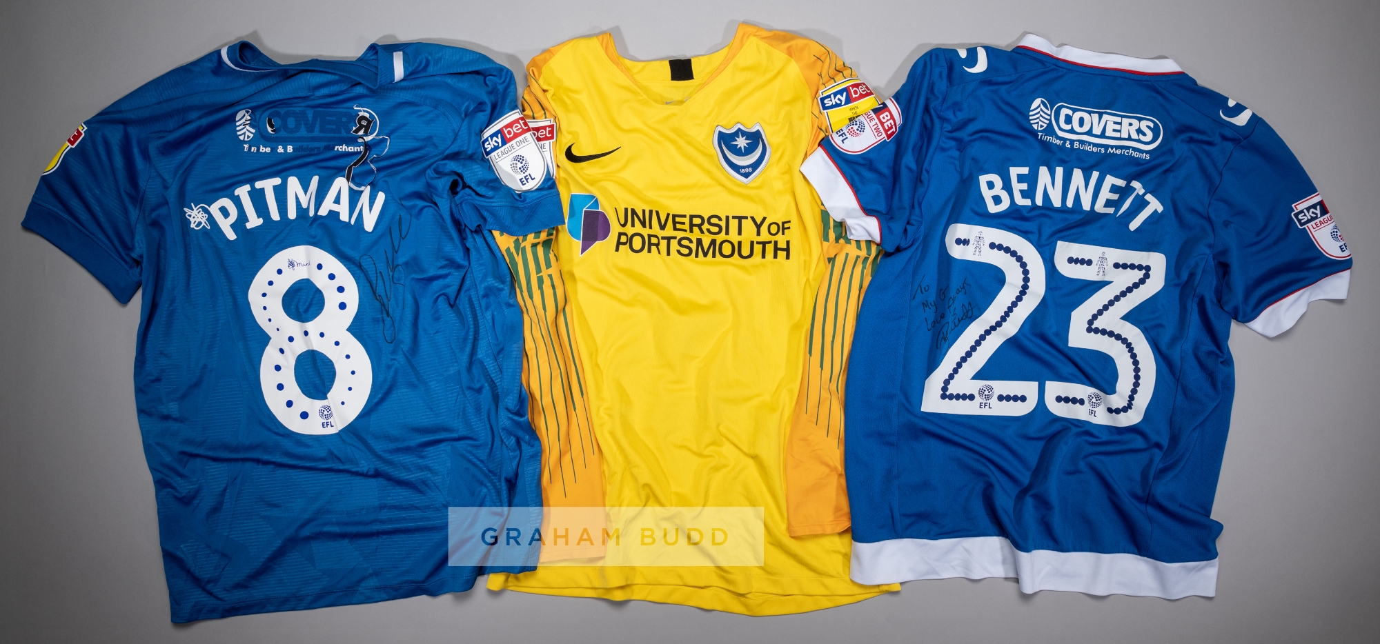 Three signed Portsmouth FC jerseys, comprising Alex Bass signed yellow and orange no.35 goalkeeper's away jersey, season 2019-20, long-sleeved with SKYBET WHEN THE FUN STOPS STOP sleeve badge, club crest and sponsor logo, reverse lettered BASS, signed in black marker pen on reverse; Kyle Bennett blue and white no.23 home jersey, season 2016-17, short-sleeved with SKYBET LEAGUE TWO EFL sleeve badges, club crest and sponsor logo, reverse lettered BENNETT, signed and dedicated in black marker pen to reverse TO MY G LOVE ALWAYS BENNETT 23; Brett Pitman blue and white no.8 home jersey, season 2018-19, short-sleeved with SKYBET WHEN THE FUN STOPS STOP sleeve badges, club crest and sponsor logo, reverse lettered PITMAN, signed in black marker pen on reverse, some lettering pealing from jersey; (3)