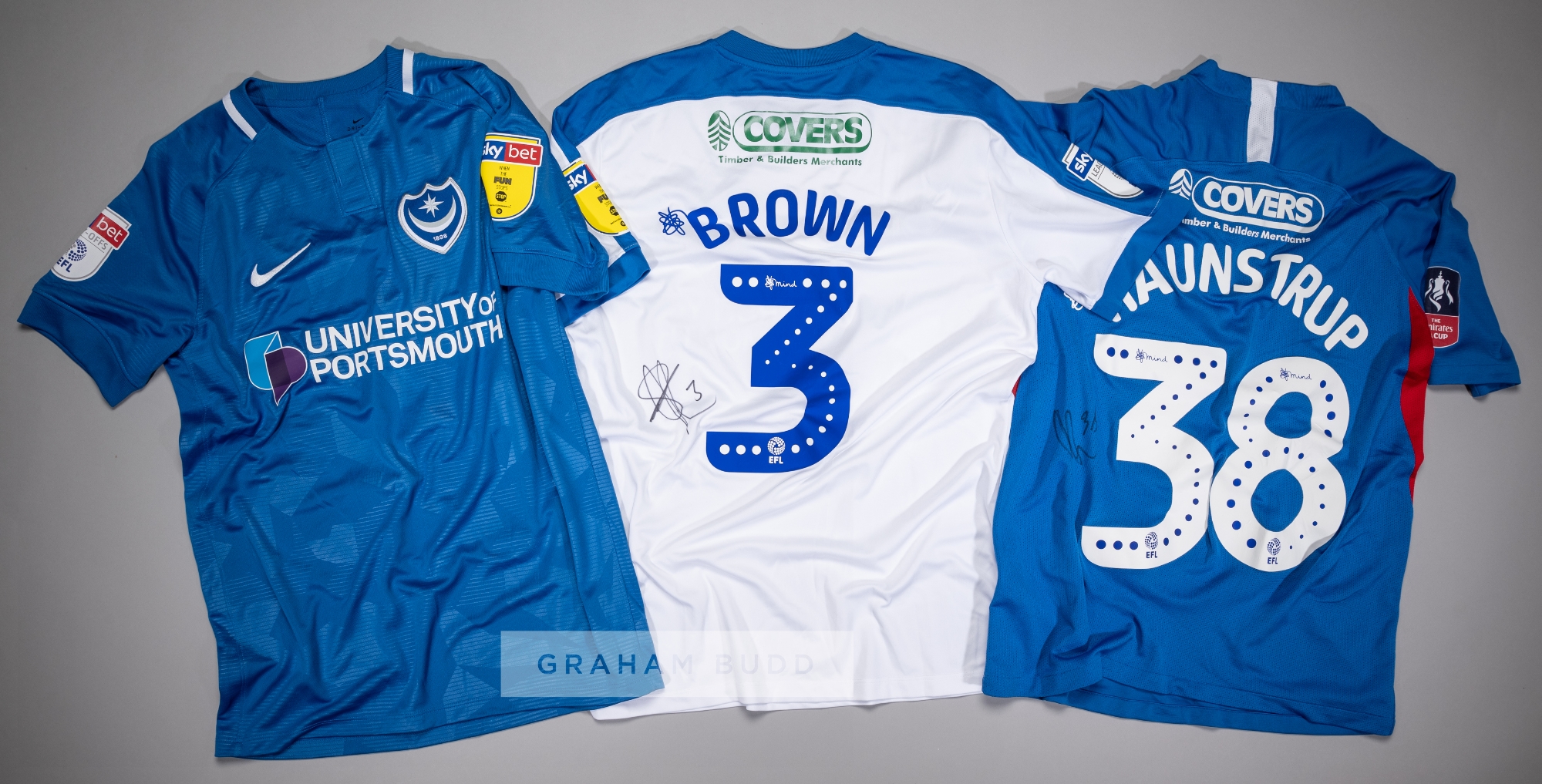 Three signed Portsmouth FC jersey's, comprising Gareth Evans blue and white no.26 home jersey, season 2018-19, short-sleeved with SKYBET WHEN THE FUN STOPS STOP sleeve badges, club crest and sponsor logo, reverse lettered EVANS, signed in black marker pen to reverse; Brandon Haunstrup blue and white no.38 home jersey, season 2019-20, short-sleeved with THE EMIRATES FA CUP sleeve badge, club crest and sponsor logo, reverse lettered HAUNSTRUP, signed in black marker pen to reverse; Lee Brown white and blue no.3 away jersey, season 2018-19, short-sleeved with SKYBET WHEN THE FUN STOPS STOP sleeve badges, club crest and sponsor logo, reverse lettered BROWN, signed in black marker pen to reverse, (3)