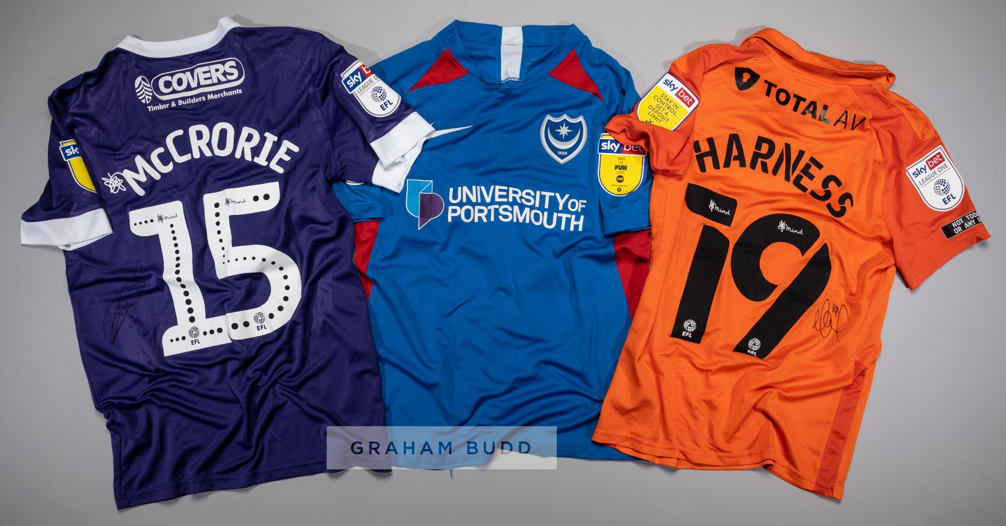 Three signed Portsmouth FC jersey's, comprising Marcus Harness orange no.19 third change jersey, season 2020-21, short-sleeved with SKYBET STAY IN CONTROL. SET A DEPOSIT LIMIT sleeve badges, club crest and sponsor logo, reverse lettered HARNESS, signed in black marker pen to reverse; Ross McCrorie purple no.15 third choice jersey, season 2019-20, short-sleeved with SKYBET WHEN THE FUN STOPS STOP sleeve badges, club crest, sponsor logo, reverse lettered MCCRORIE, signed in black marker pen on reverse; Sean Raggett blue and white no.20 home jersey, season 2019-20, short-sleeved with SKYBET WHEN THE FUN STOPS STOP sleeve badges, club crest and sponsor logo, reverse lettered RAGGETT, signed in black marker pen to reverse, (3)