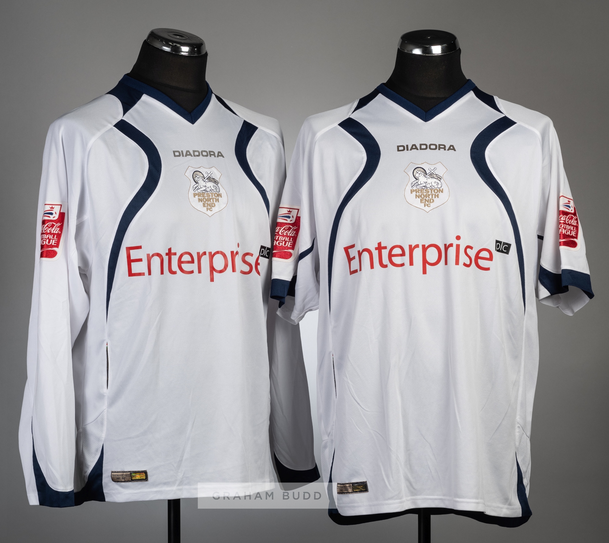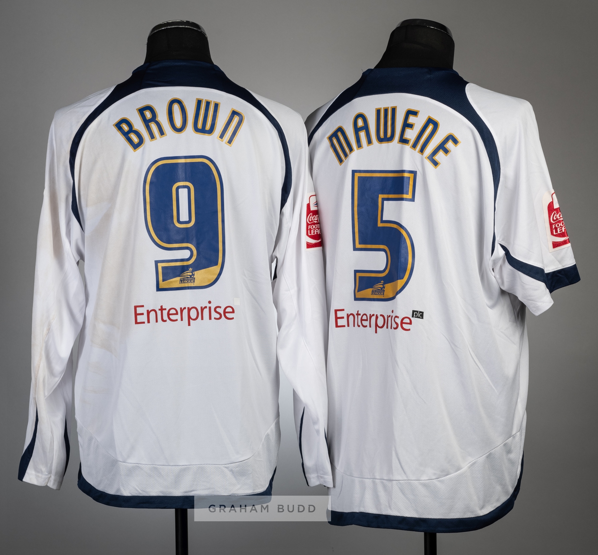 Two Preston North End white and navy home jersey's, season 2007-08, comprising Youl Mawene no.5 short-sleeved jersey, with COCA COLA FOOTBALL LEAGUE sleeve badges, club crest and sponsor logo, reverse lettered MAWENE and Chris Brown no.9 long-sleeved jersey, with with COCA COLA FOOTBALL LEAGUE sleeve badges, club crest and sponsor logo, reverse lettered BROWN, (2)