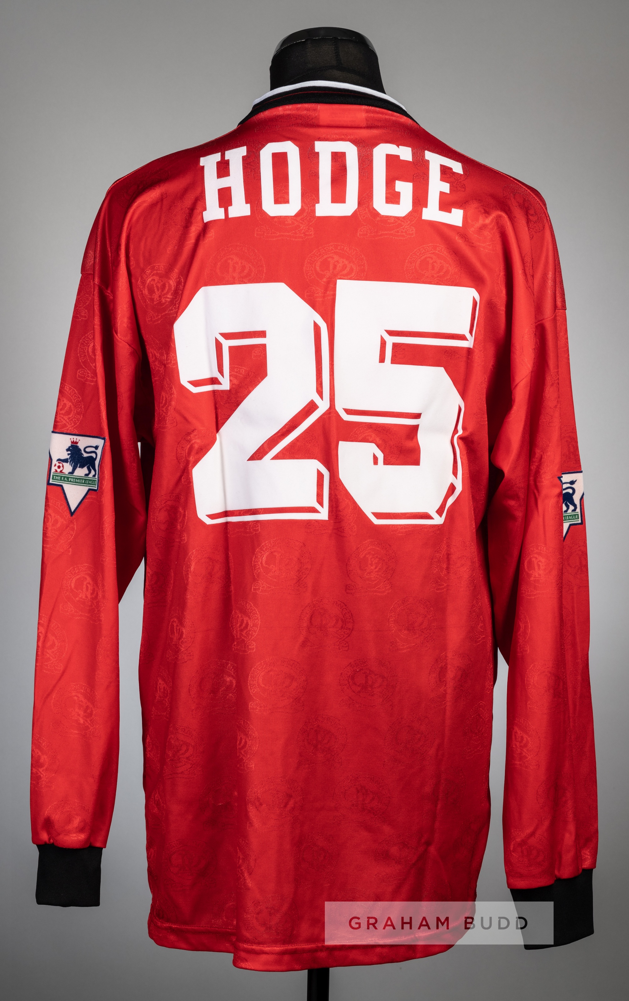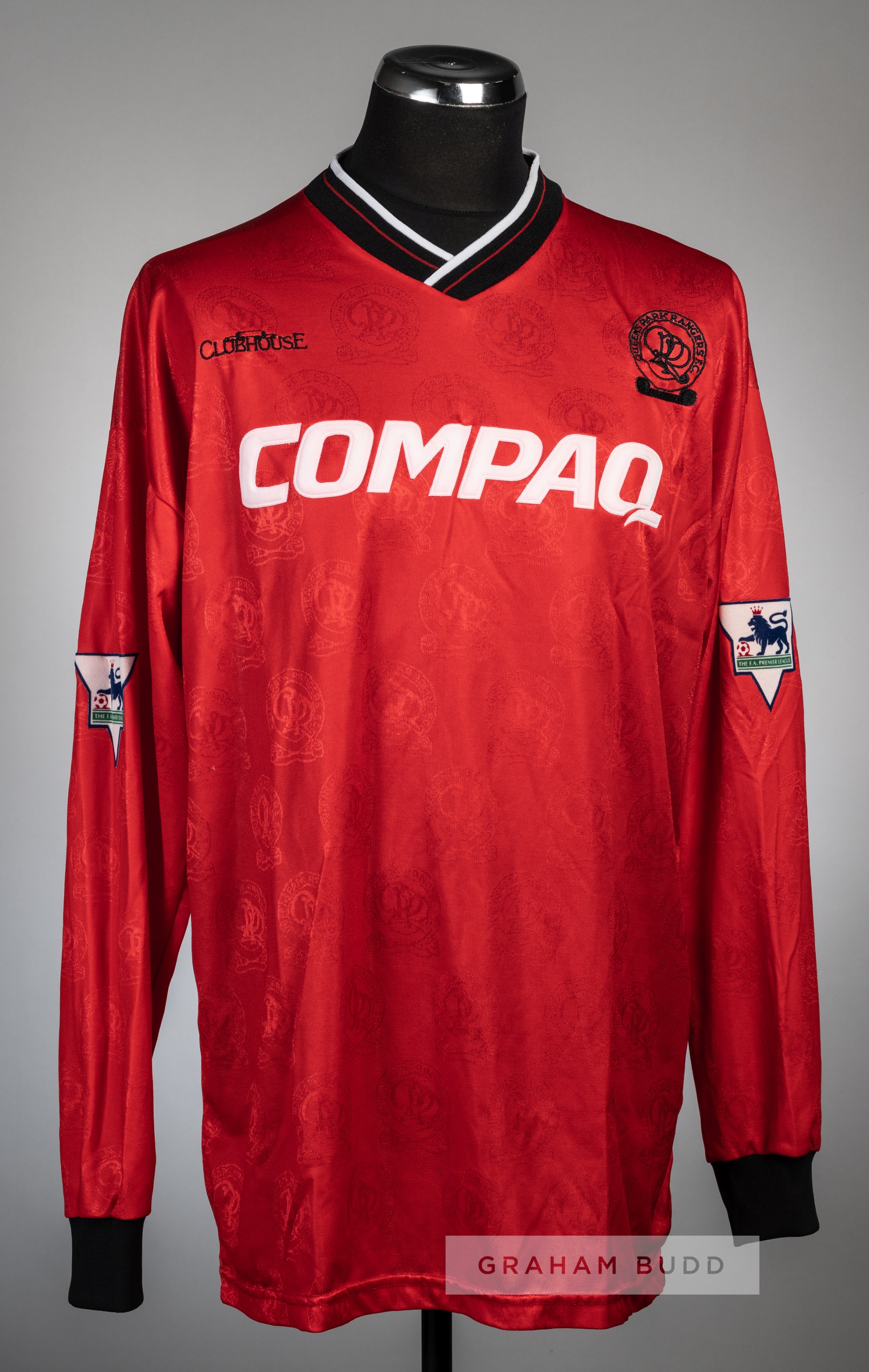 Steve Hodge red Queen's Park Rangers No.25 away jersey, season 1994-95, Clubhouse, long-sleeved, Premier League badges, reverse lettered HODGE Steve Hodge signed from Leeds United on 28th October 1994 for £300,000. This was manager Gerry Francis's last signing before his move across London to Tottenham Hotspur.