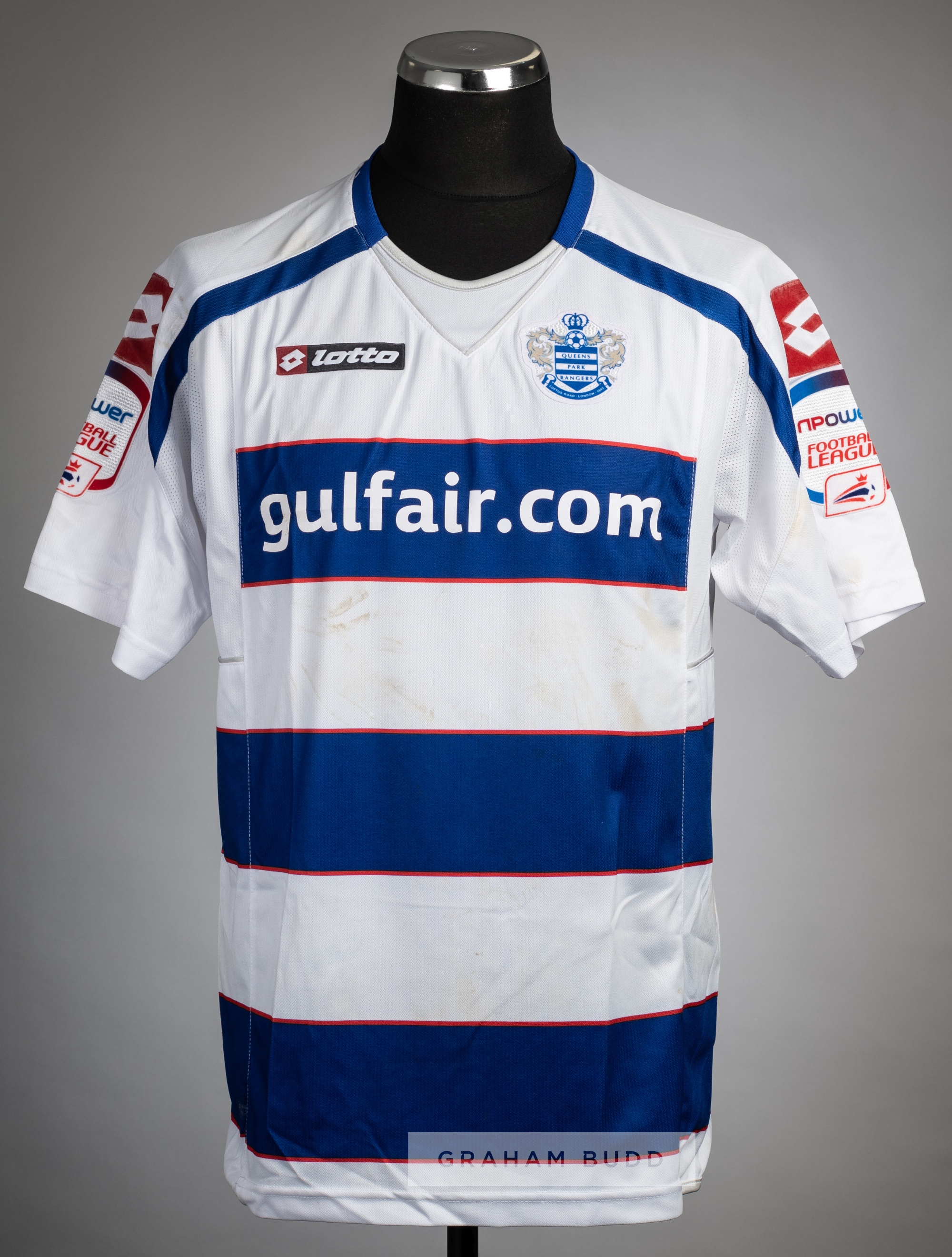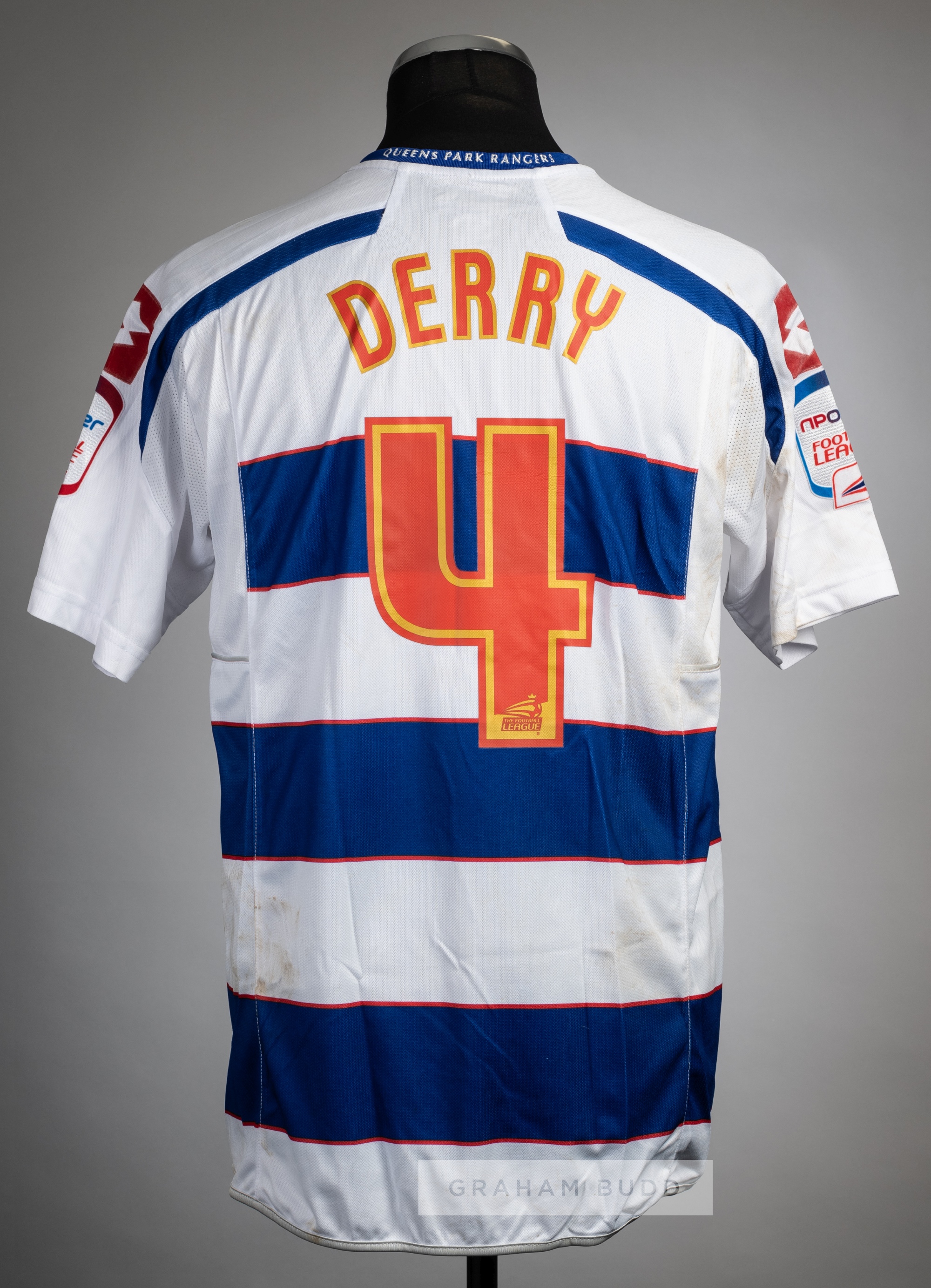 Shaun Derry Queen's Park Rangers no.4 home jersey v Portsmouth at Kiyan Prince Foundation Stadium, 1st February 2011, Lotto, short-sleeved with NPOWER FOOTBALL LEAGUE sleeve badges, club crest badge, Lotto and sponsor logo's, reverse lettered DERRY, signs of dirt marks on jersey front and back Queen's Park Rangers defeated Portsmouth 2-0. Shaun Derry played with Queen's Park Ranger during 2010-13, making 92 appearances, scoring one goal.