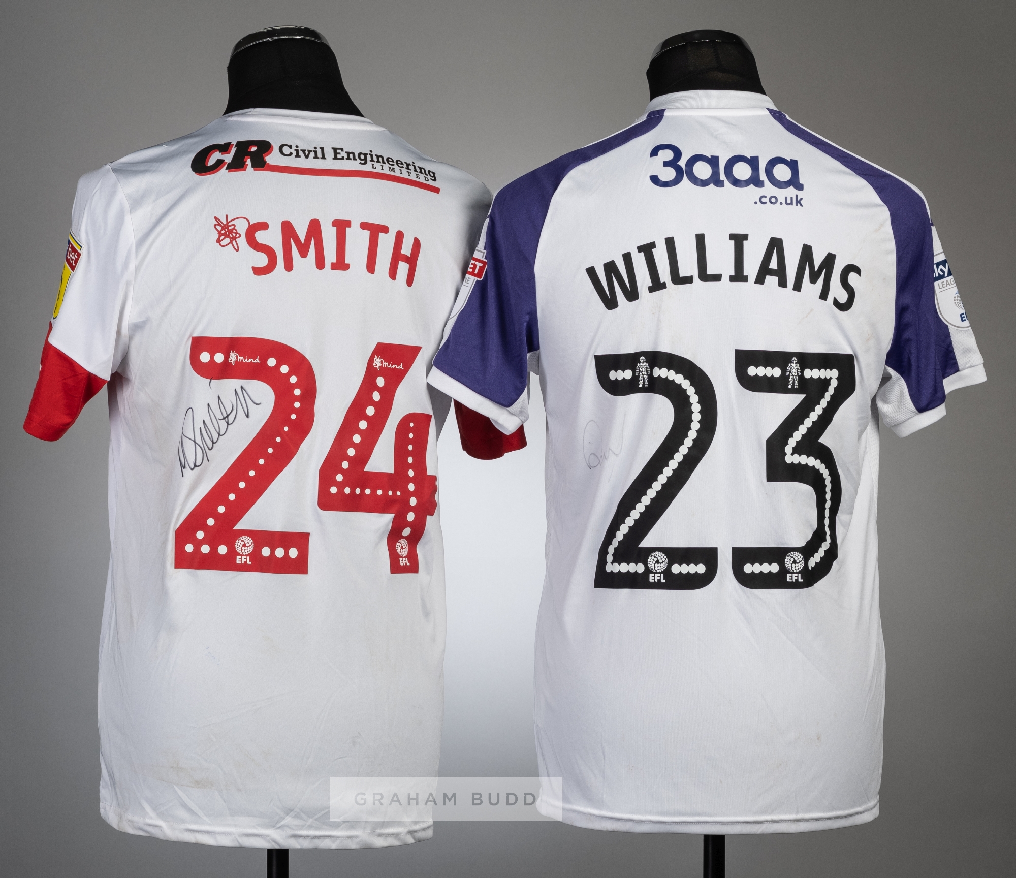 Two signed Rotherham United jerseys, season's 2017-18 and 2019-20, comprising Ryan William signed white and purple no.23 away short-sleeved jersey, with SKYBET LEAGUE ONE EFL sleeve badges, club crest and sponsor logo, reverse lettered WILLIAMS, signed in silver marker pen to reverse and Michael Smith signed white and red no.24 short-sleeved jersey, with SKYBET WHEN THE FUN STOPS STOP sleeve badges, club crest and sponsor logo, reverse lettered SMITH, signed in black marker pen to reverse, (2)