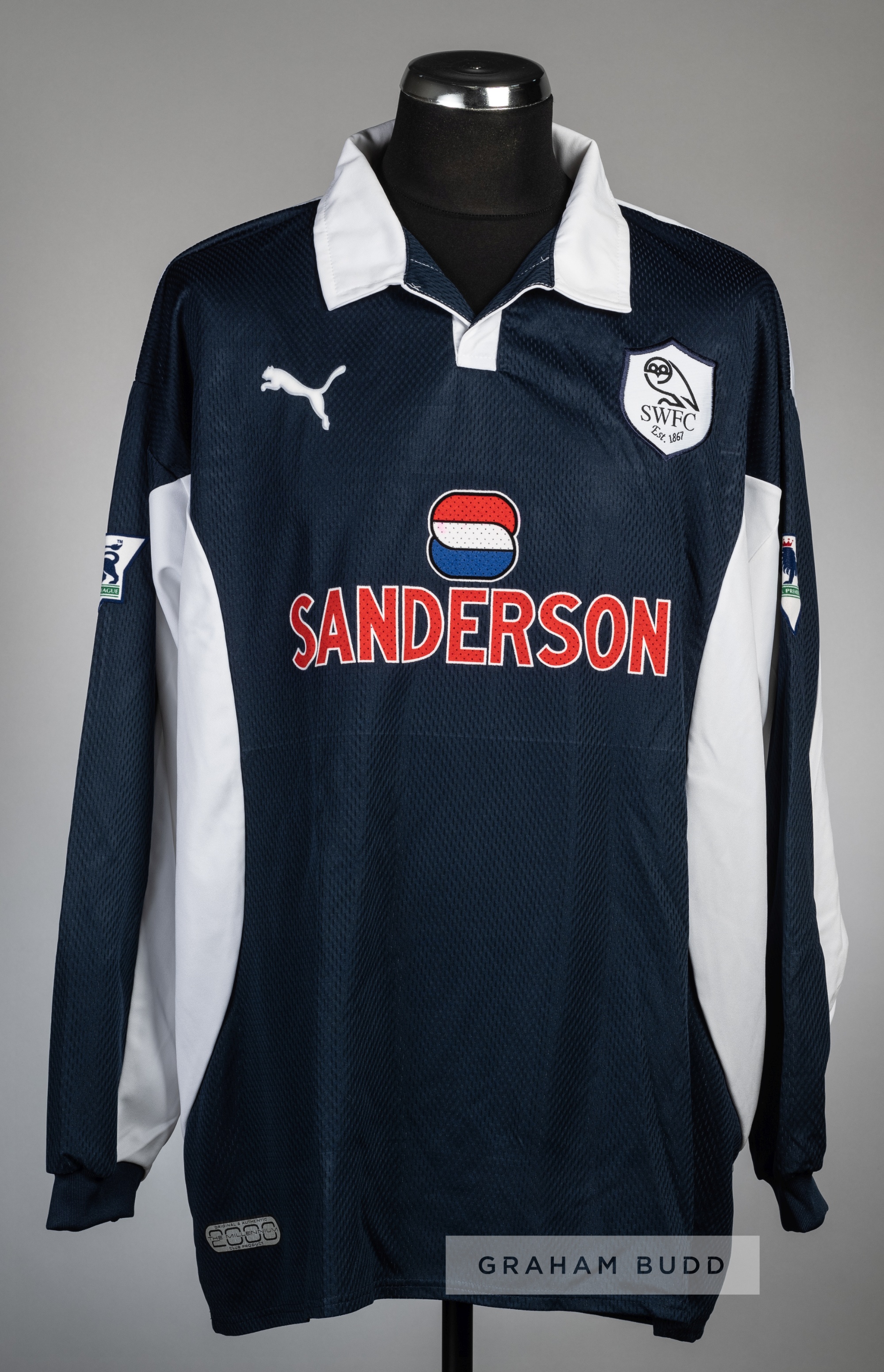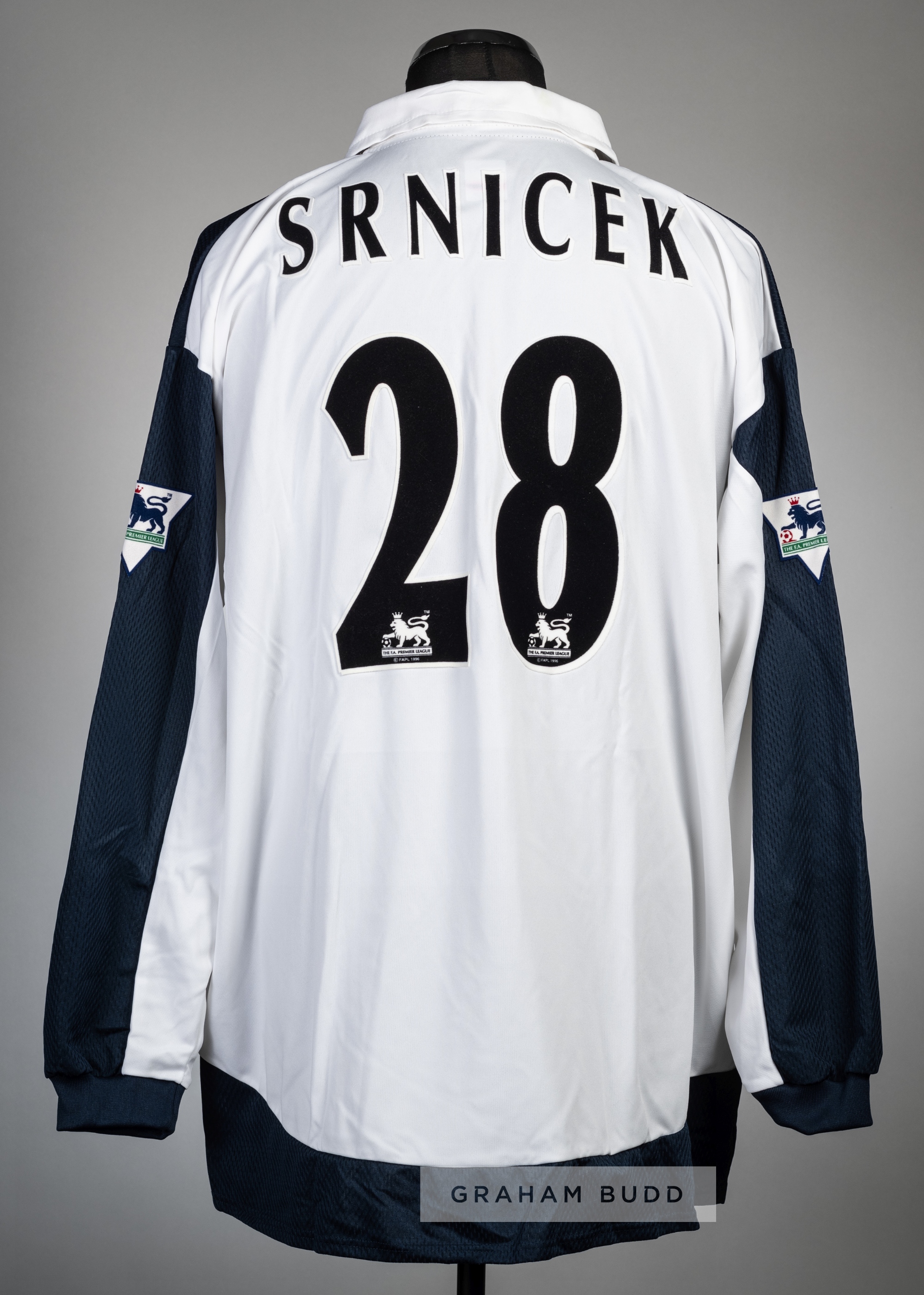 Pavel Srnicek blue and white Sheffield Wednesday No. 28 goalkeeper's jersey, season 1998-99, Puma, long-sleeved, Premier League badges, the reverse lettered SRNICEK