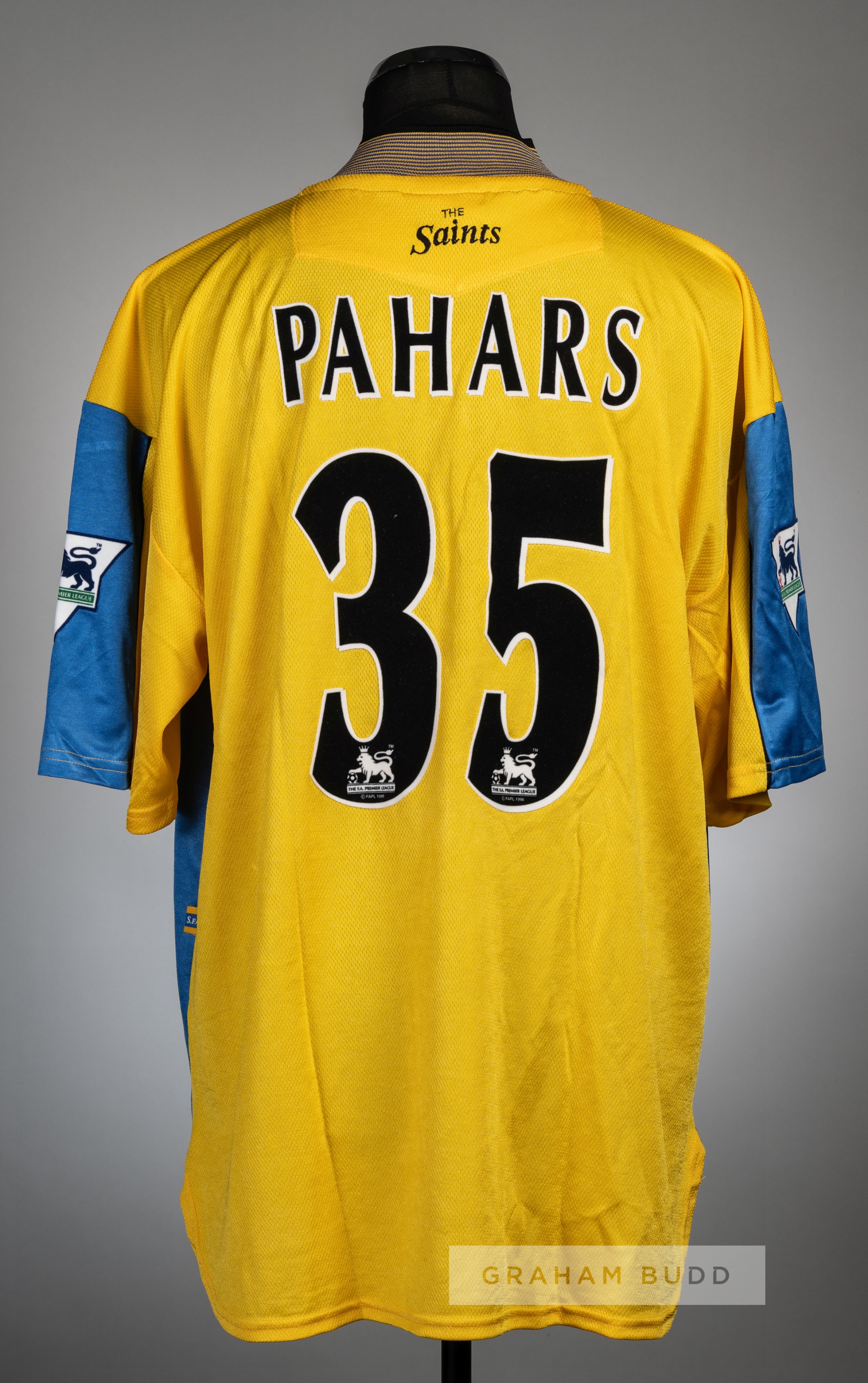 Marians Pahars yellow Southampton No.35 away jersey, season 1998-99, Pony, short-sleeved, Premier League badges, the reverse lettered PAHARS