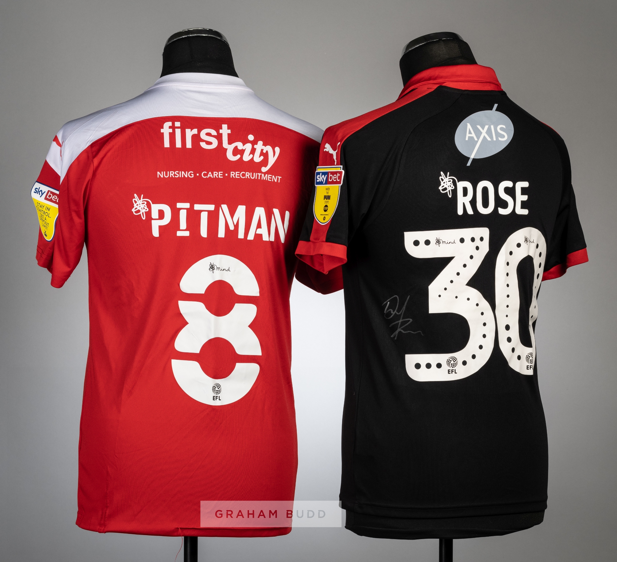 Two Swindon Town FC jerseys, seasons 2018-19 and 2020-21, comprising Danny Rose signed black and red no.30 away short-sleeved jersey, with SKYBET LEAGUE ONE EFL sleeve badges, club crest and sponsor logo, reverse lettered ROSE, signed in silver marker pen on reverse and Brett Pitman red and white no.8 short-sleeved jersey, with SKYBET STAY IN CONTROL. SET A DEPOSIT LIMIT, club crest and sponsor logo, reverse lettered PITMAN, (2)