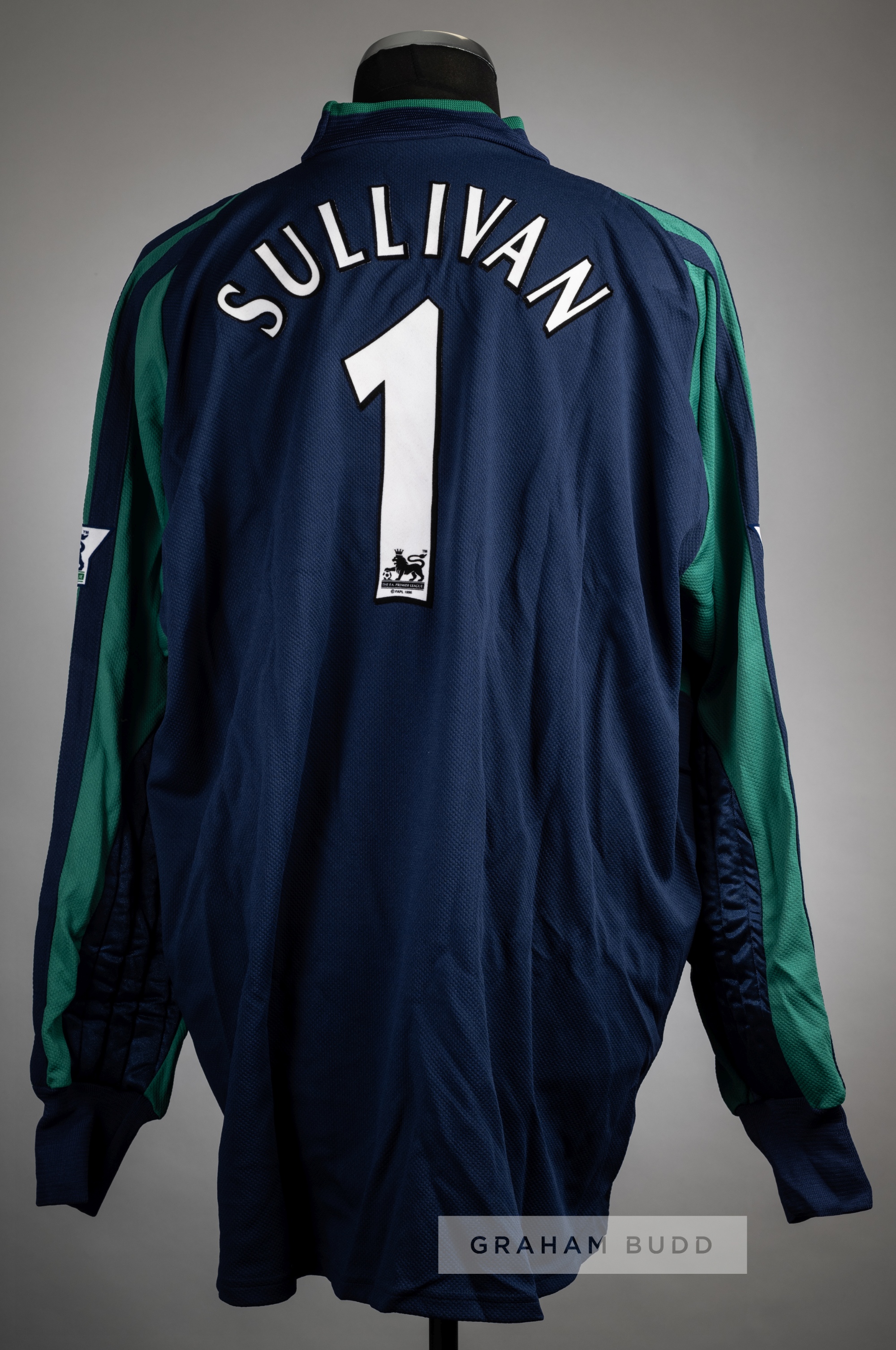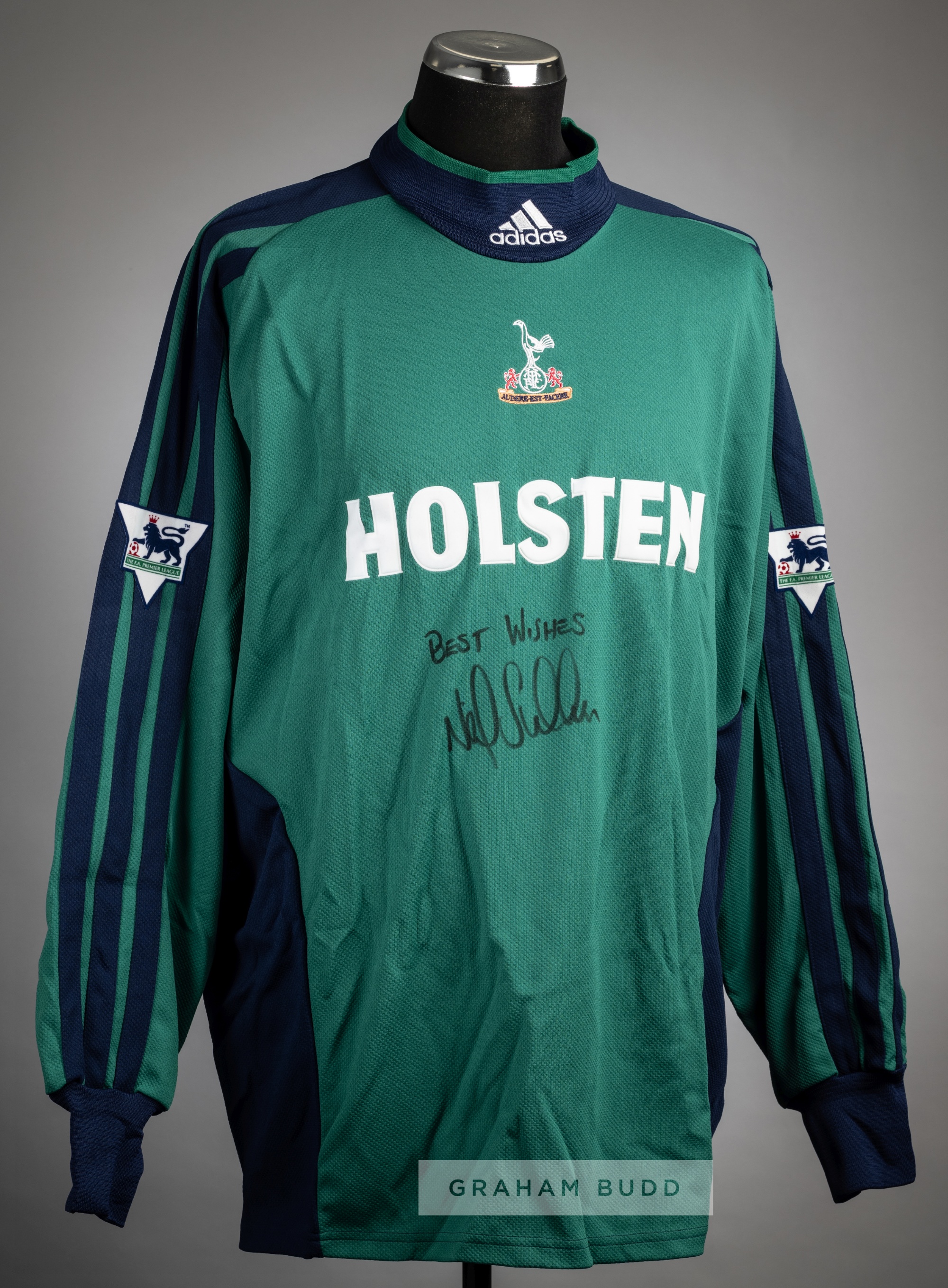 Neil Sullivan signed green and navy Tottenham Hotspur no.1 goalkeeper's home jersey, season 2001-02, Adidas, long-sleeved with THE FA PREMIER LEAGUE