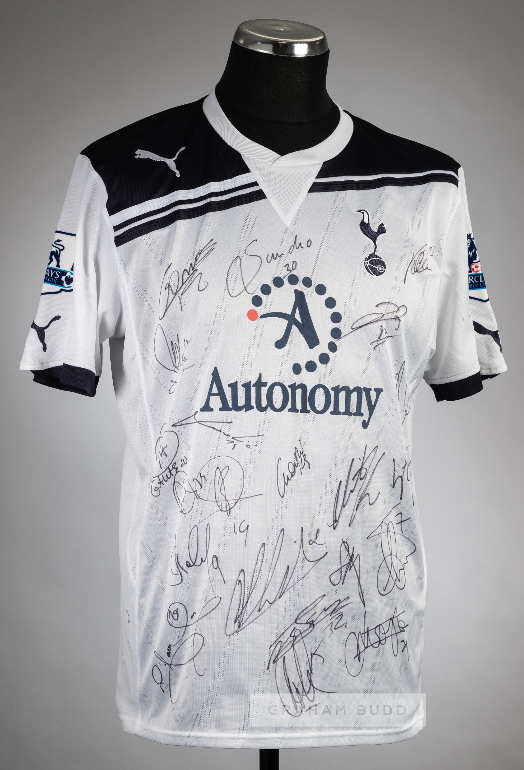 Squad signed Wilson Palacios white Tottenham Hotspur no.12 home jersey, season 2010-11, Puma, short-sleeved with BARCLAYS PREMIER LEAGUE sleeve badges, club crest and sponsor logo, reverse lettered PALACIOS, signed in black marker pen by approximately 21 squad members including Sandro, Cudicini, Dawson, Pavlyuchenko, Lennon and many more