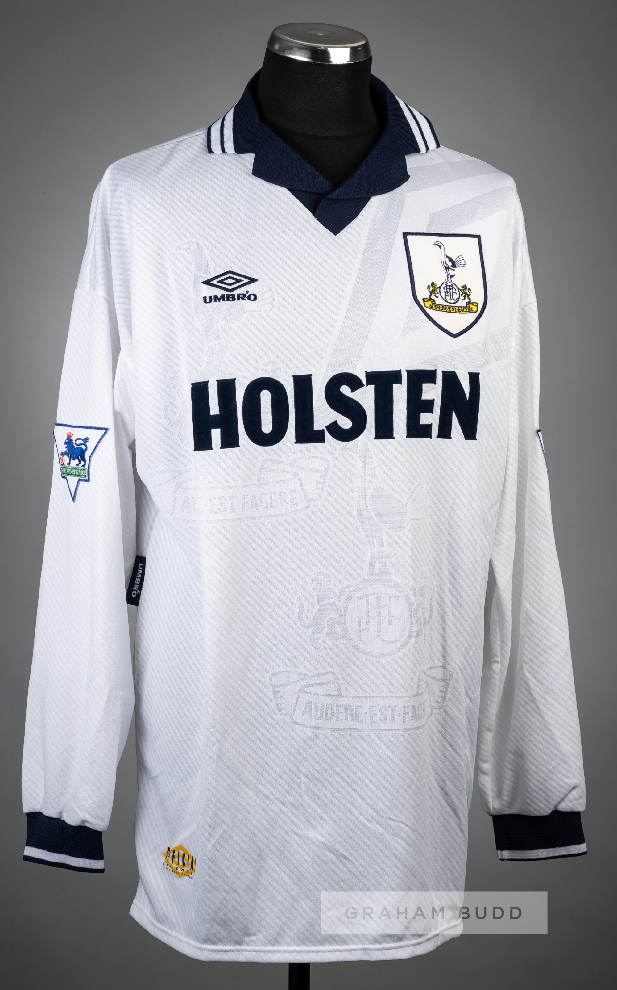 Stuart Nethercott white Tottenham Hotspur no.26 home jersey, season 1993-94, Umbro, long-sleeved with THE FA PREMIER LEAGUE sleeve badges, club cres