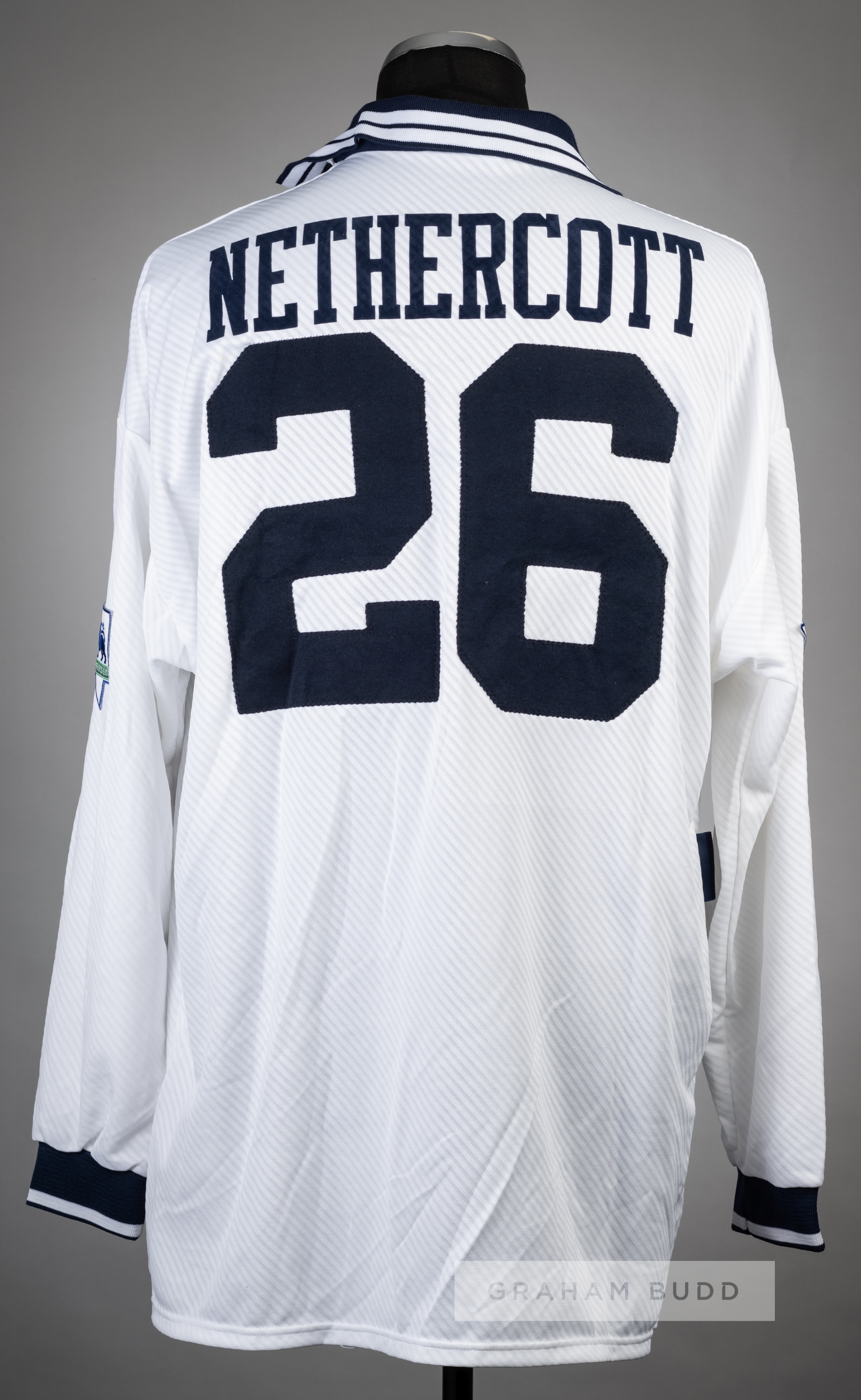 Stuart Nethercott white Tottenham Hotspur no.26 home jersey, season 1993-94, Umbro, long-sleeved with THE FA PREMIER LEAGUE sleeve badges, club crest and sponsor logo, reverse lettered NETHERCOTT