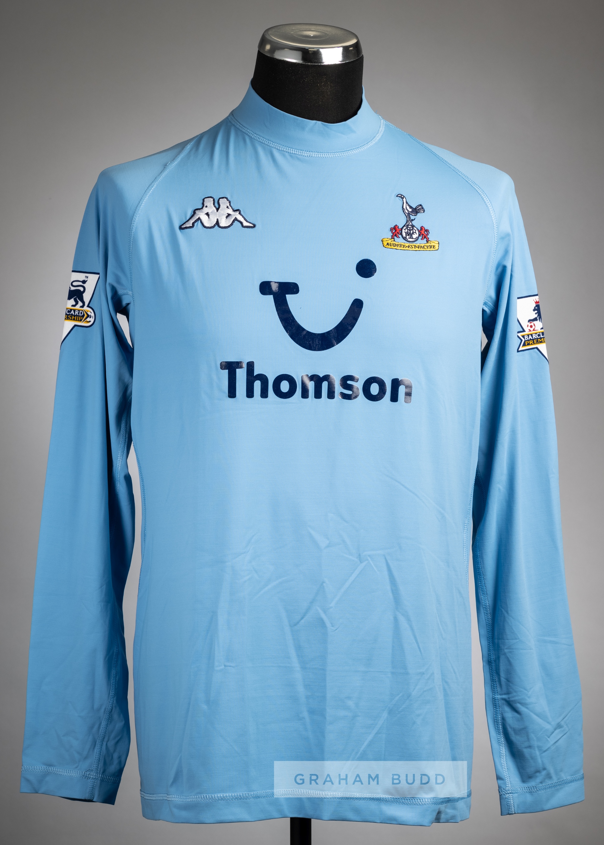 Gus Poyet blue Tottenham Hotspur no.14 away jersey, season 2003-04, Kappa, long-sleeved with BARCLAYCARD PREMIRSHIP sleeve badges, club crest and sponsor logo, reverse lettered POYET, sponsor lettering on front is tacky