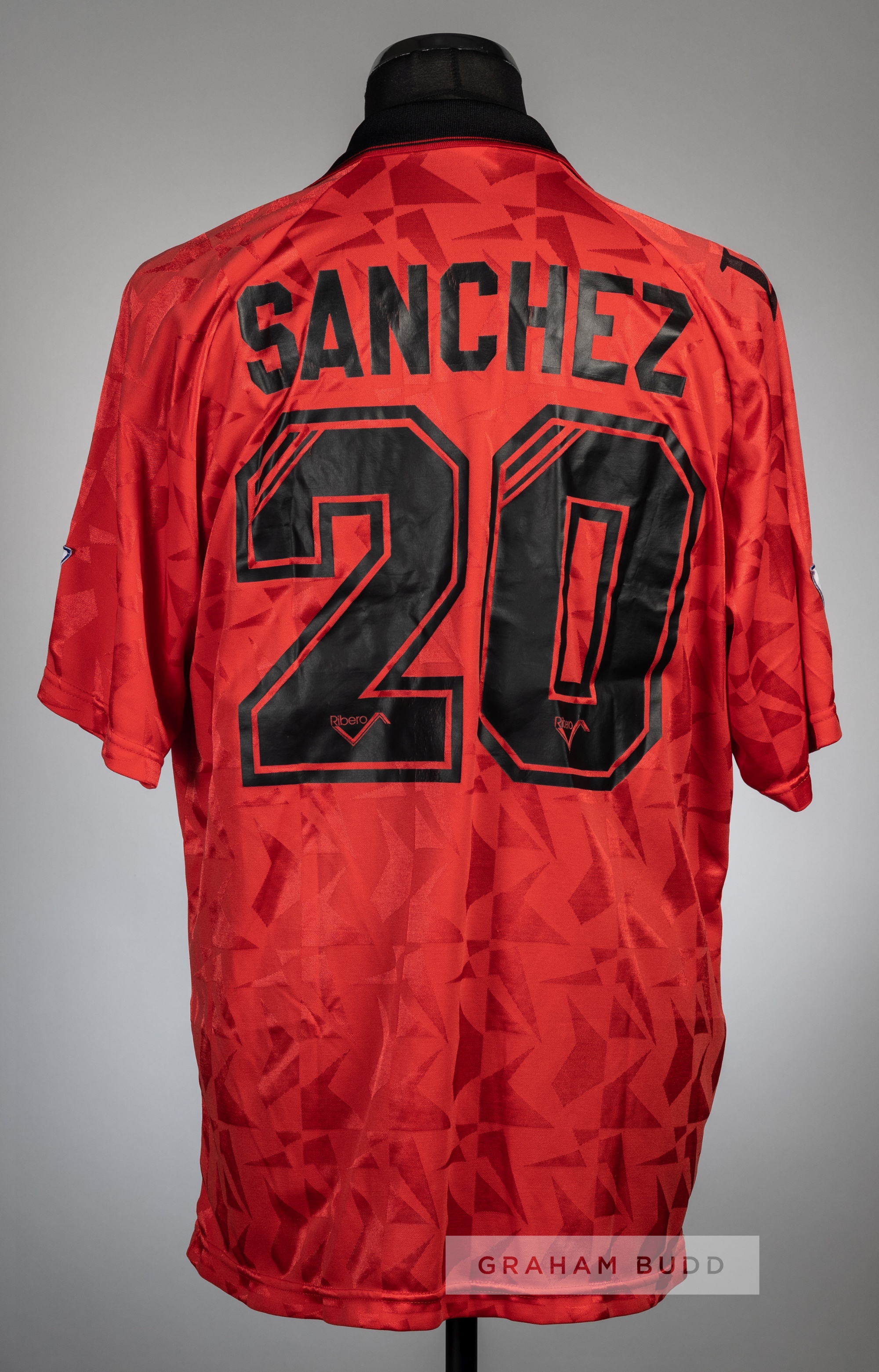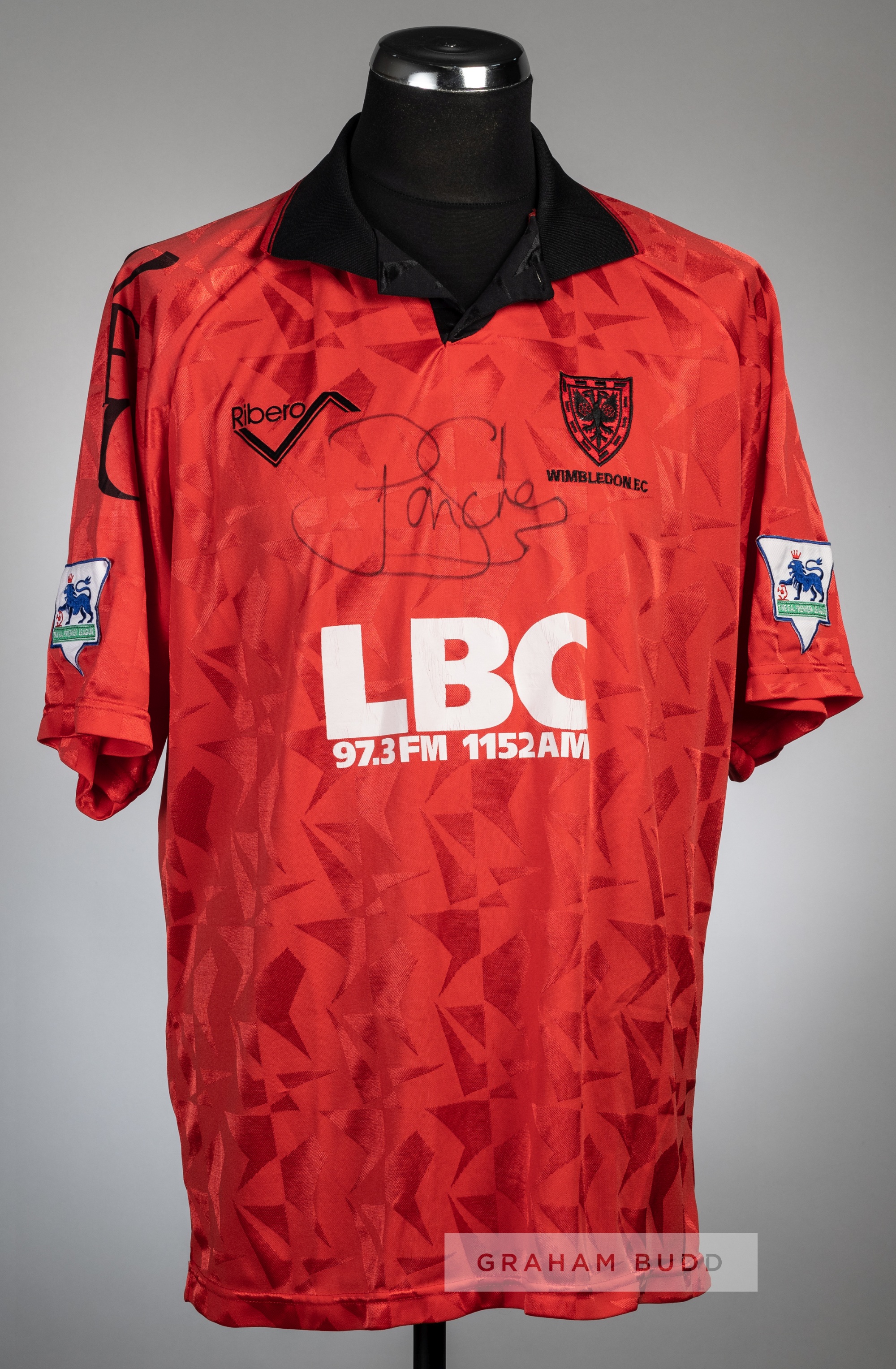 Lawrie Sanchez signed red Wimbledon no.20 away jersey, season 1993-94, Ribero, short-sleeved with THE FA PREMIER LEAGUE sleeve badges, club crest and sponsor logo, reverse lettered SANCHEZ, signed to the front in black marker pen Provenance: signed on Wimbledon compliment slip by Syd Neal, kit manager, dated 12/4/94.