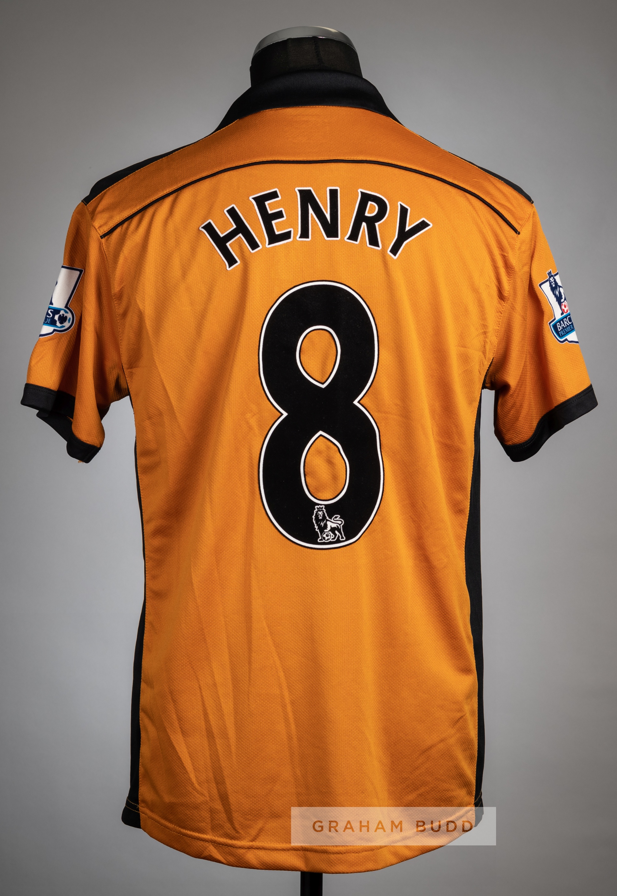 Karl Henry orange Wolverhampton Wanderers No.8 home jersey v Arsenal at Molineux Stadium, 10th November 2010, Burrda, short-sleeved with BARCLAYS PREMIER LEAGUE sleeve badges, club crest badge, Burrda and sponsor logo, reverse lettered HENRY Arsenal defeated Wolves 2-0. Karl Henry played for Wolverhampton Wanderers during 2006-13, making 250 appearances scoring six goals.