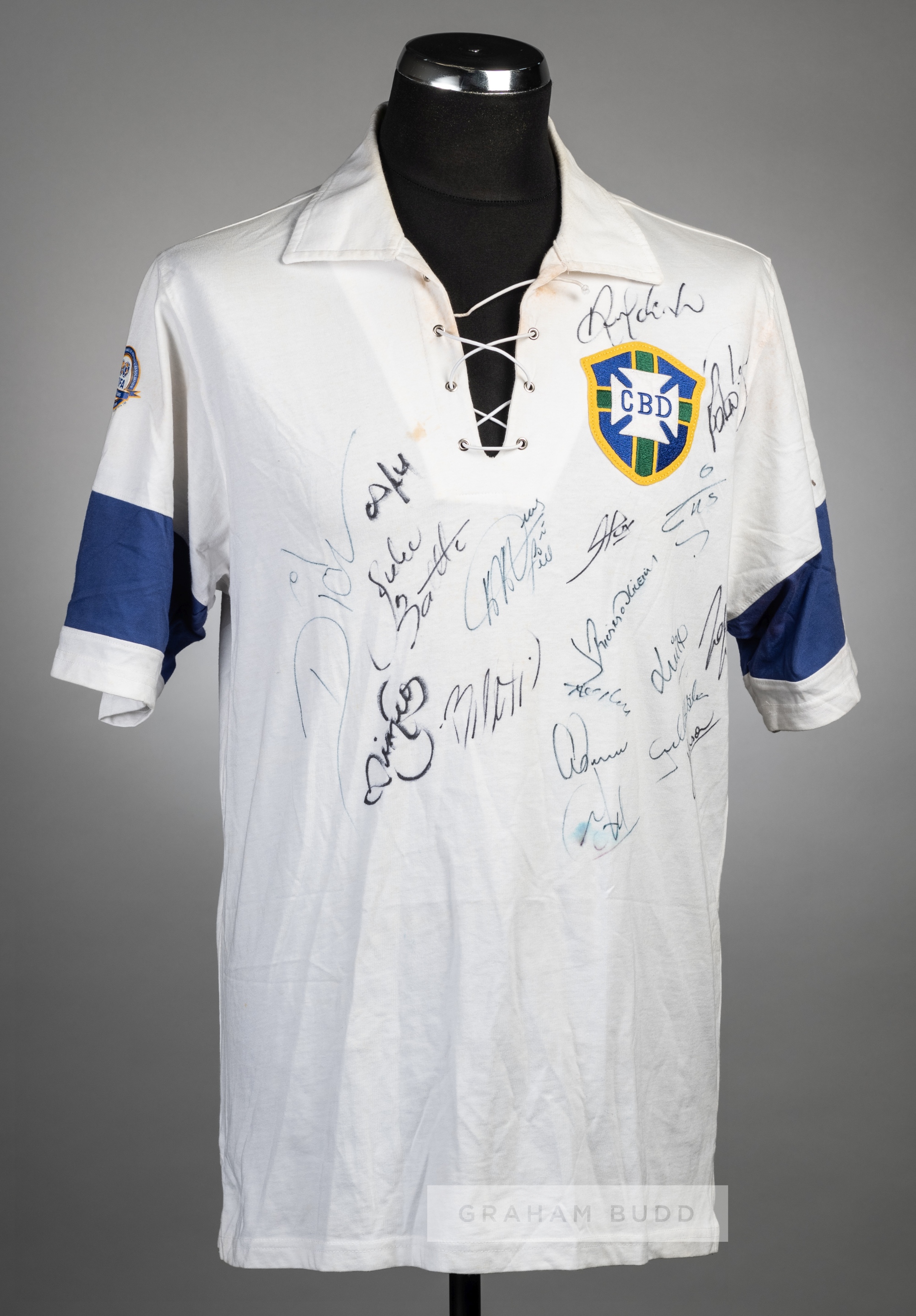 Team signed Ricardo Kaka white Brazil no.8 jersey commemorating the 100th anniversary of FIFA v France played at Saint Denis on 20th May 2004, short sleeved with FIFA 100 YEARS badge and country emblem badge, reverse numbered 8, signed in marker pen by approx. 17 players, including Dida, Cafu, Ronaldinho, Luisao and others This fixture resulted in a 0-0 draw.