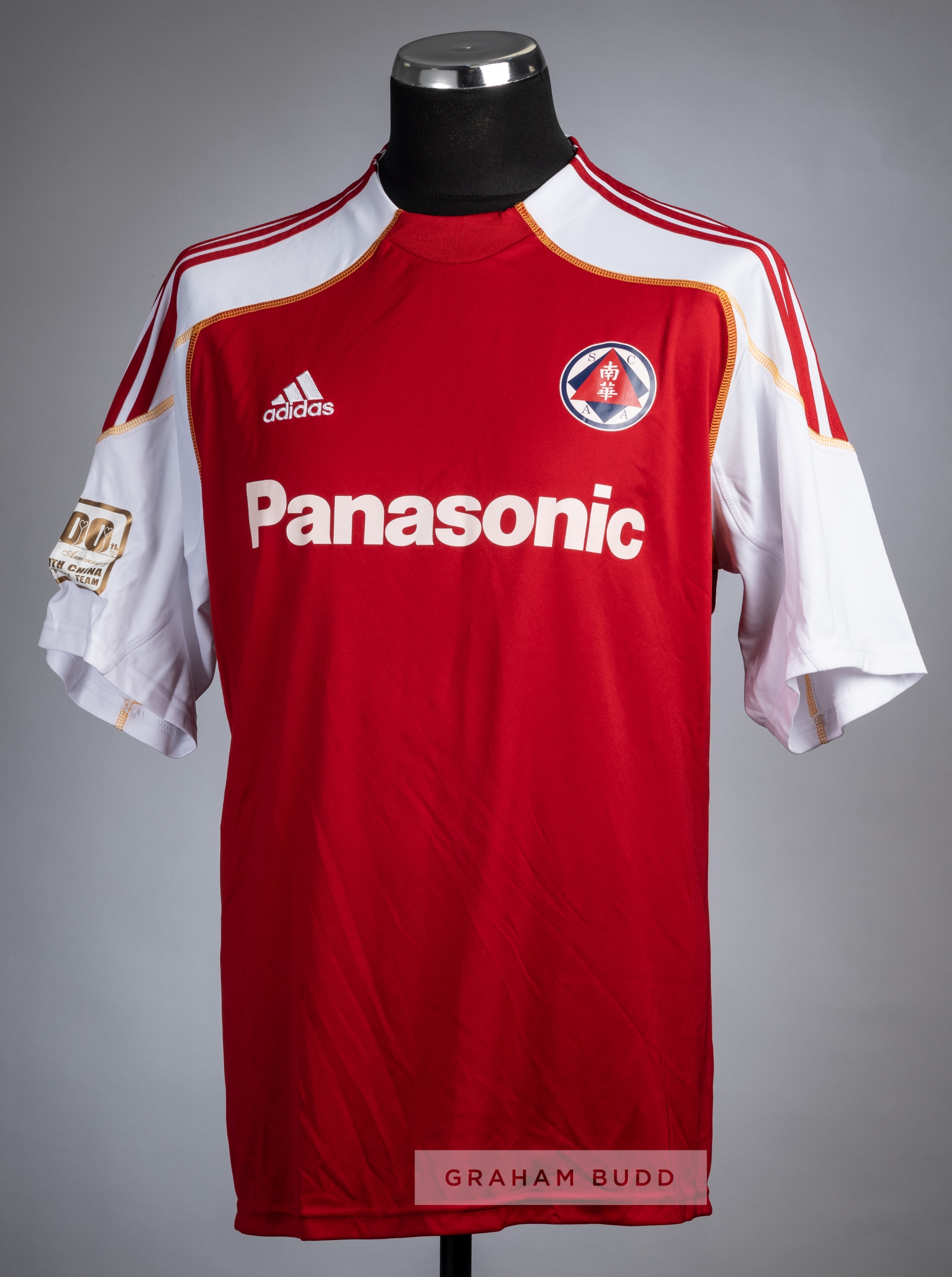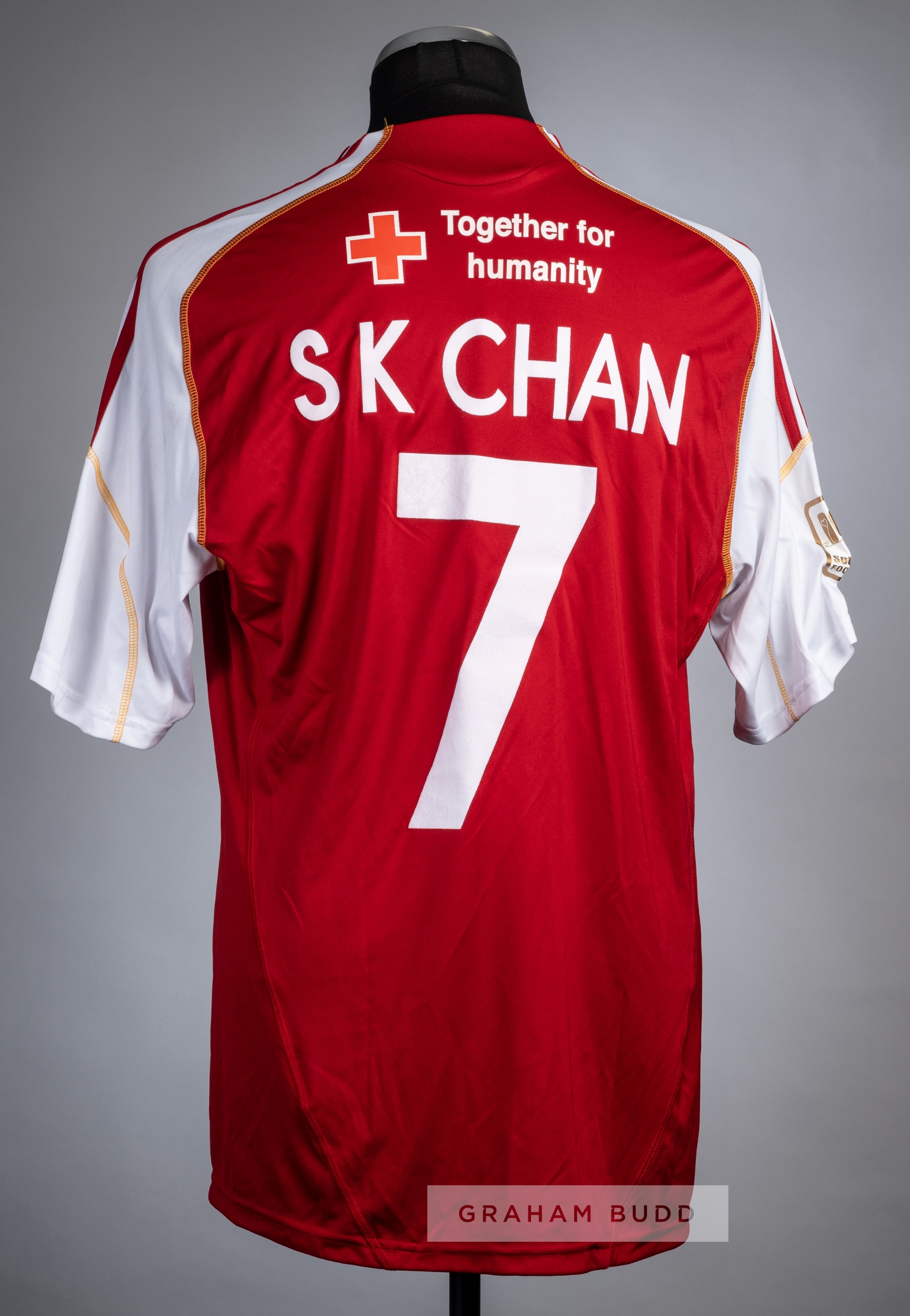 S K Chan red & white South China AA No.7 jersey from the Barclays Asia Trophy v Tottenham Hotspur, 2nd August 2009, Adidas, short-sleeved with SOUTH CHINA FOOTBALL TEAM sleeved badge, club crest, Adidas and sponsor logo's, reverse lettered SK CHAN South China defeated Tottenham Hotspur 2-0, with Chan Siu Ki scoring the first goal.